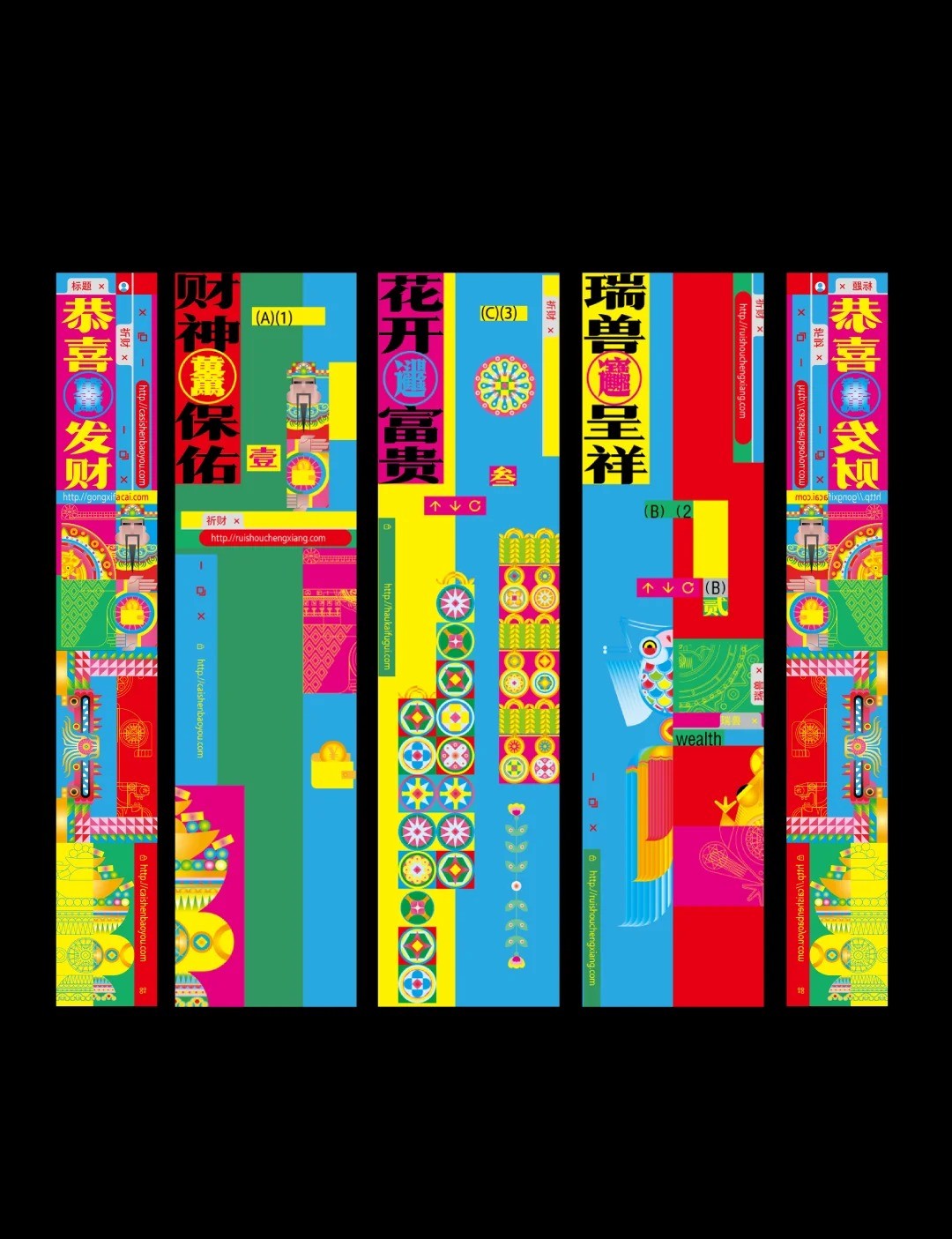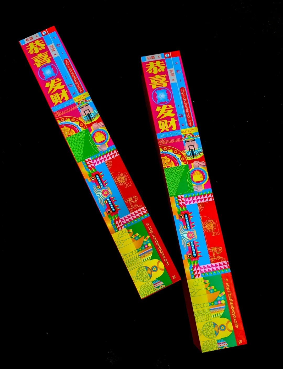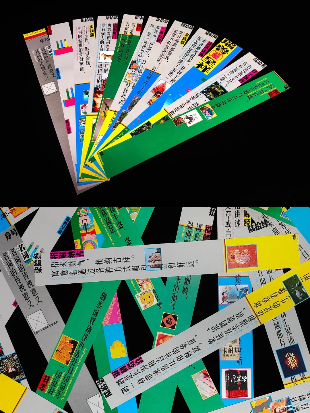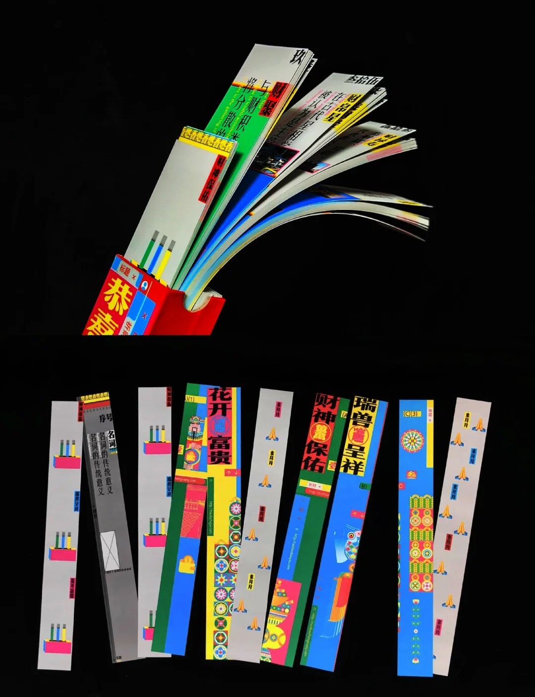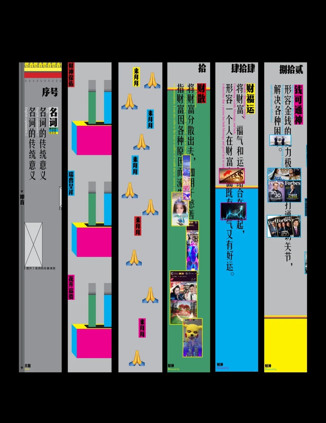 文本内容全部是传统招财词语和其名词解释,图片内容则是这些词语在网络环境中被解构、引申,而产生的新含义,以此来展示当下人们对“发财”这个词语的全新理解。 书籍的整体形象来源是“五彩香”,在调研时,在寺庙香炉中往往会看到一些巨大的、极长的、非常华丽的香,印象深刻,最后将这种印象转化为了一种形式用在了书上。