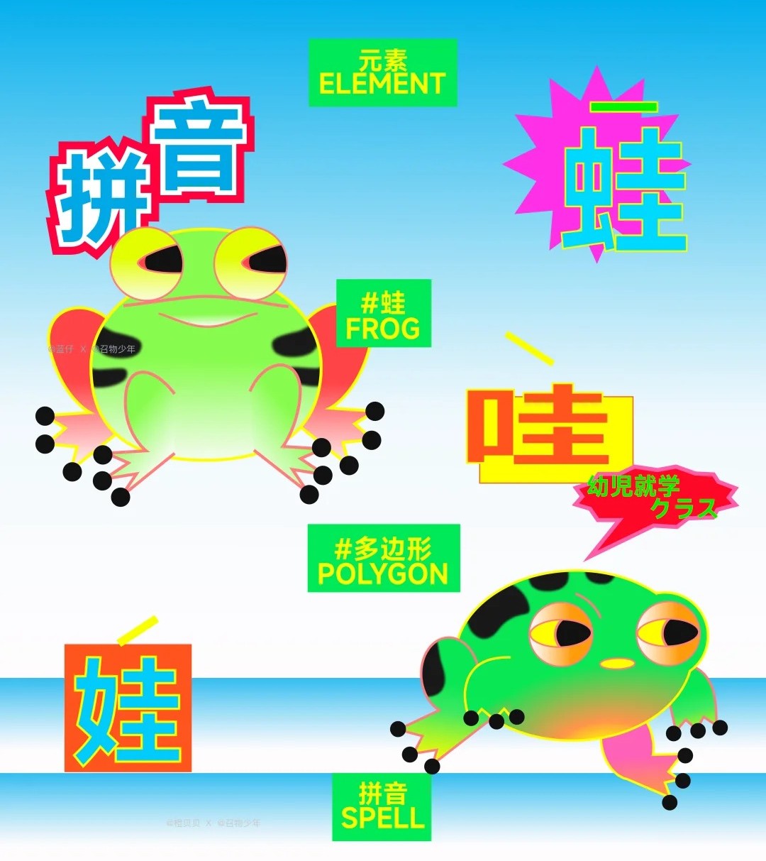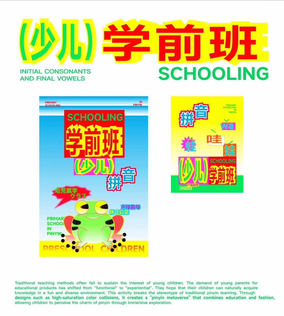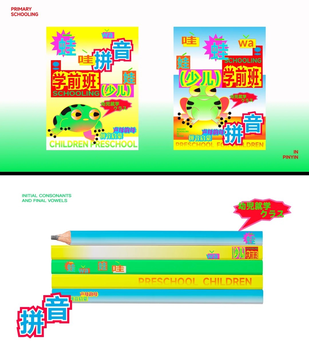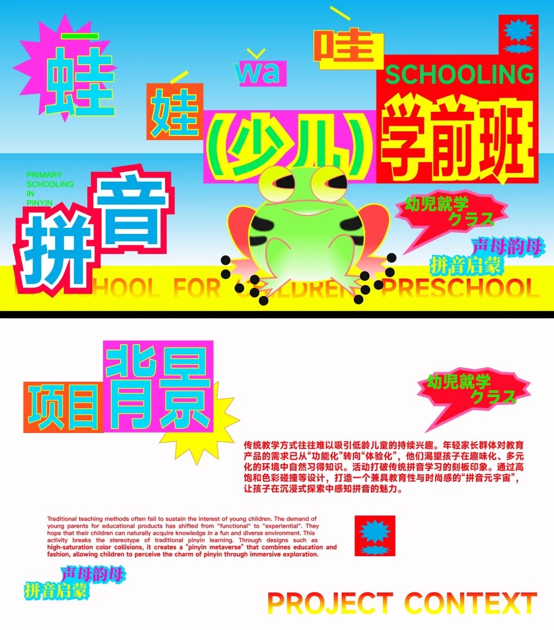 以 “拼音启蒙” 为核心,打造少儿学前班视觉设计。用活泼青蛙形象、高饱和撞色与醒目字体,打破传统拼音学习刻板印象,营造趣味 “拼音元宇宙”,契合低龄儿童喜好,助力沉浸式拼音学习。