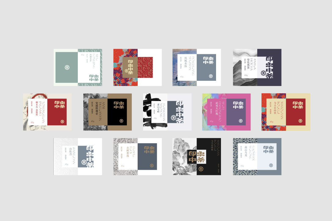 提取了“中”字作为中茶印象品牌价值的内核,贯穿到整个品牌系统中,成为品牌独一无二的品牌基因。为了强化中茶印象的中国基因,我们选用中国传统色茶色作为品牌色,并用另外十种传统色作为中茶印象的品牌辅助色。品牌系统也万变不离其“中”,围绕着“中”字演变。\n\n在系列的产品包装设计中,我们延续包装“中”字的概念,维持系统感,但结合不同产品系列,我们又用不同的设计加以区分。\n\n在空间设计中,我们希望呈现出东方气质, 不是用具象的中式符号,而是用传统材料、自然的材质、演绎当代空间,再在空间中引入光,创造一个“空”的概念,让空间整体具有时间和历史的维度, 它既是传统的又是当代的。