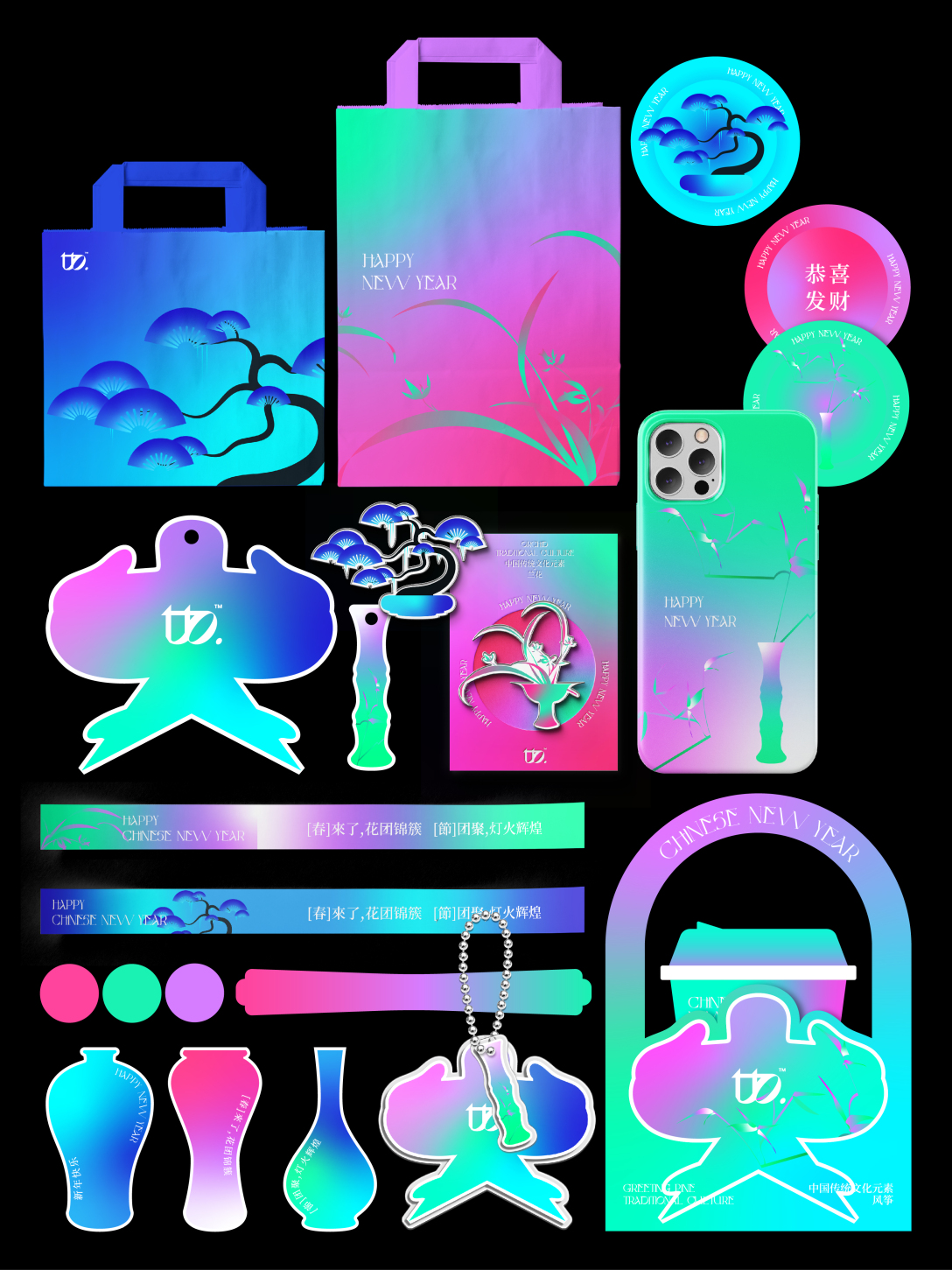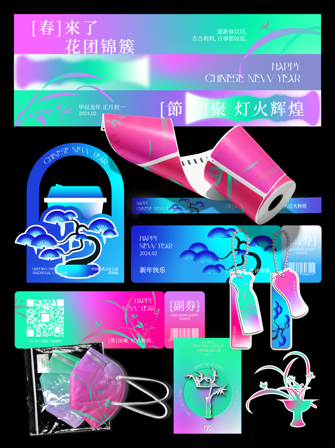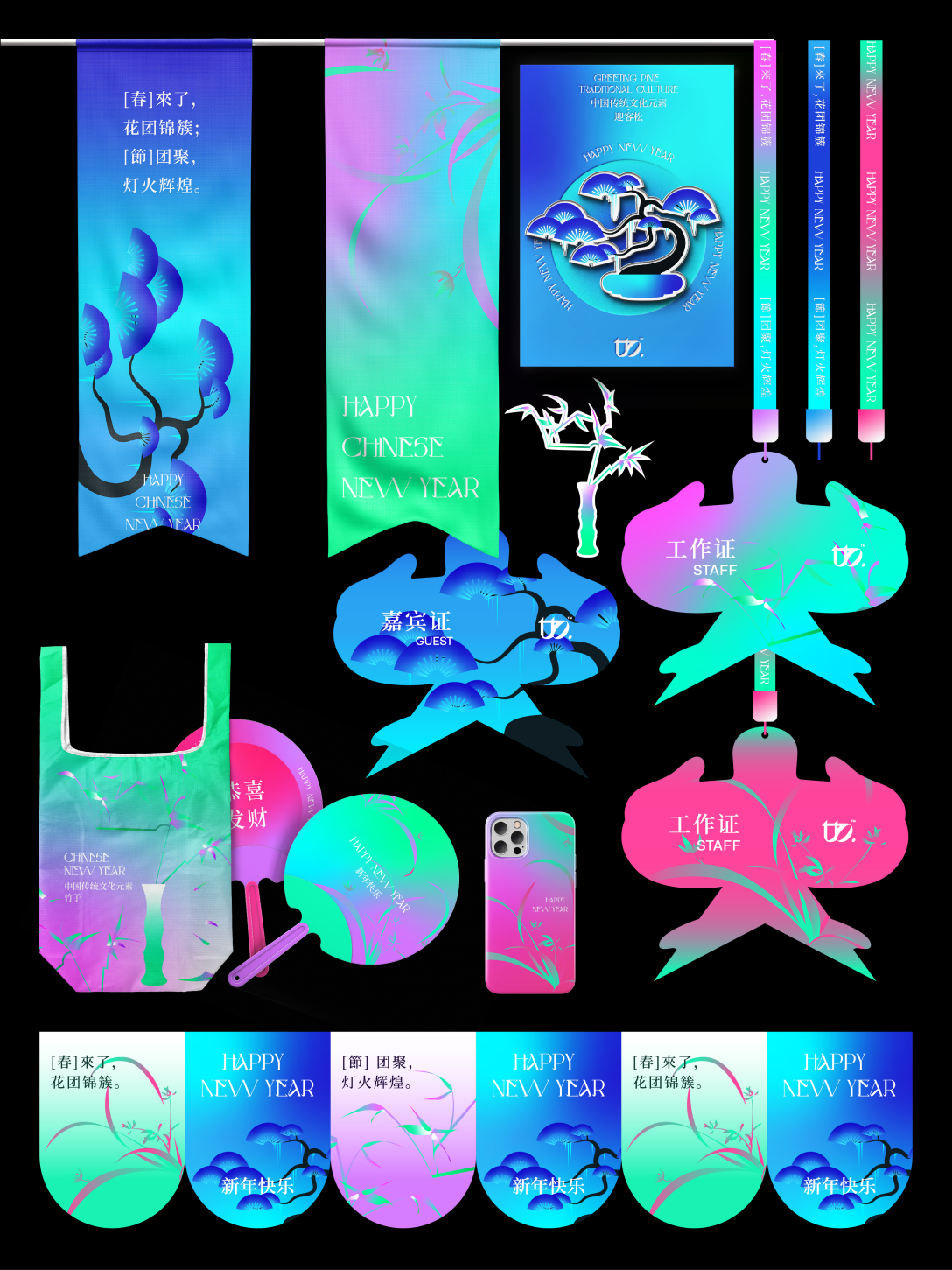 这套物料更多的想让大家体会到一种以配色为主导的春意盎然的新中式氛围,以一种不一样的形式打开新一年的序幕。它在新年海报原有的配色上添加了另外两种配色,使整套物料主视觉都集中在强烈的配色氛围中。再配合兰花、竹子、迎客松、风筝、旗袍和瓷器形状等的中式元素,去完成整体的延展。