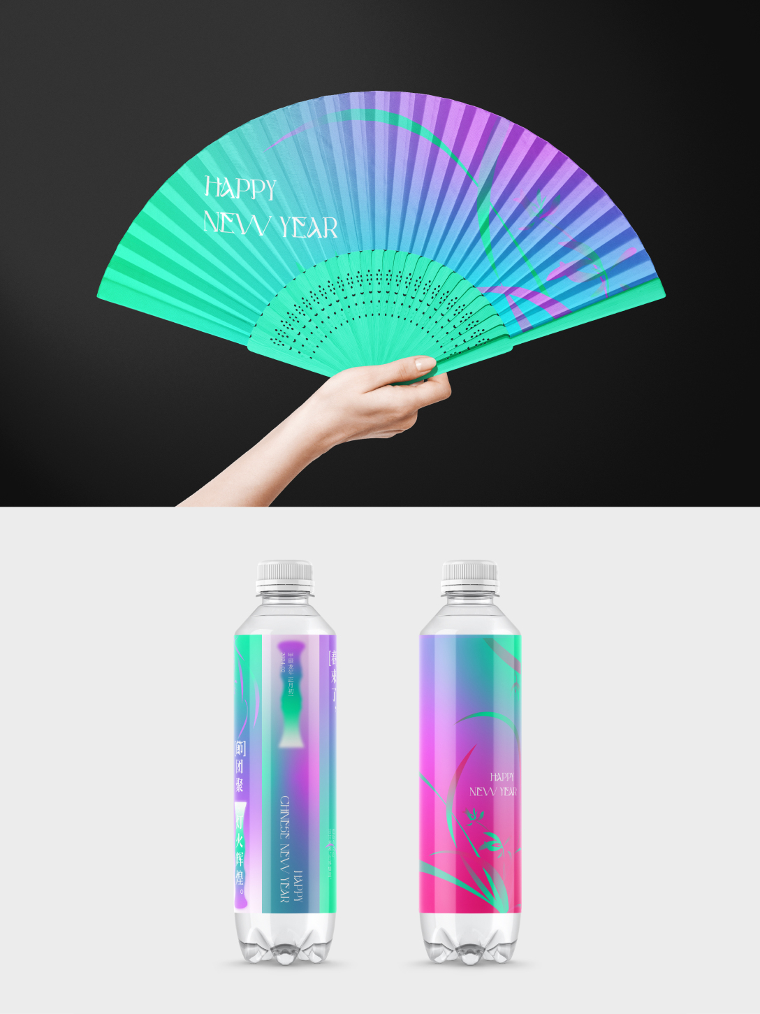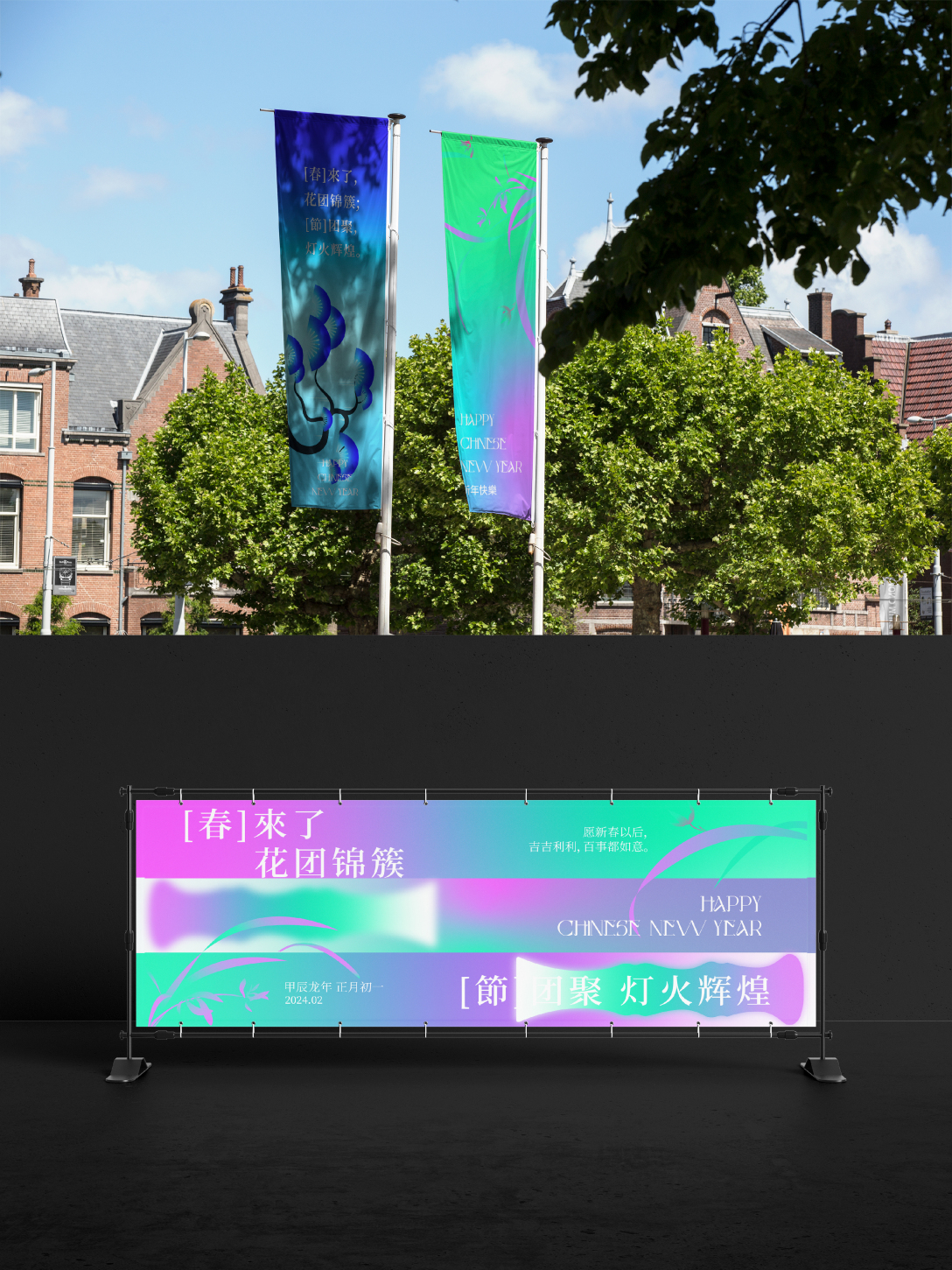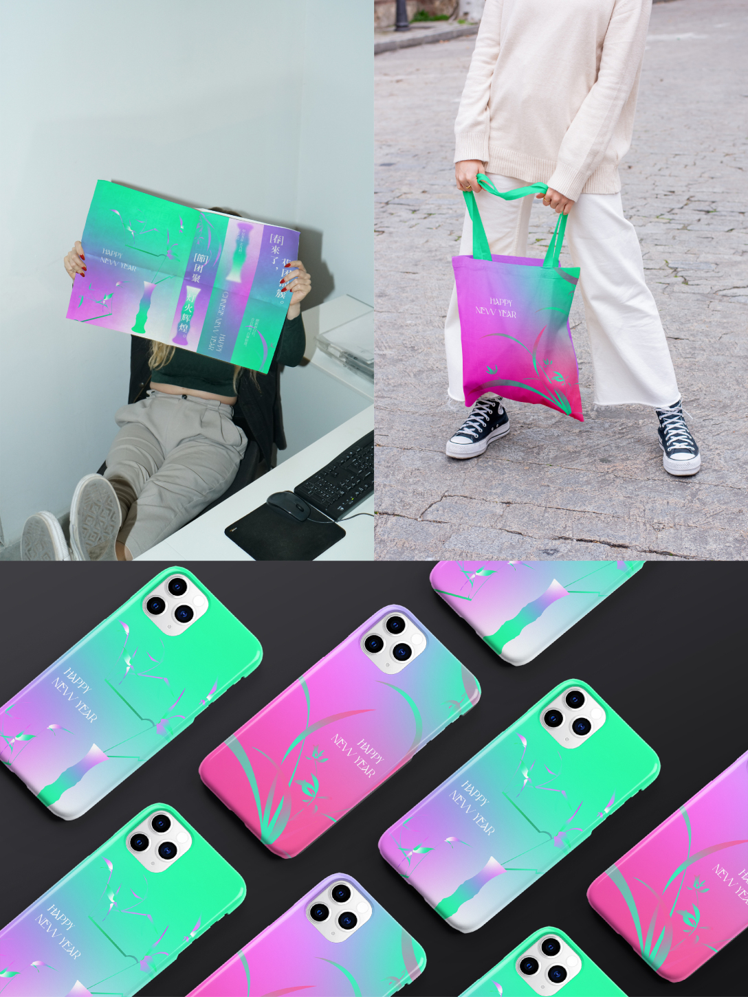 这套物料更多的想让大家体会到一种以配色为主导的春意盎然的新中式氛围,以一种不一样的形式打开新一年的序幕。它在新年海报原有的配色上添加了另外两种配色,使整套物料主视觉都集中在强烈的配色氛围中。再配合兰花、竹子、迎客松、风筝、旗袍和瓷器形状等的中式元素,去完成整体的延展。