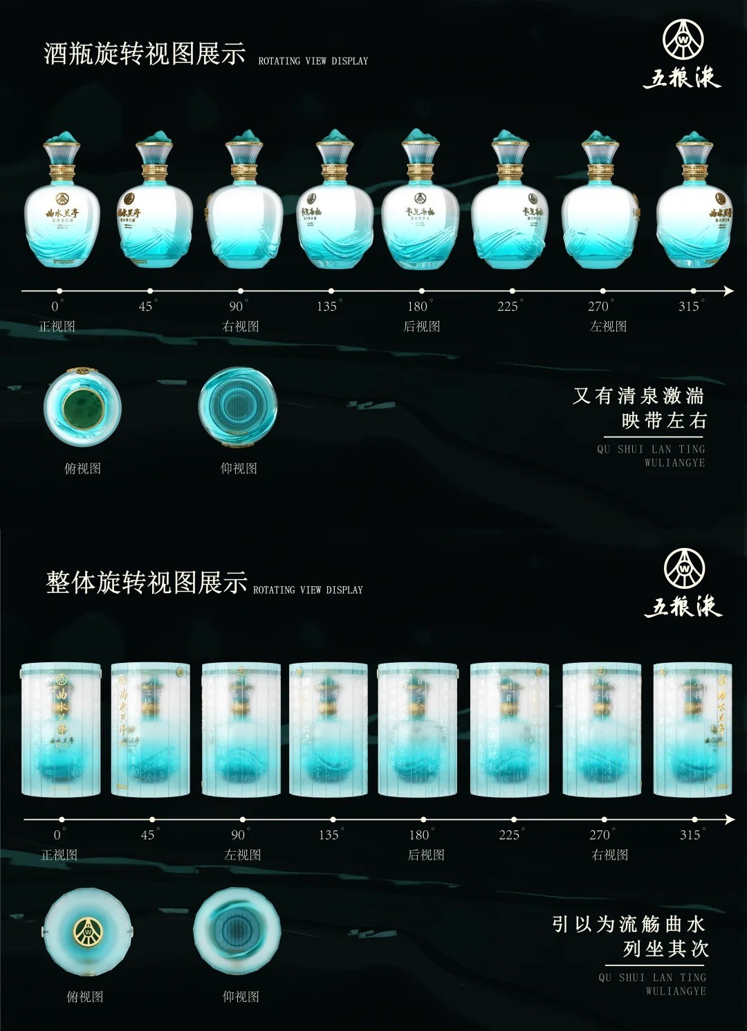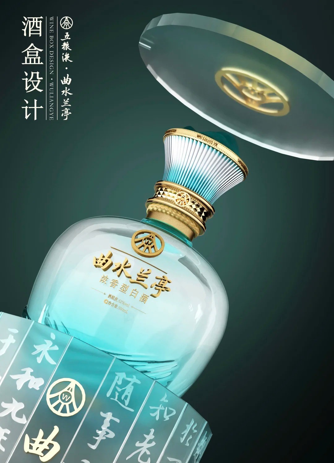 设计说明:《五粮液·曲水兰亭》包装设计以王羲之《兰亭集序》中“曲水流觞”为内核,深度融合五粮液传统酿造文化。包装以 “兰亭雅韵” 为主题,通过书法艺术、自然意境与东方美学,再现魏晋名士“仰观宇宙,俯察品类”的哲学境界,彰显酒品“集天地之灵,成古今之味”的高远格局。