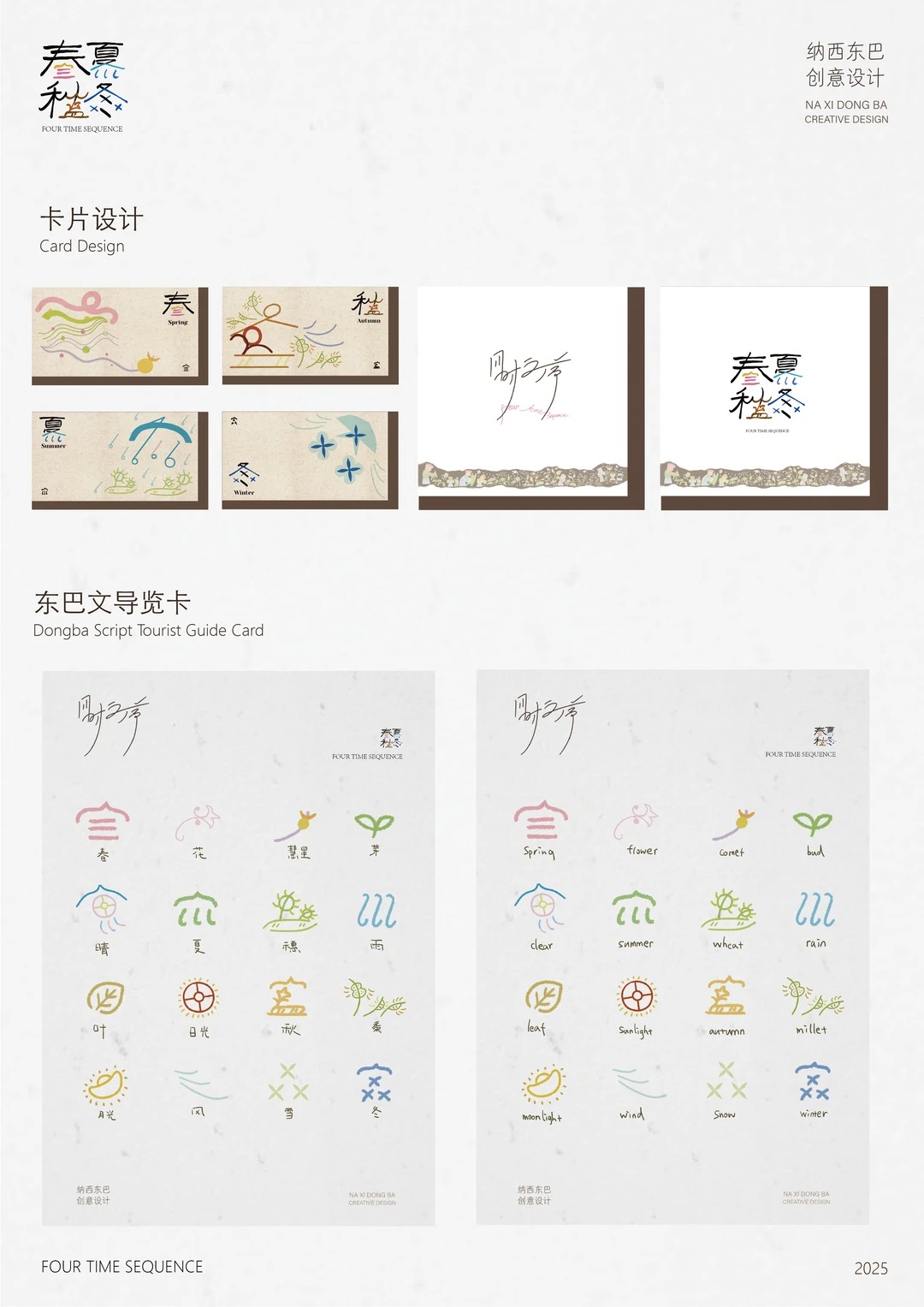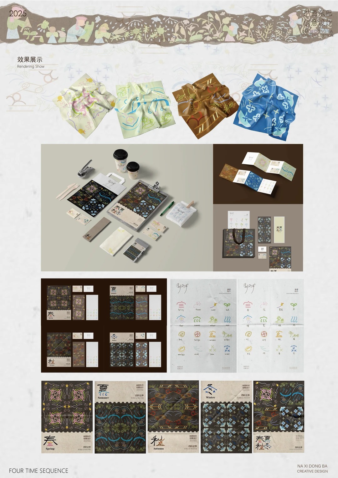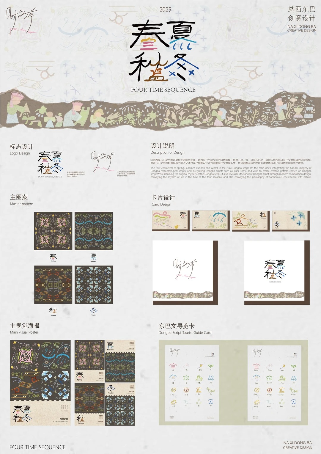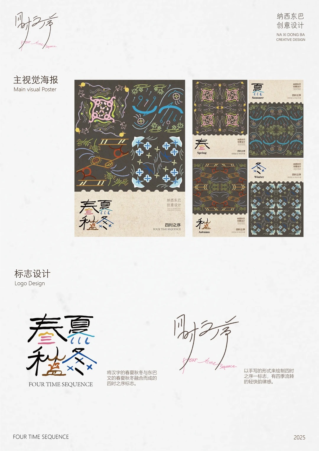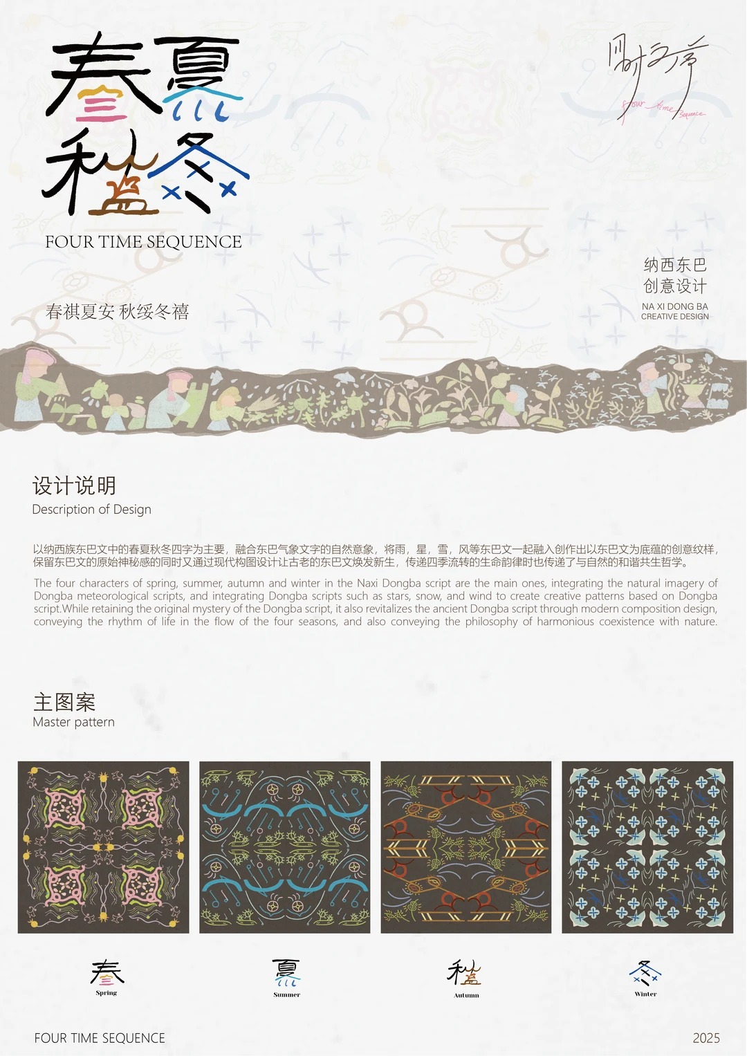 2024年下半年跟随学院去到了云南采风实地了解了一些纳西族文化和东巴文字,断断续续的的推敲设计。 设计说明 Description of Design 以纳西族东巴文中的春夏秋冬四字为主要, 融合东巴气象文字的自然意象,将雨,星,雪,风等东巴文一起融入创作出以东巴文为底蕴的创意纹样,保留东巴文的原始神秘感的同时又通过现代构图设计让古老的东巴文焕发新生, 传递四季流转的生命韵律时也传递了与自然的和谐共生哲学。