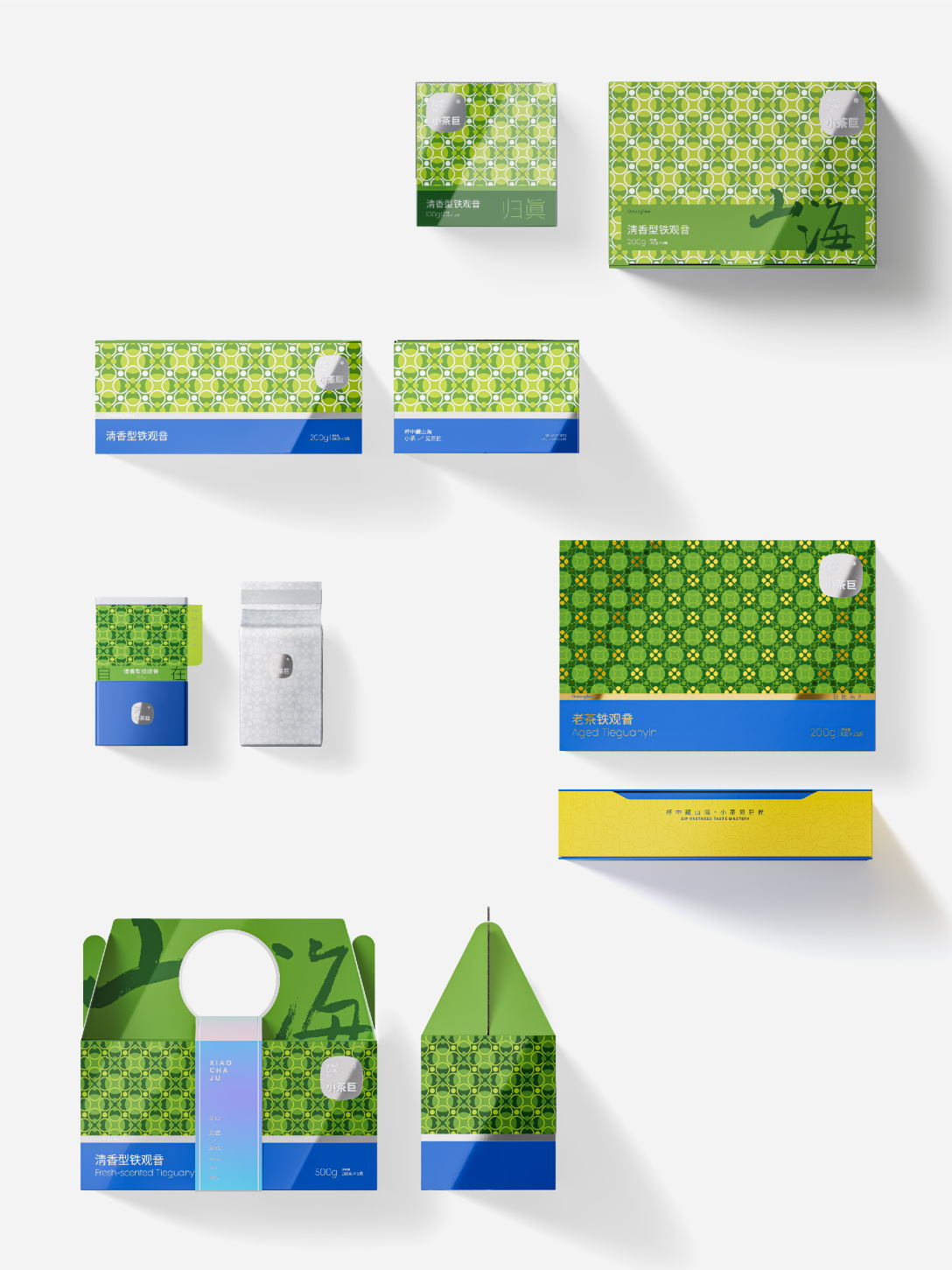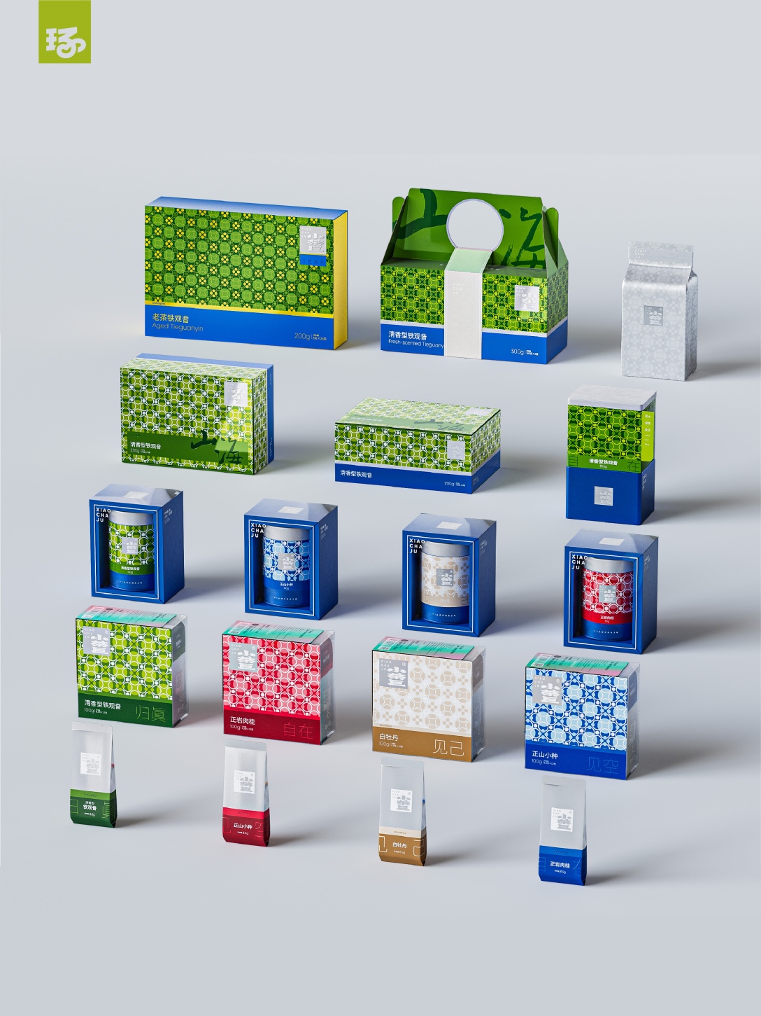 基于“山海文化+方圆哲学”的文化基调,我们以 “青境” 为主色,融合山青与海蓝,传递静谧与生机并存的东方美学。 核心纹样体系:从福建传统花砖中提取方圆元素,以 斐波那契数列 重构为现代几何纹样,形成既有文化厚度又有数理美感的视觉符号。