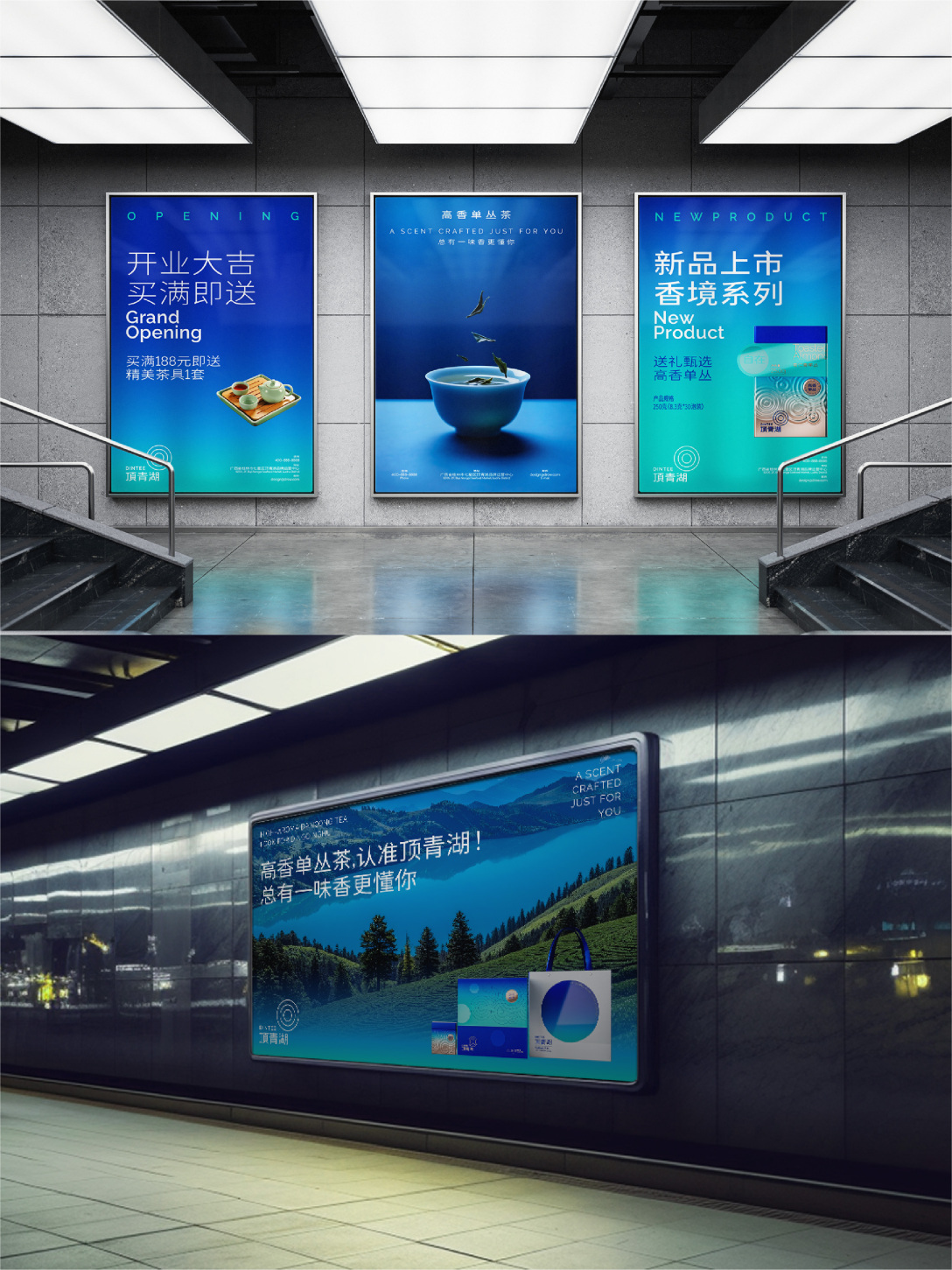 视觉体系以 “新东方禅境美学” 为基调,主色提取 绀青 与 天青,呼应“青湖”静谧与“高香”流动,重新梳理品牌产品线与产品卖点,构建兼具理性网格与典雅气质的超级视觉系统。从包装到传播物料,让“高香”看得见、摸得着、感受得到。 品牌核心符号:青漪破香 以涟漪形态承载“静湖生香”的意境,传递自然、通感与精神的三重表达。设计融合现代网格的理性与东方留白的诗意,打造轻奢、静观、有温度的视觉体系。