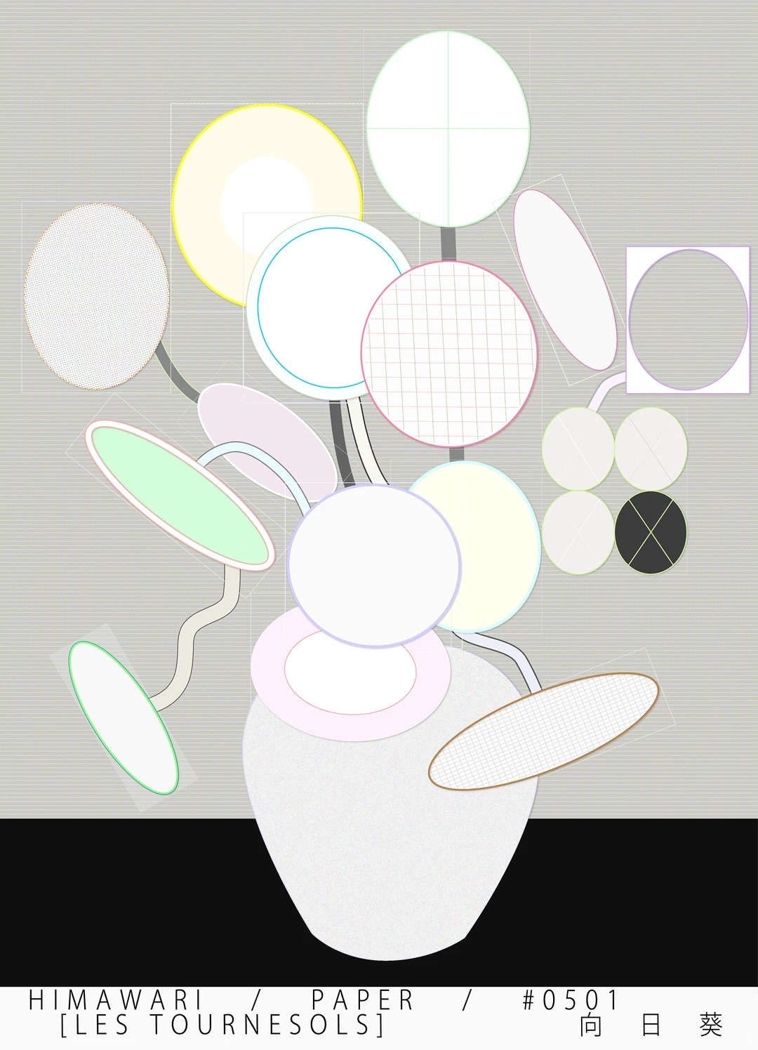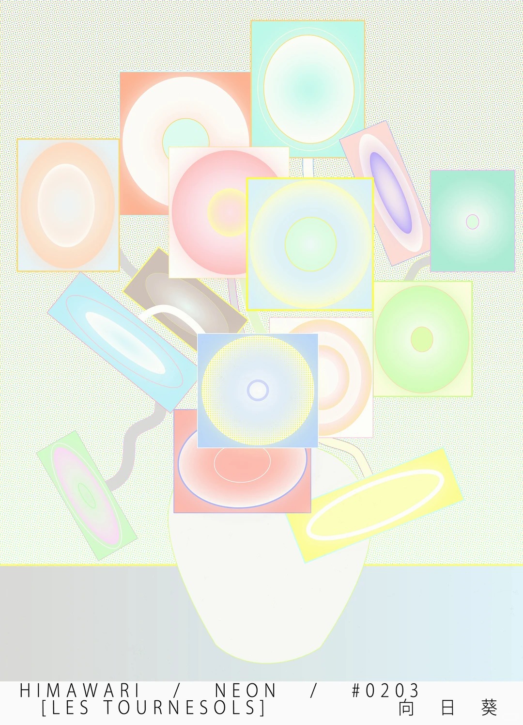 工作室:TM Inc.(Trademark) 项目名称:《HIMAWARI》(向日葵) TM Inc. 是东京的一家平面设计工作室,其核心理念是:为世界万物寻找最恰当的符号表达。 《HIMAWARI》系列以“向日葵”为母题,拆解并重组花卉的传统意象:花瓣被几何环、霓虹光晕、点阵网格所取代。经典的插花构图与冷峻的电子符号并置,作品像是一场数字时代对自然的模拟与再生的实验。 关键词:解构,几何,数字,符号,传统重写