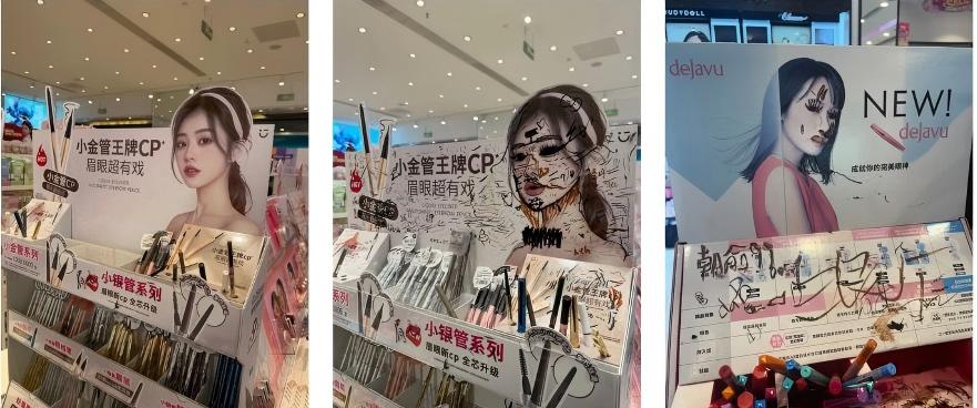 所以,当我看到名创优品的代言人小姐姐,惨遭“灵魂画手”们“毁容式”乱涂乱画时,我心里其实是有点心疼她的,有图有真相。