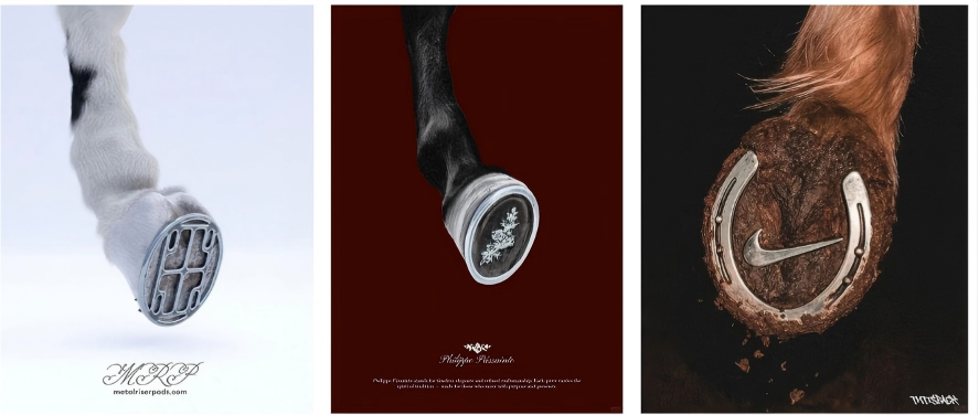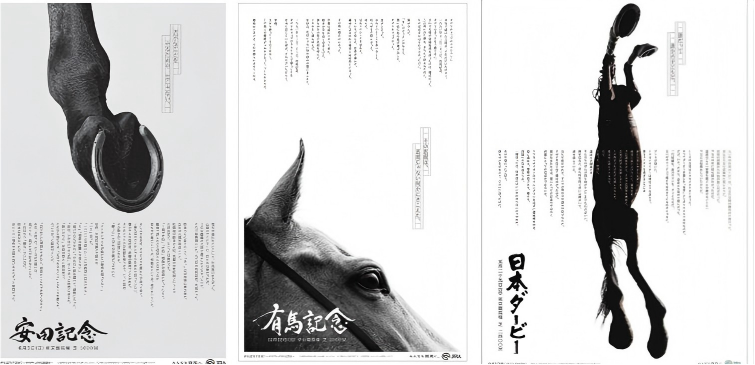 反套路操作:把大家默认忽略的马蹄,打造成绝对主角,用特写、叙事等多元手法,避开生肖元素堆砌的同质化陷阱。最绝的是马蹄与金属垫片的创意碰撞,柔软蓬松的马毛肌理,撞上冷硬利落的工业质感,反差感直接拉满;还有的海报将马蹄与LOGO意象结合,把空泛的 “马年大吉”,变成有画面、有质感的视觉记忆点,适配各种品牌场景,高级又不生硬。不止是马蹄创意出圈,这组竞技赛马的海报更是把 “高级感” 刻进 DNA,堪称赛事宣传的天花板。不同于传统赛事海报的喧闹,它靠 “高级留白 + 极致视角”,硬生生把竞技宣传做成了人文艺术。独特的特写视角,大黑白质感褪去浮华,传递出沉静又有力量的情绪张力,再配上生活化文案,让冰冷的竞技多了几分人文温度 —— 留白从不是空白,而是给情绪和想象留足空间。