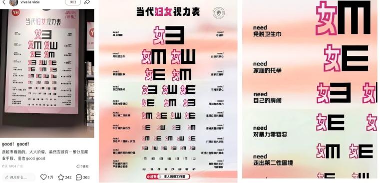 海报把女性未被看到的需求一一罗列:同工同薪、话语权、家庭的托举、更多女厕所……非常有创意,但这是去年由@抓人创意 Studio原创的「妇女视力表」,博主还做了正规版权登记。