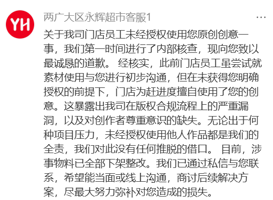 事情发生后,永辉火速撤下海报,客服在评论区道歉,承认系门店员工擅自使用,暴露版权合规漏洞。