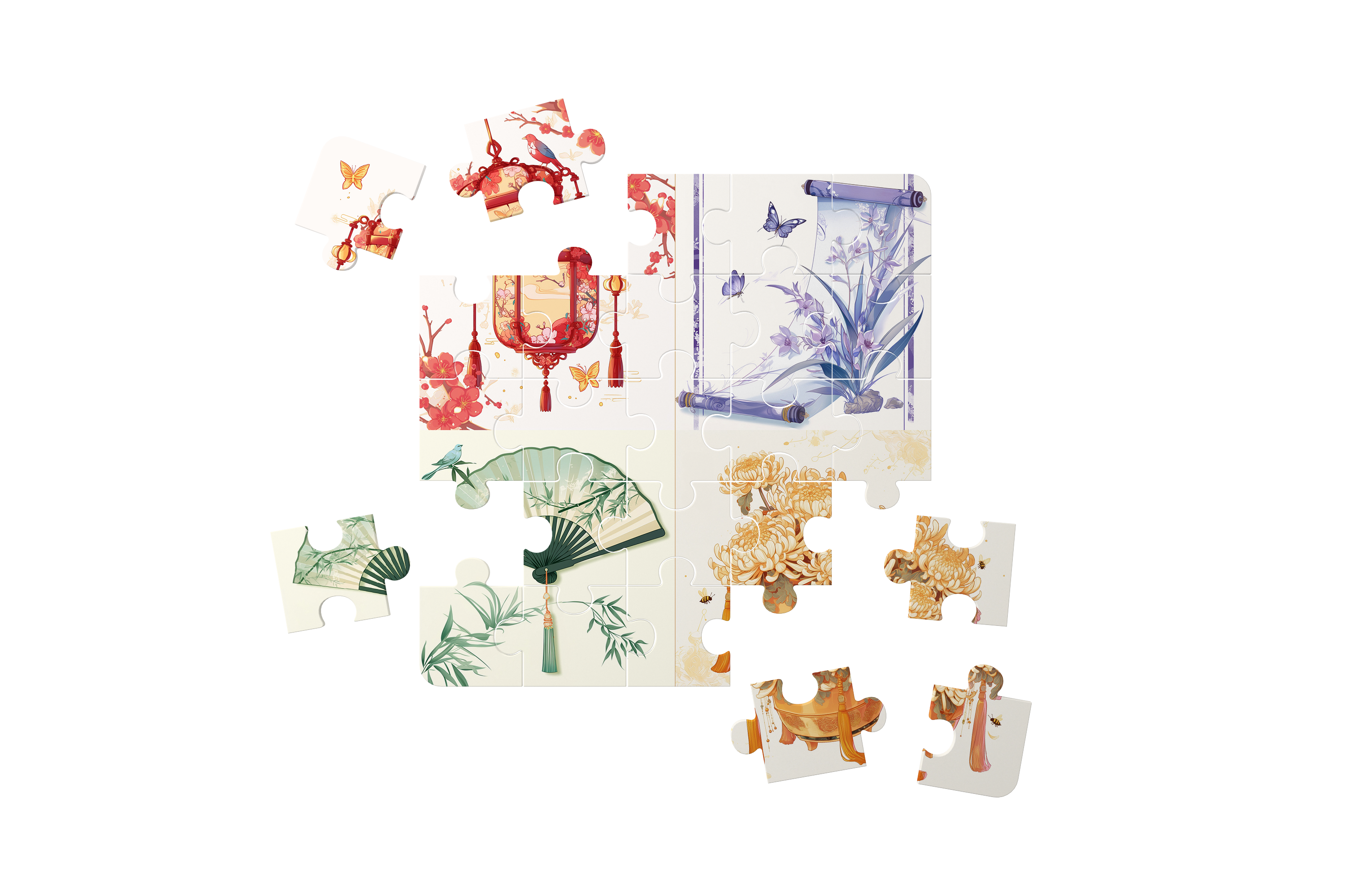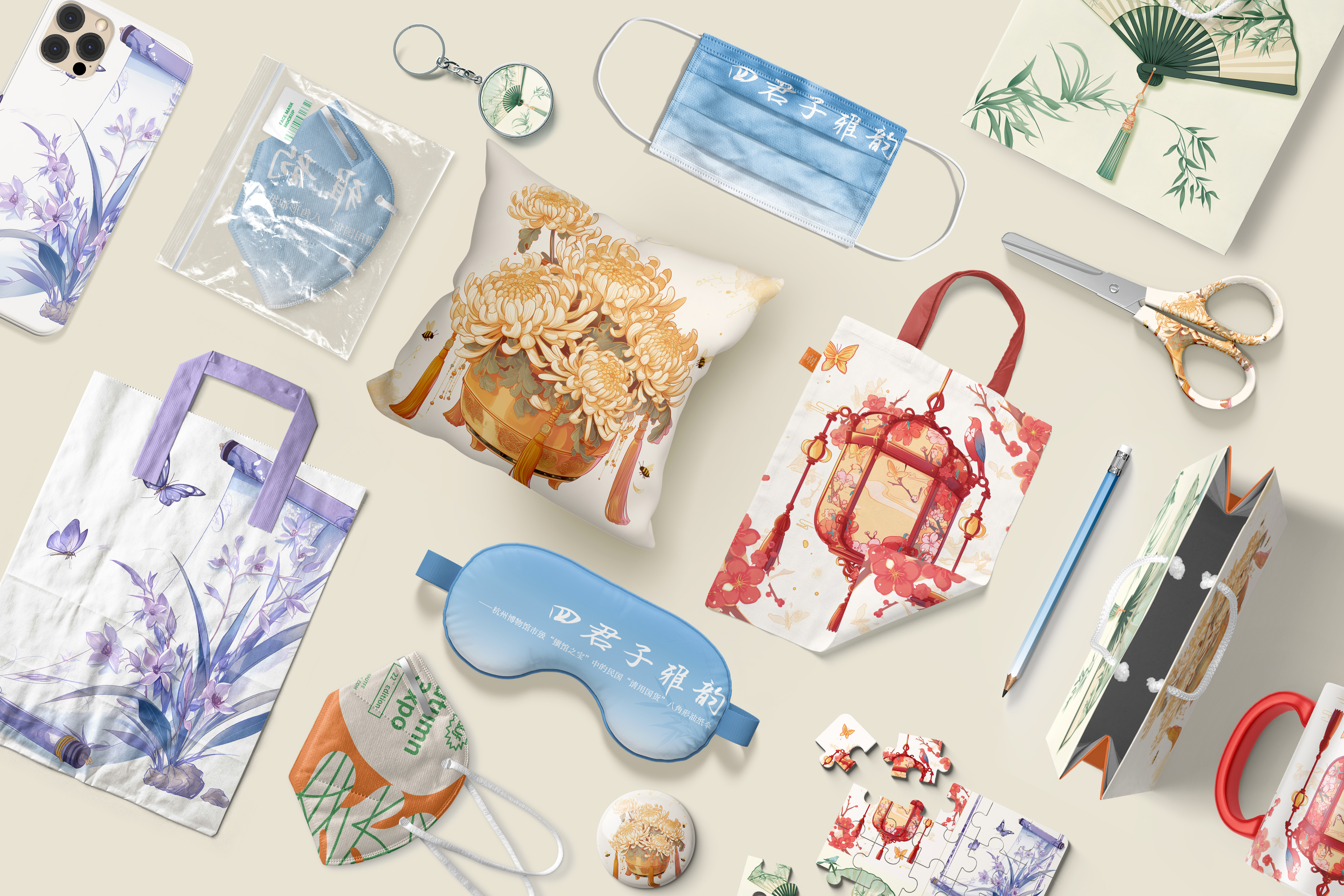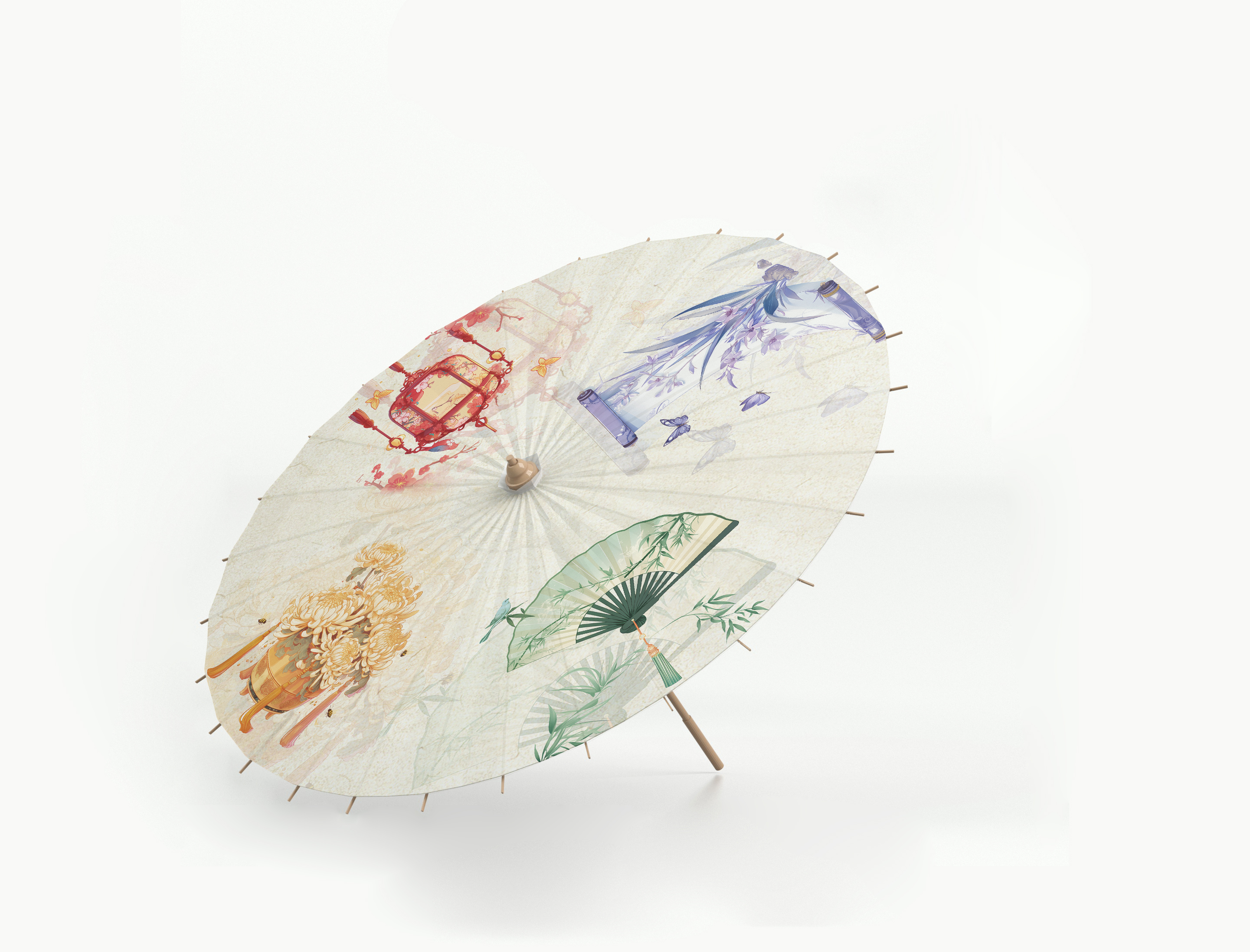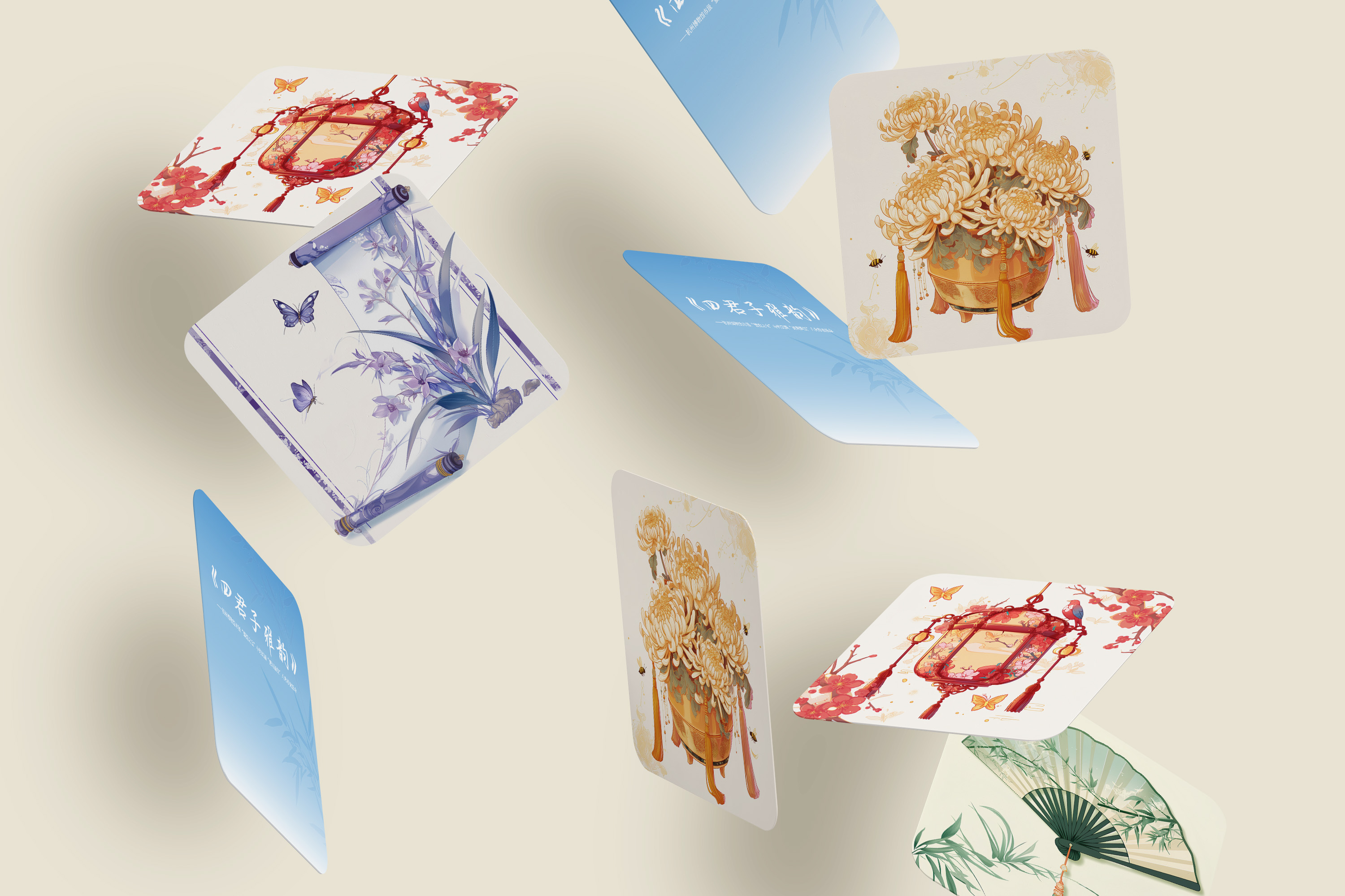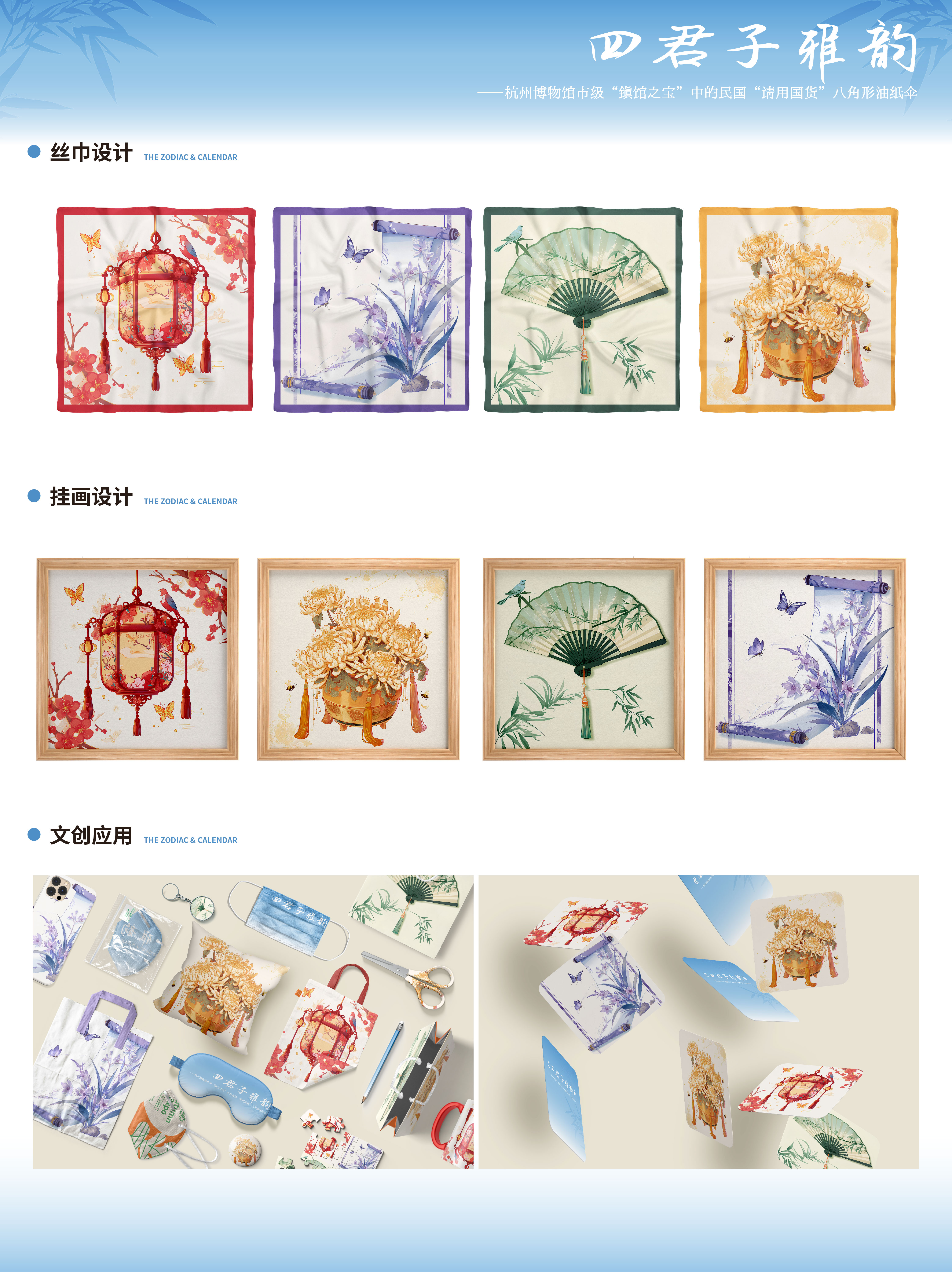本设计灵感源自于杭州博物馆市级“镇馆之宝”-民国“请用国货”八角形油纸伞的经典之美,结合中国传统文化中的“梅、兰、竹、菊”四君子图,精心绘制了一幅集古典韵味与现代审美于一体的插画作品。通过巧妙的构思与细腻的笔触,将四种自然之美与传统元素完美融合,展现了中华文化的深邃与广博。 设计构思:插画以淡雅的色调为主,营造出一种宁静和谐的氛围。画面中央虽未直接呈现油纸伞形态,但通过伞面彩绘的构思,将四君子图巧妙地分布于四个独立的插画中,每个插画都围绕着其对应的传统元素展开,既独立成章又相互呼应。