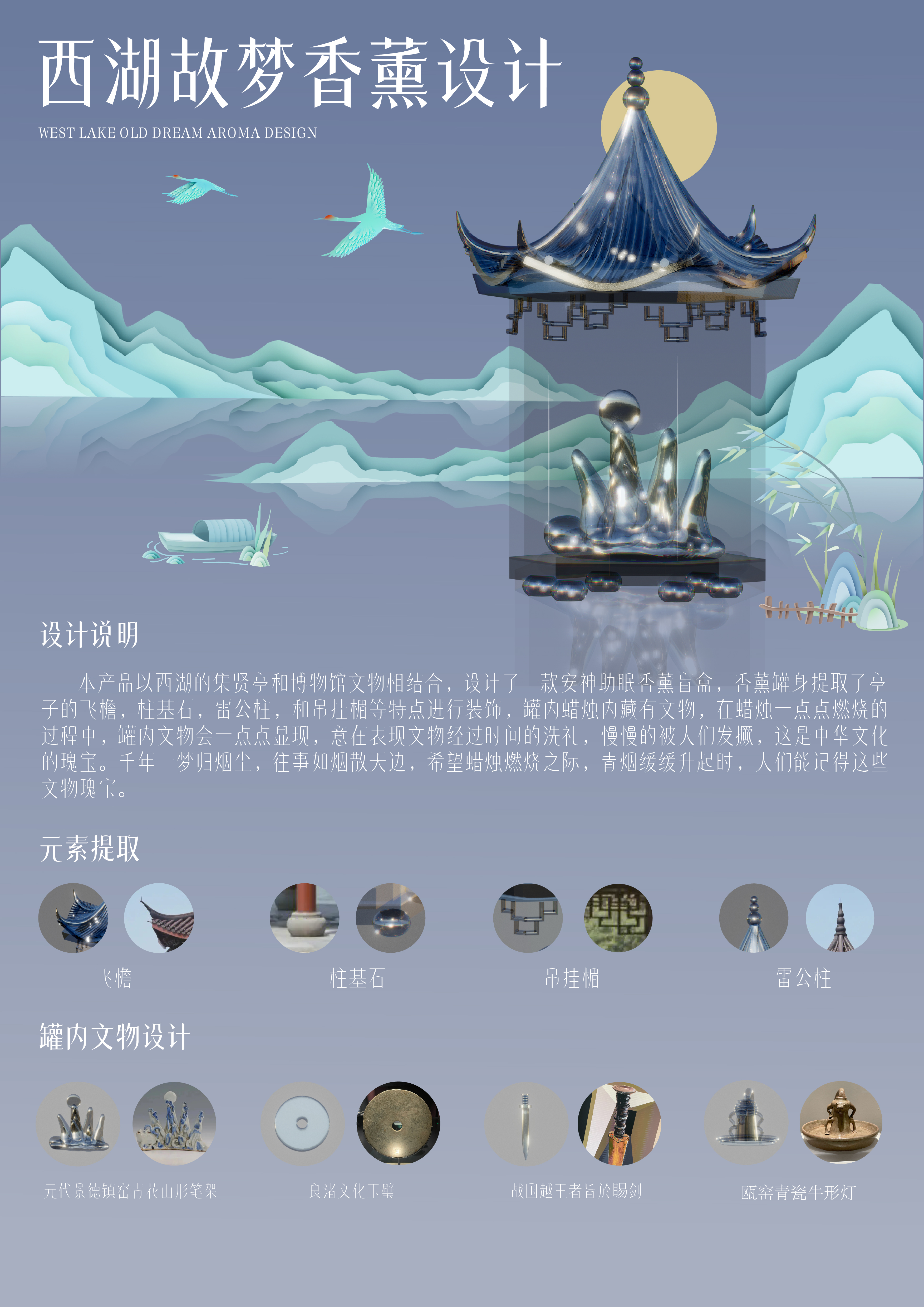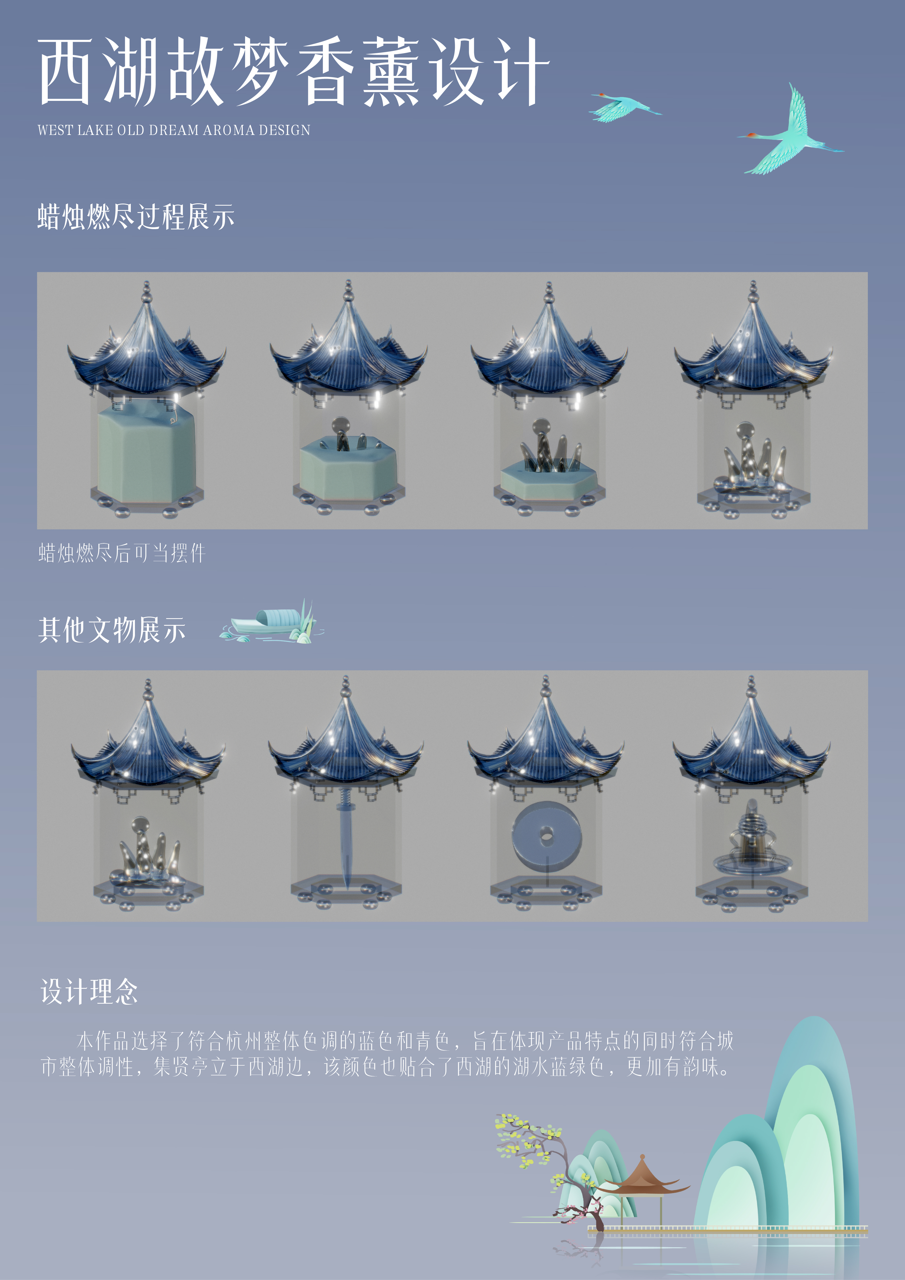 本产品以西湖的集贤亭和博物馆文物相结合,设计了一款安神助眠香薰。作品选择了符合杭州整体色调的蓝色和青色,旨在体现产品特点的同时符合城市整体调性,集贤亭立于西湖边,该颜色也贴合了西湖的湖水蓝绿色,更加有韵味。