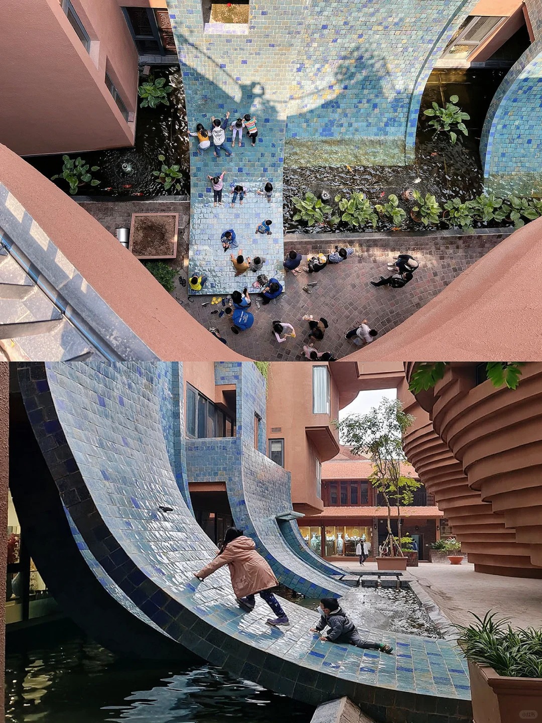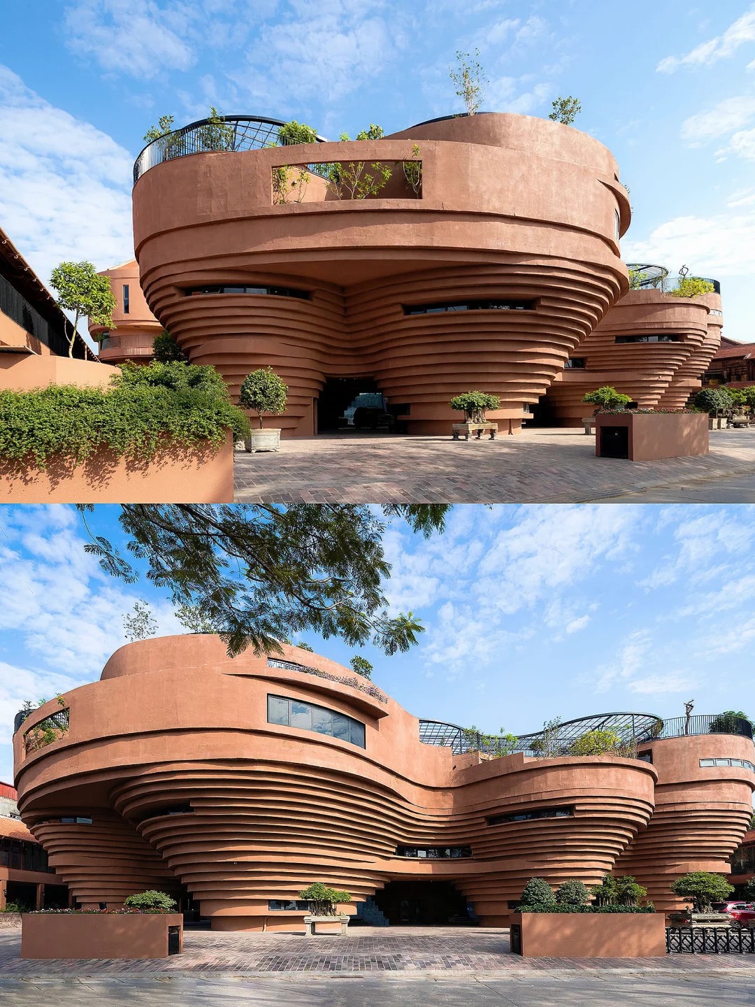Bat Trang陶瓷社区中心是一栋五层的多功能综合体建筑。建筑由7个相互连接的陶艺转盘状的体量组成,灵感来源于陶瓷工匠在处理平滑的粘土块过程中形成并逐渐扩展的重叠曲线。阶梯状的建筑立面,不仅优化了建筑功能性,还通过对陶瓷工艺的艺术演绎,展现了独特的创意和印象深刻的美感。