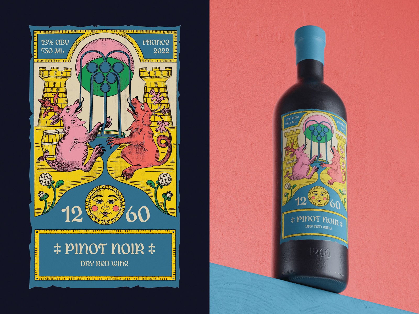 本次平面设计项目邀请您沉浸在葡萄酒文化的浓厚氛围中。通过简洁的案例研究,您将看到我们为某葡萄酒品牌设计的包装作品,其中包含以中世纪艺术风格为灵感的定制插画。本项目的独特之处在于,我们从零开始打造了专属的 3D 瓶型模型。