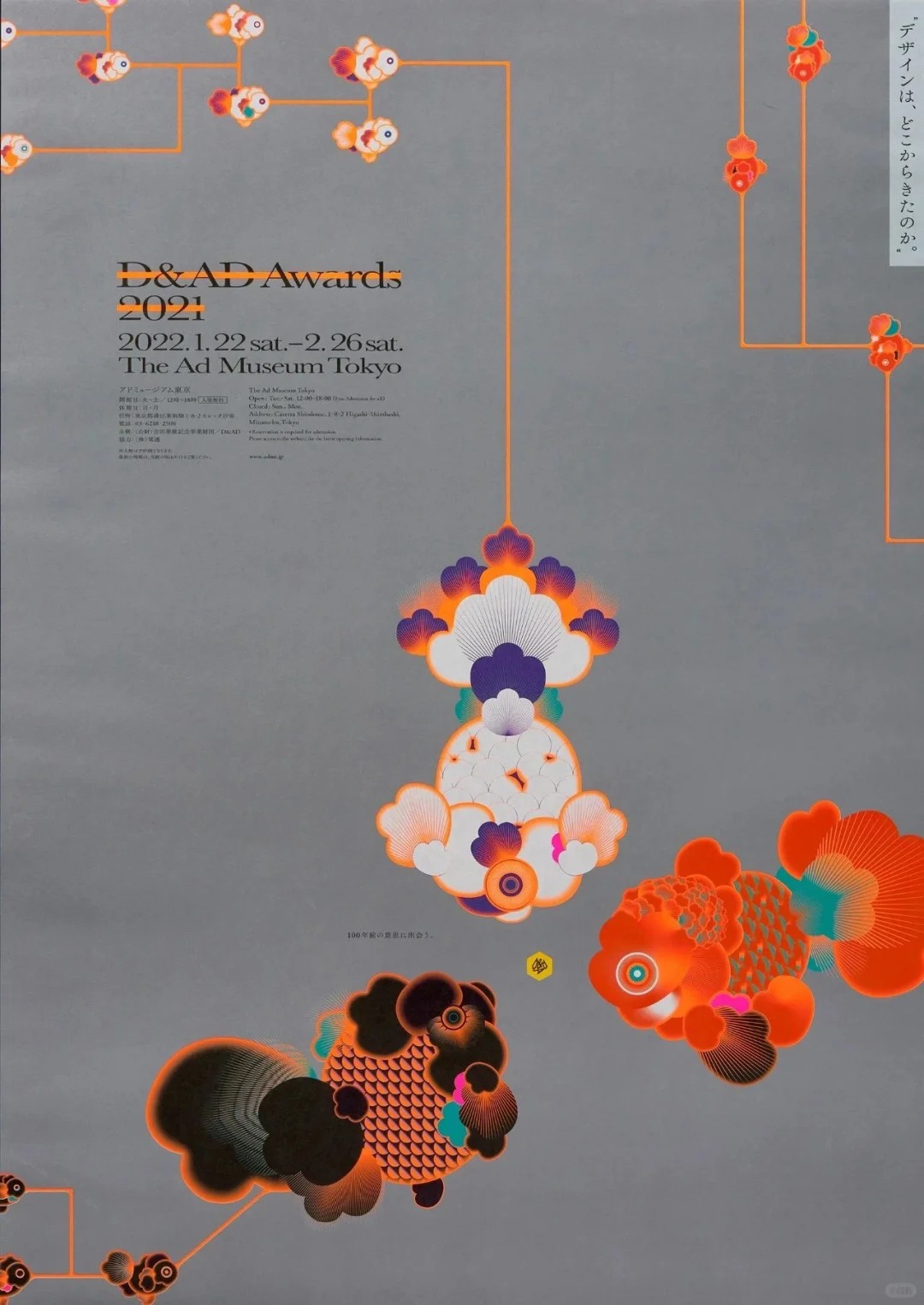 灵感源于他们对创意领域的独到见解:「设计不断受到创意的冲动所驱使,让事物比以前更好、更美丽。这是一种代代相传的冲动,超越流派和文化,跨越时空将人们连结 起来。从这个过程中产生的设计具有强烈的光辉,并且它们的演变永不停歇。」将这个过程设想为一系列美丽的突变,并选择不断突变的金鱼作为视觉表达的象征。 海报中的萤光橙色线条贯穿每条独一无二、彩虹般的美丽金鱼,代表了贯穿所有展出作品的设计 DNA 理念。