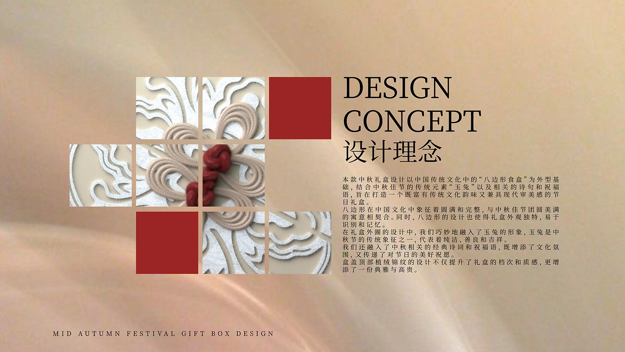 本款中秋礼盒设计以中国传统文化中的“八边形食盒”为外型基础,结合中秋佳节的传统元素“玉兔”以及相关的诗句和祝福语,旨在打造一个既富有传统文化韵味又兼具现代审美感的节日礼盒。