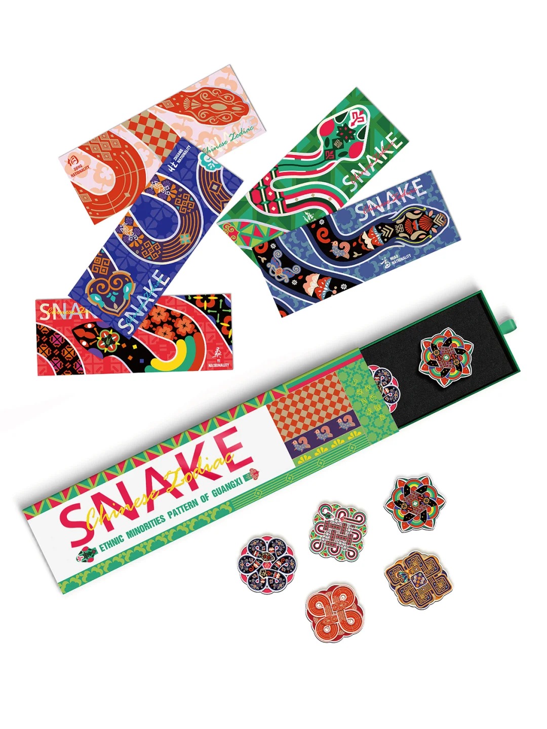 《灵蛇纹韵》民族非遗主题系列邮品文创紧密围绕“铸牢中华民族共同体”的精神主旨,图案原型为5款广西世居少数民族——壮族、瑶族、苗族、侗族、彝族的经典纹饰,这5个民族的经典纹饰选取,均来来源各自少数民族所拥有的国家级非遗织造或刺绣纺织品。纹饰图案与蛇元素做结合后,在外形上结合不同编织手法的中国结,形成兼具对称性与层次感的美学呈现。