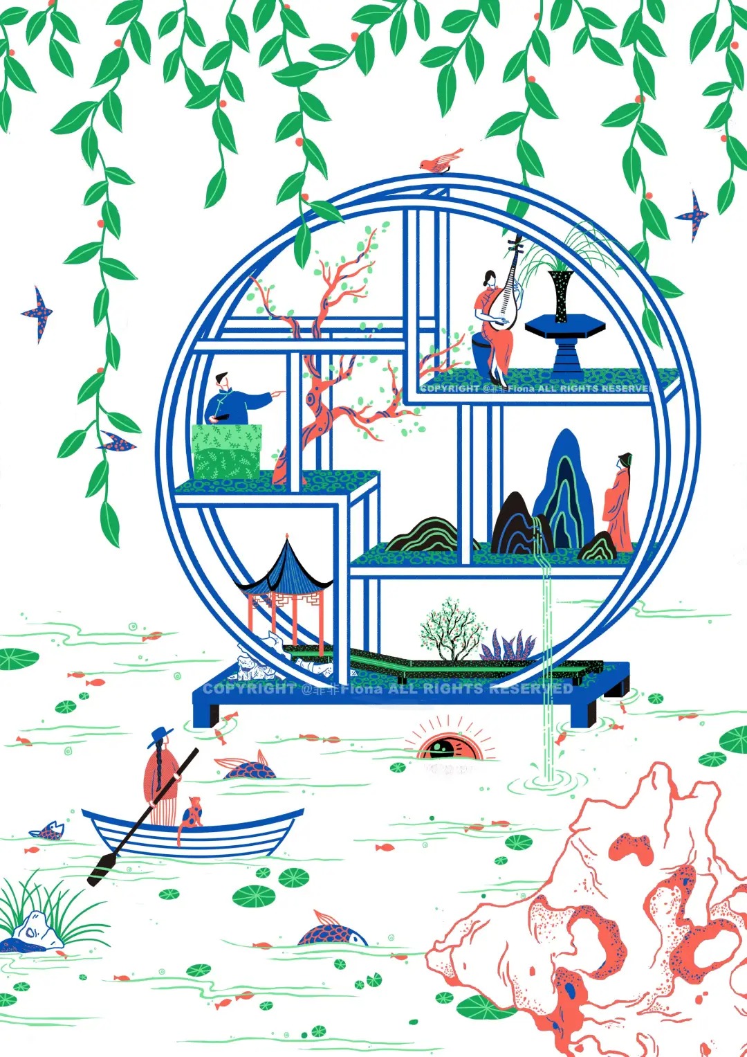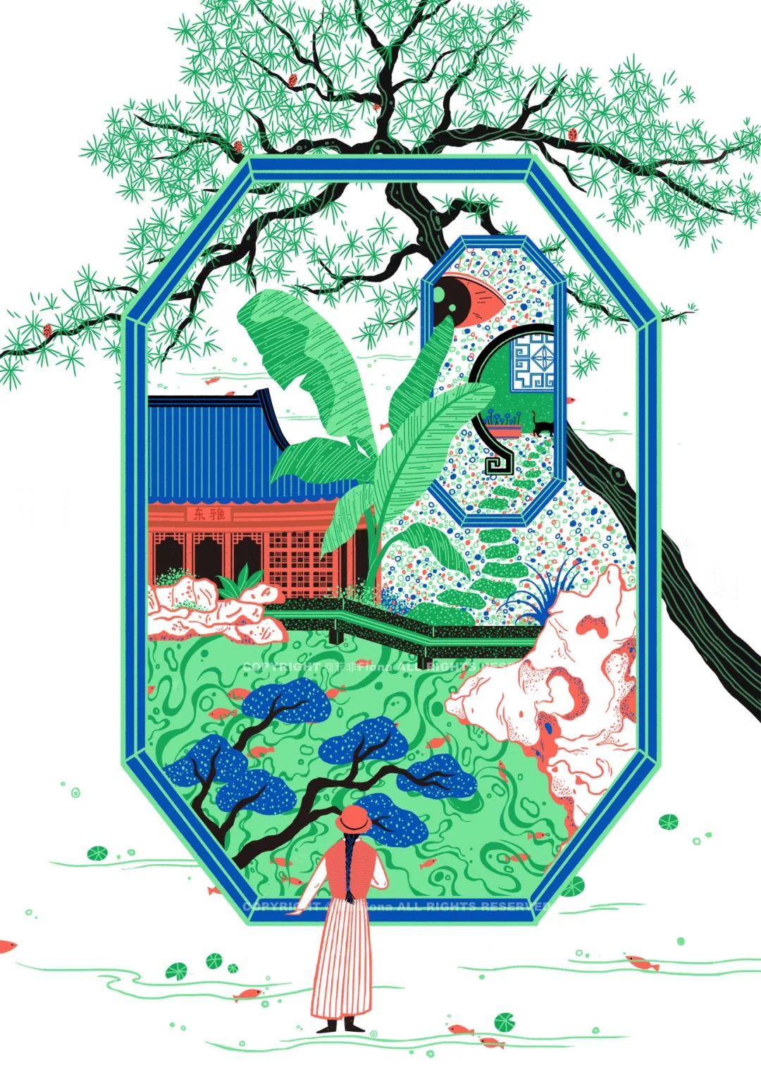 这组园林系列插画从今年5月份开始画起,陆陆续续画到了11月份,然后12月份其中三幅就见诸出版物了,收录在了iif上海国际插画艺术节的艺术图鉴《美的度量》里。