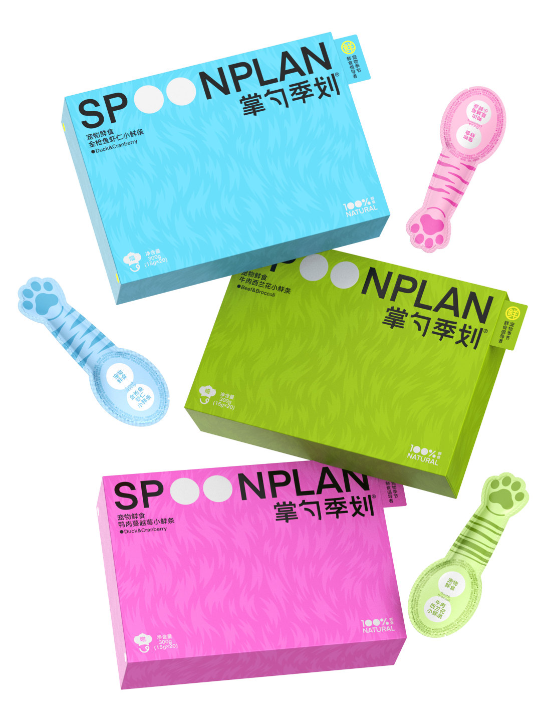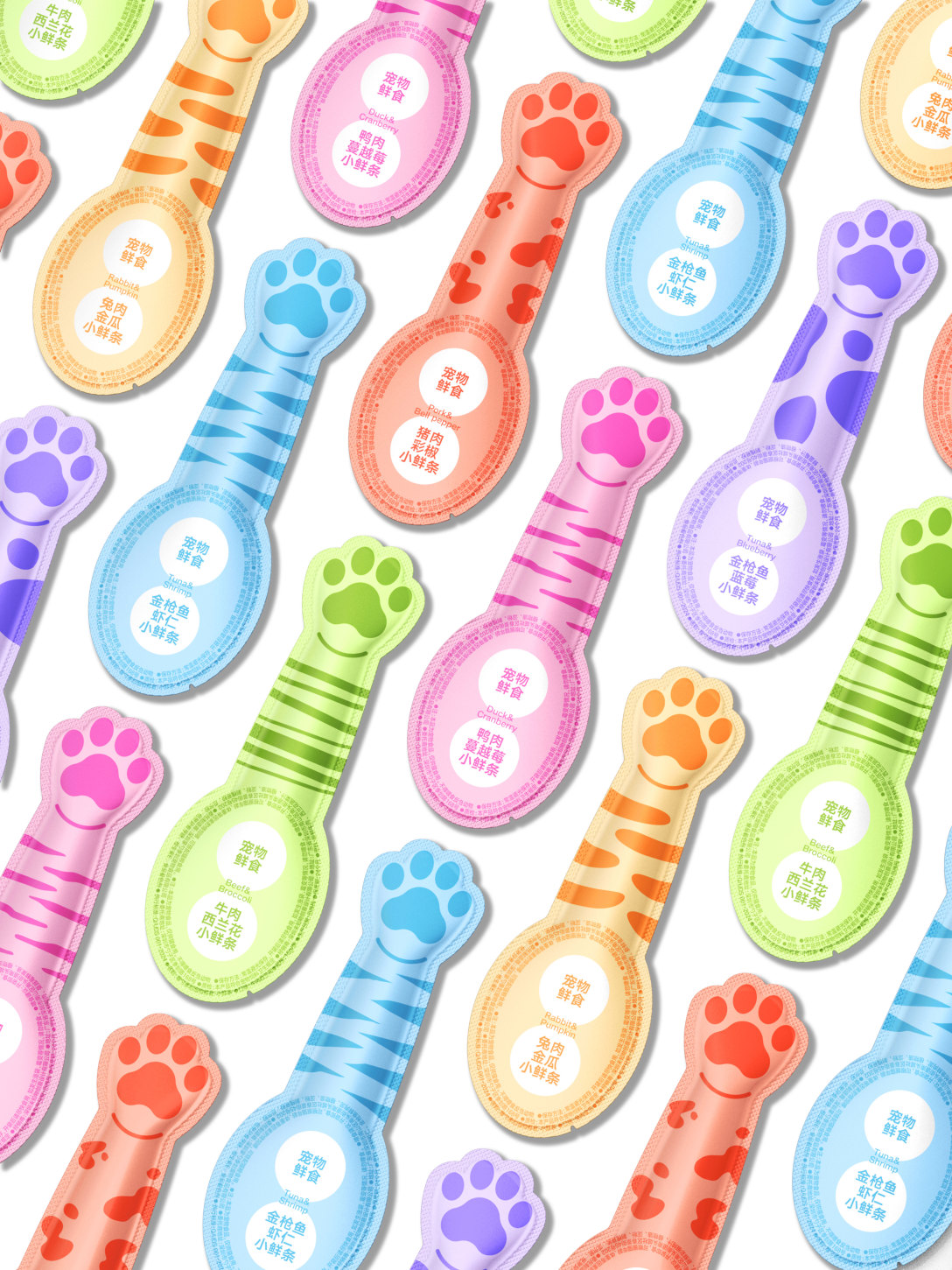 包装上大量运用了宠物爪印的图形元素。爪印作为宠物最具代表性的符号之一,能够直接唤起消费者对宠物的情感联想,增强品牌与宠物之间的关联性。爪印图案以重复排列的方式出现在包装上,形成独特的视觉节奏和韵律感,既增加了包装的趣味性,又强化了品牌记忆点。此外,部分包装上还搭配了简约的宠物形象剪影,进一步突出品牌属性,使消费者一目了然地了解产品用途。