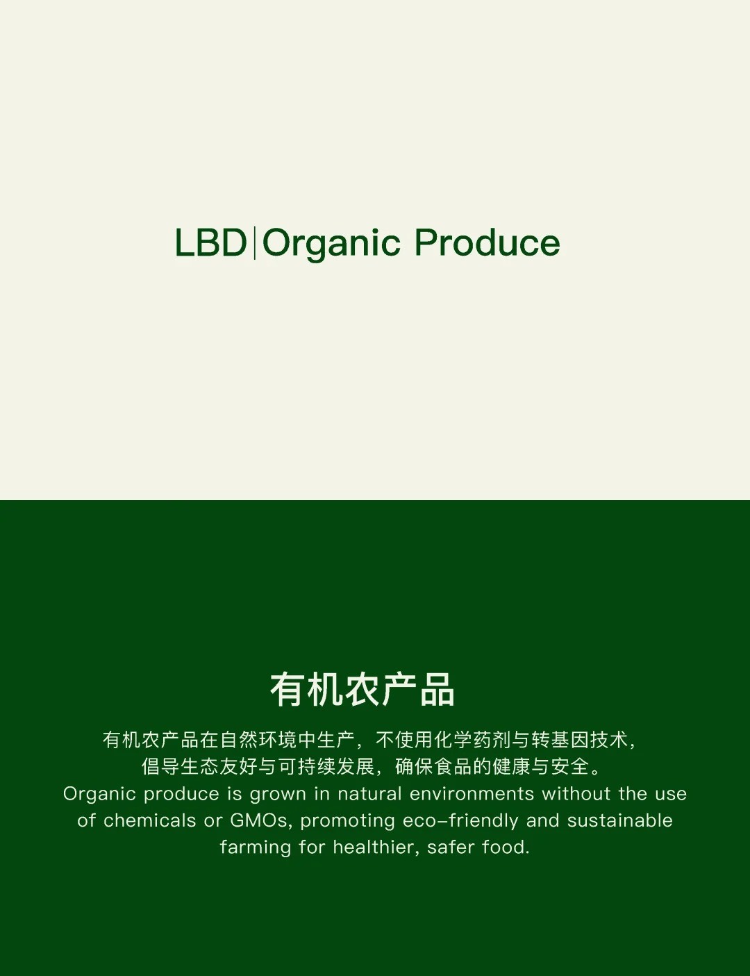 有机农产品 有机农产品在自然环境中生产,不使用化学药剂与转基因技术,倡导生态友好与可持续发展,确保食品的健康与安全。 Organic produce is grown in natural environments without the use of chemicals or GMOs, promoting eco-friendly and sustainable farming for healthier, safer food.