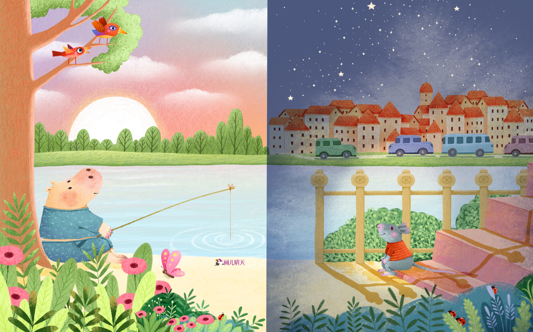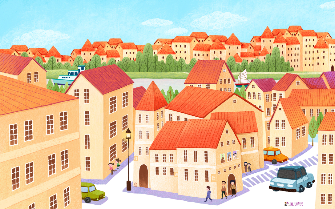 在艺术风格上,采用了简洁明快的插画风格,线条流畅,造型简约,具有较强的装饰性和现代感。这种风格使画面易于被大众接受和喜爱,同时也突出了小镇的纯真与美好。
