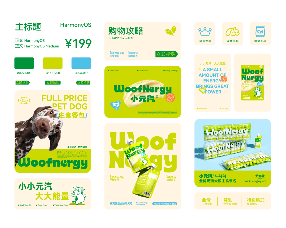 整体品牌色彩以明亮的黄色为主色调。黄色是一种充满活力与欢快的颜色,能够迅速吸引目光,象征着宠物充满生机的状态以及产品所带来的积极能量。同时,黄色也给人一种温暖、友好的感觉,拉近品牌与宠物主人之间的距离,体现出对宠物的关爱之情。辅助色绿色则代表着自然、健康,暗示产品的天然原料和安全品质,让宠物主人放心选择。