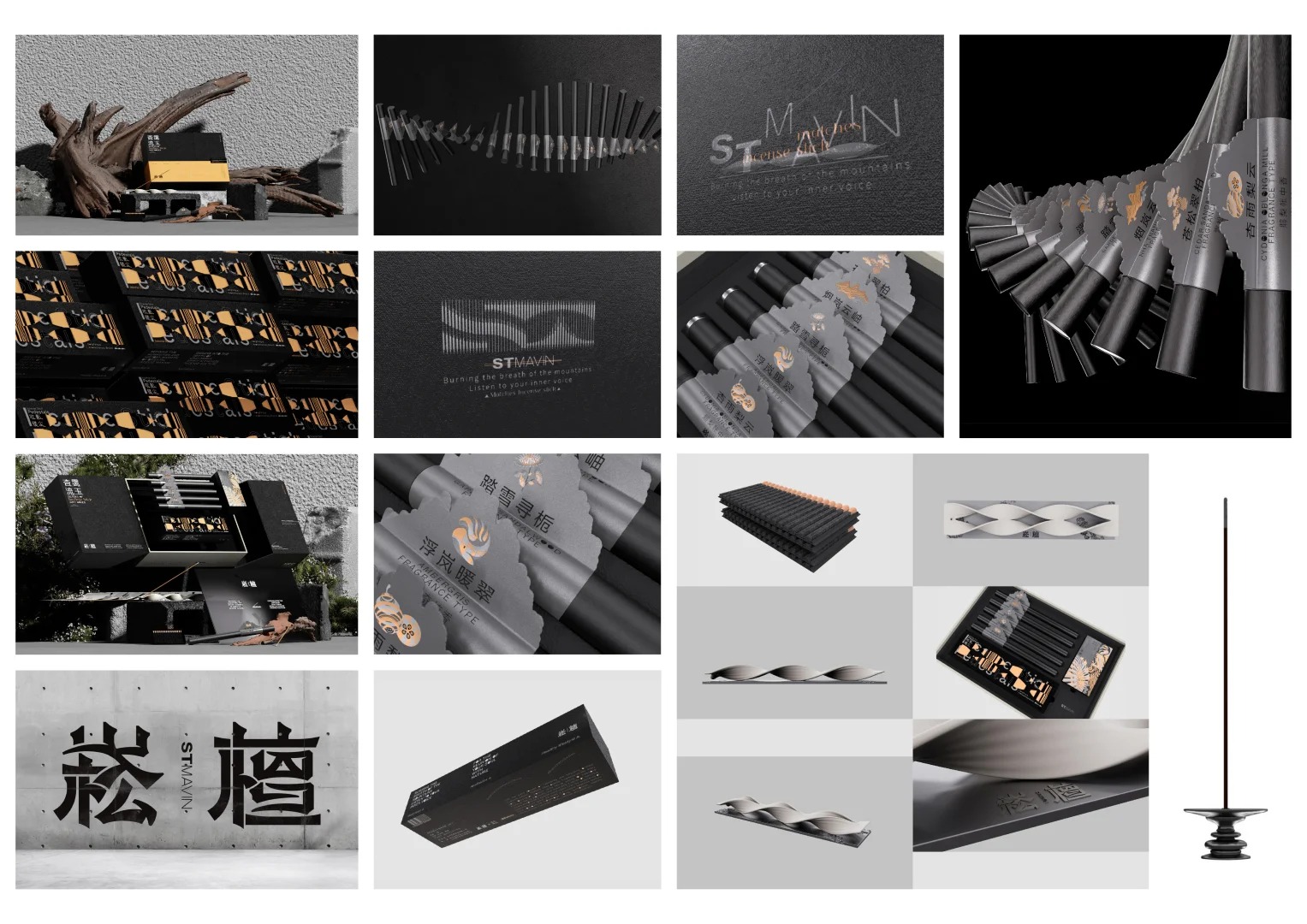 作品描述:崧檀-STMAVIN以“重塑并传承东方香文化”为品牌理念,包装将东方香作为切入点,品牌的字体、图形、版式、包装的设计以多维度构成的形式进行设计,品牌在体现当代的设计语境的同时又能提炼东方香的人文历史温情,挖掘中国香文化中工匠精神的深度, 研究东方香设计中的传统与当代的关系,思考形式和功能的关系。