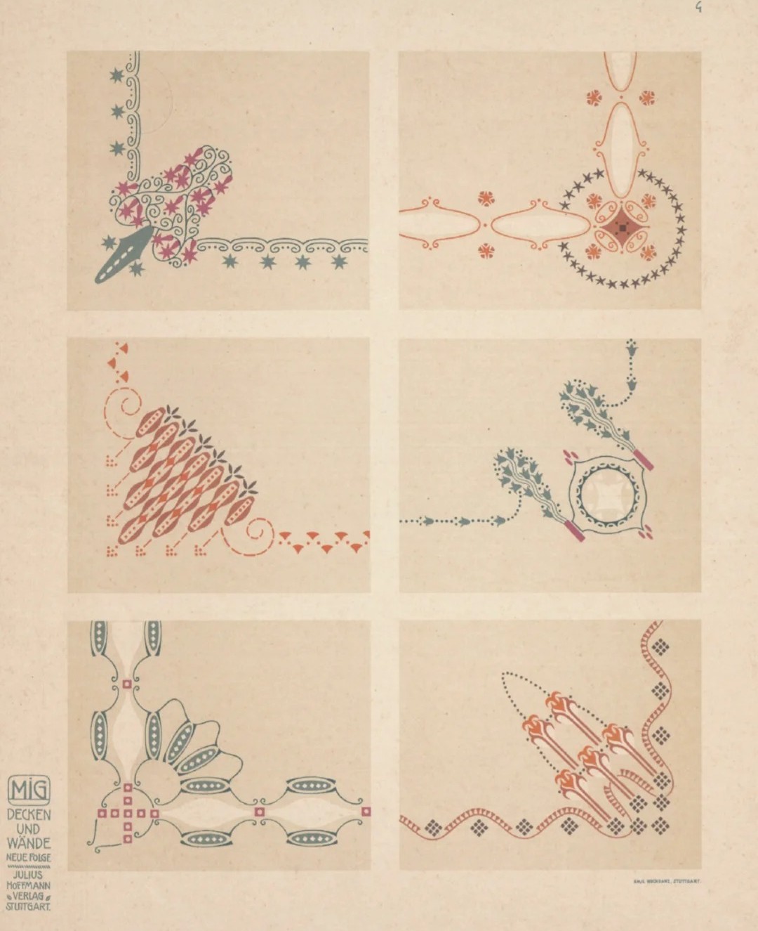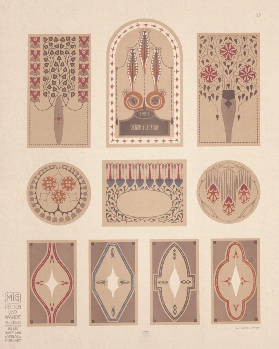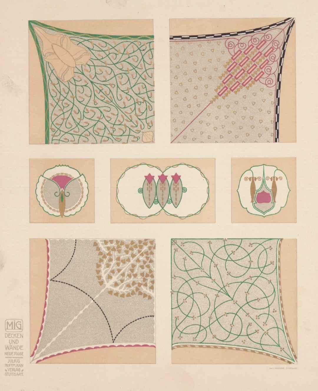 本组分享选自德国出版的设计图集《现代住宅的天花板与墙壁》,1907和 1908年分别出版1卷,共2卷,分别共收录了 24页图版,提供了适用于现代住宅的天花板和墙壁装饰设计范例,风格以新艺术为主,优雅异常。 作者马克斯·约瑟夫·格拉德尔(Max Joseph Gradl,1873-1934) 是德国画家、建筑师、字体和珠宝设计师。格拉德尔在慕尼黑应用艺术学校求学,师从特奥多尔·施皮斯。他是一位多才多艺的设计师,其作品涵蓋了新艺术风格的字体、书籍封面、藏书票等,尤其以其设计的新艺术风格珠宝而闻名。