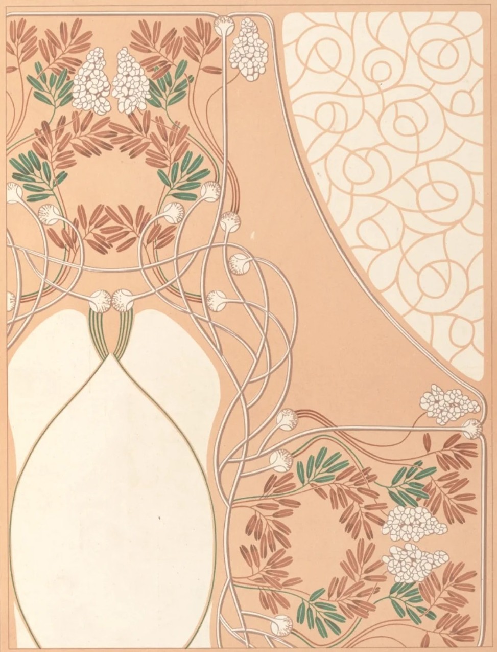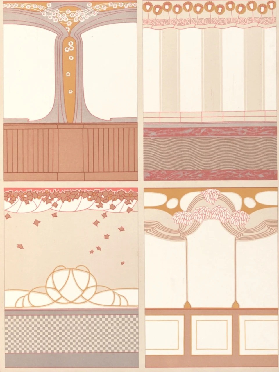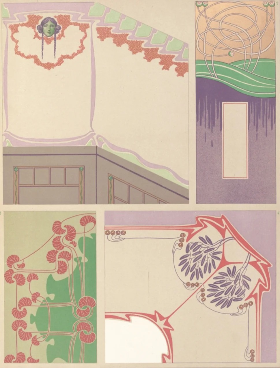 本组分享选自德国出版的设计图集《现代住宅的天花板与墙壁》,1907和 1908年分别出版1卷,共2卷,分别共收录了 24页图版,提供了适用于现代住宅的天花板和墙壁装饰设计范例,风格以新艺术为主,优雅异常。 作者马克斯·约瑟夫·格拉德尔(Max Joseph Gradl,1873-1934) 是德国画家、建筑师、字体和珠宝设计师。格拉德尔在慕尼黑应用艺术学校求学,师从特奥多尔·施皮斯。他是一位多才多艺的设计师,其作品涵蓋了新艺术风格的字体、书籍封面、藏书票等,尤其以其设计的新艺术风格珠宝而闻名。