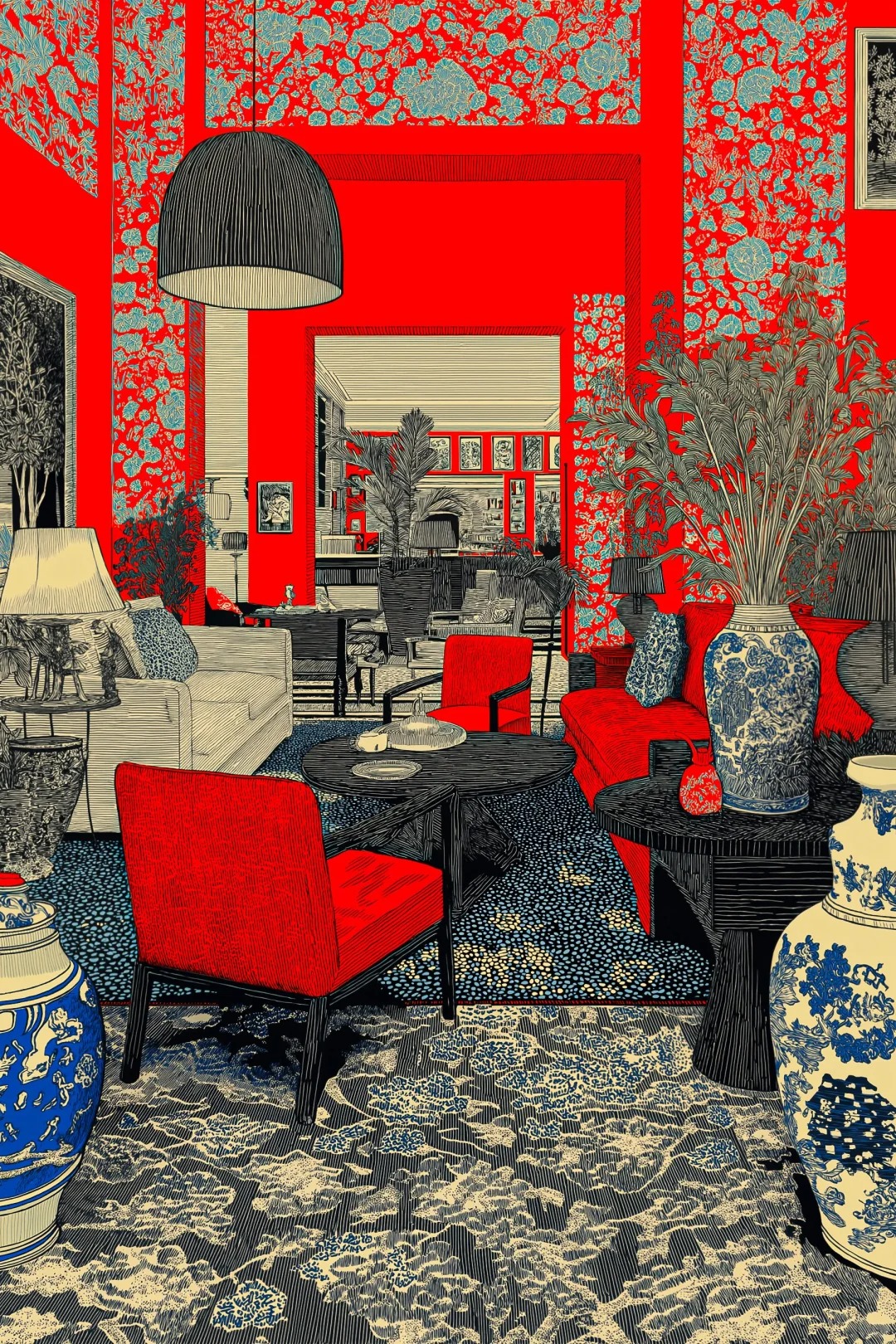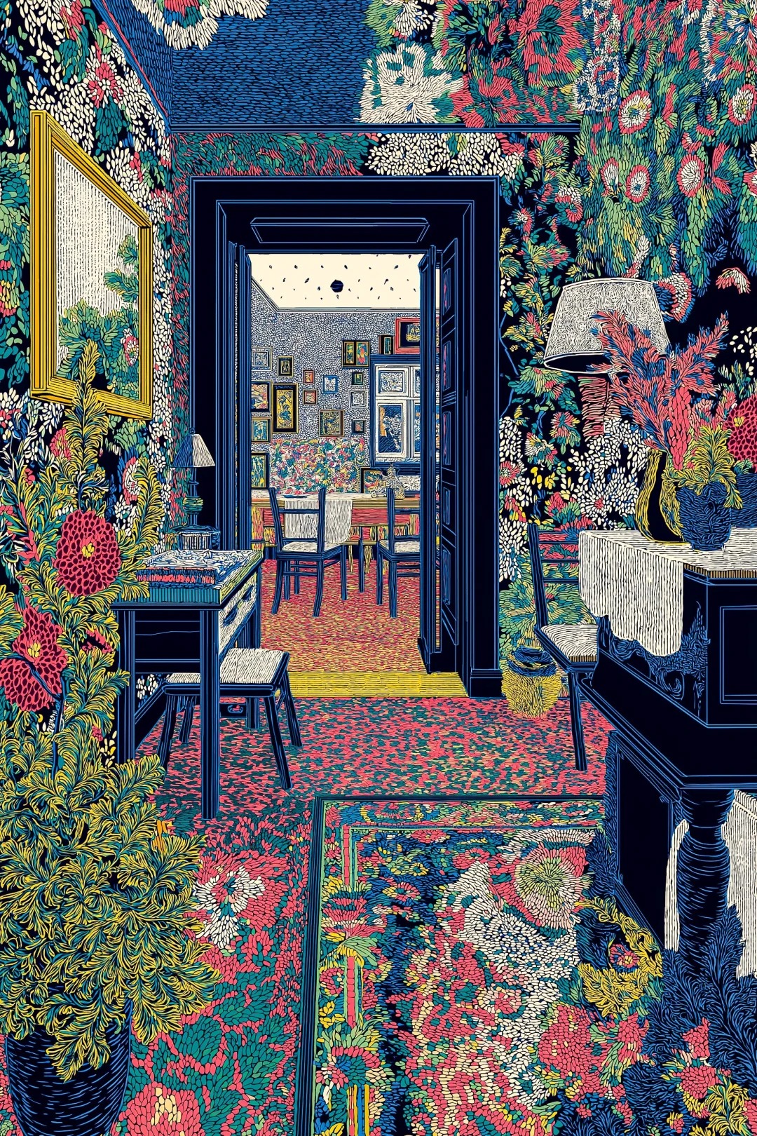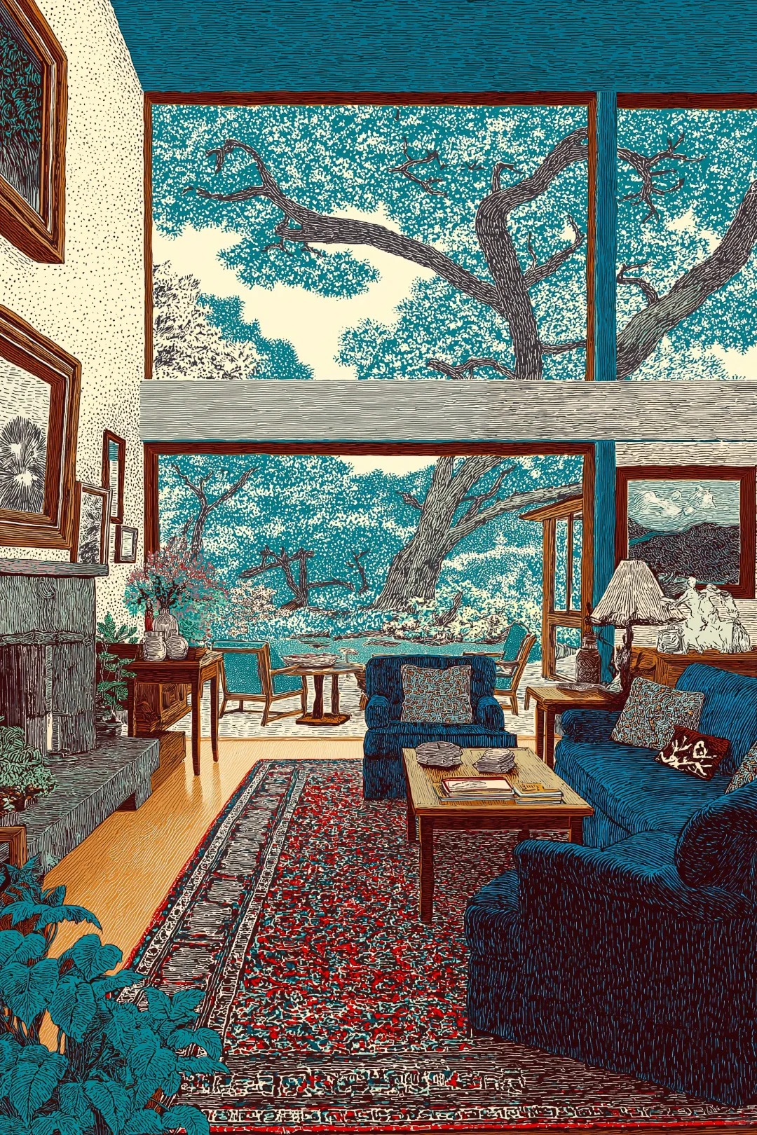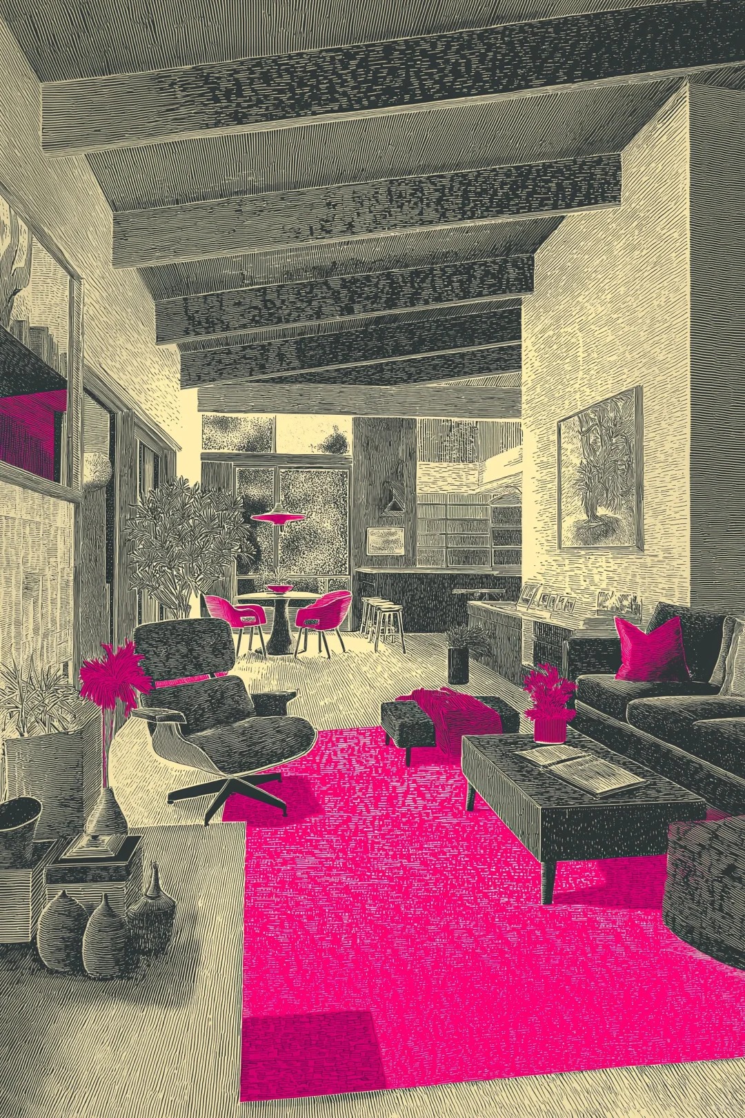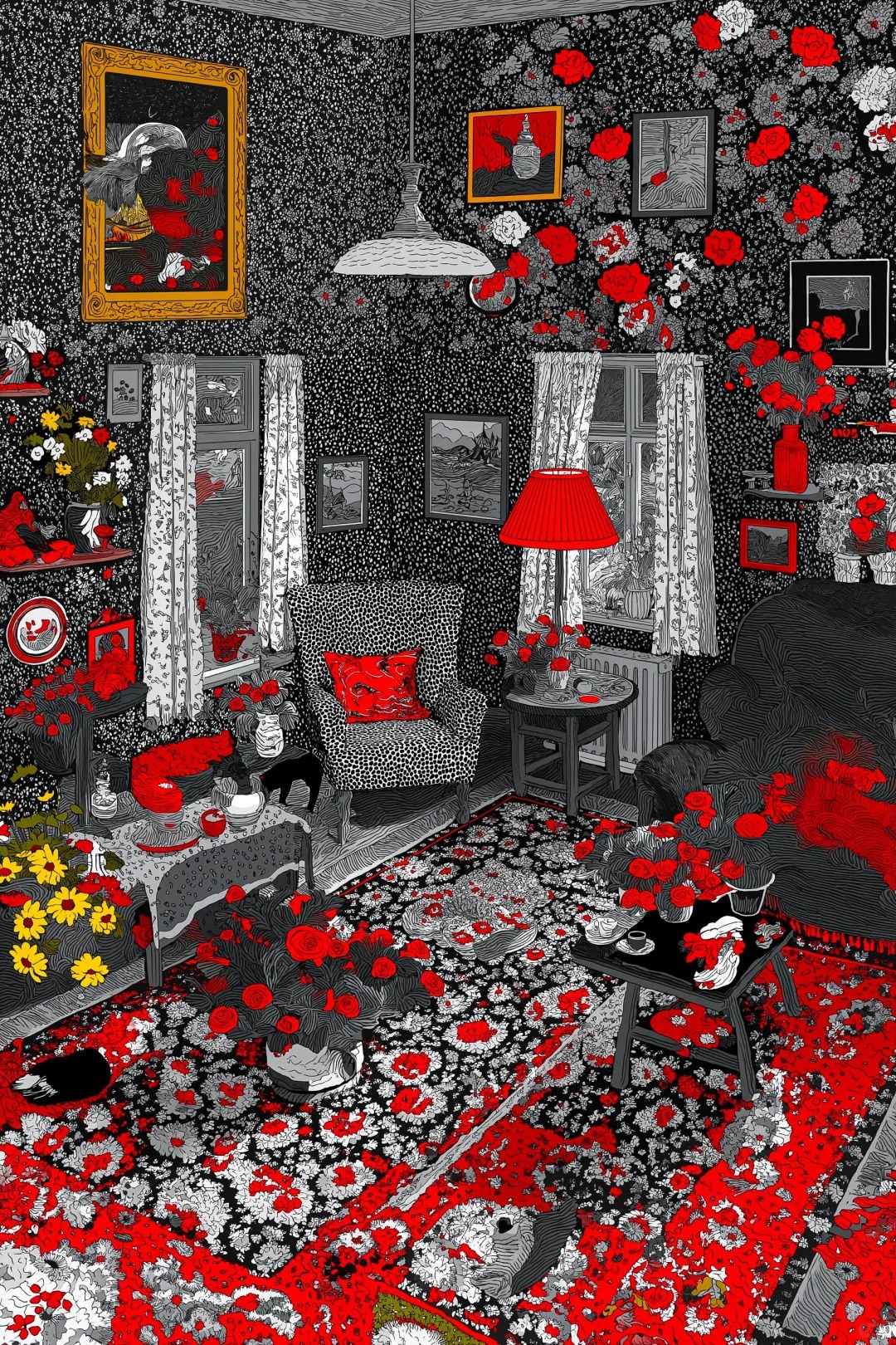 By 数字艺术家 Richard Nadler 系列融合复古线稿艺术与家居美学,以细腻线条勾勒不同风格的室内场景