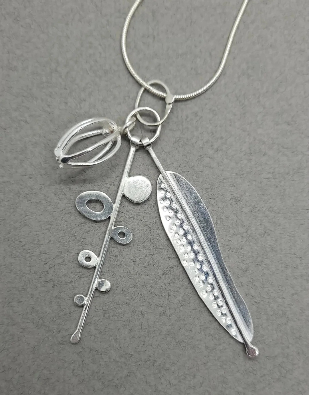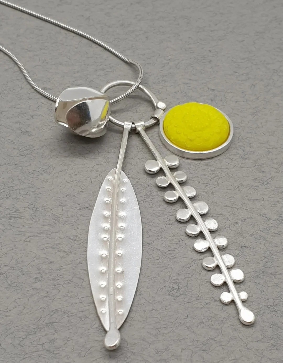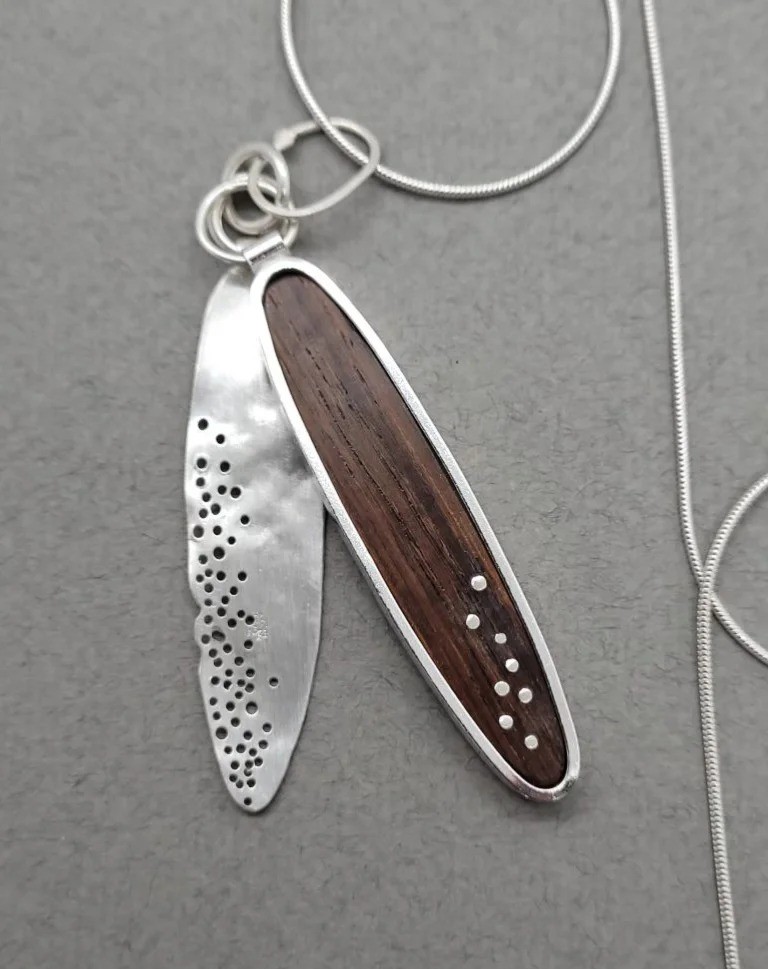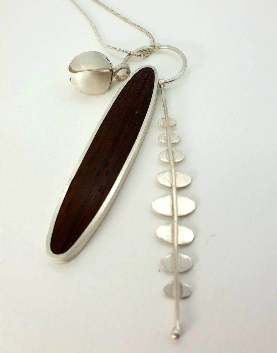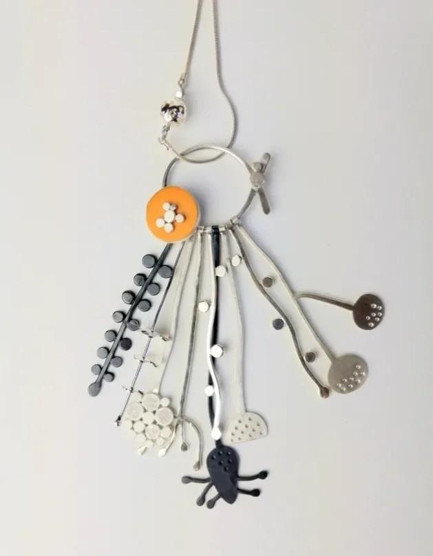 Charlotte 的作品以“自然系植物意象”为灵感,取材于约克郡荒原与河畔的花草、种子等形态,常将银与复古塑料、木材、玻璃等材料结合,展现出有机、轻盈且充满手工质感的自然诗意。她在材质上巧妙融合银与彩材,以植物、种子与风动为形态语言,运用滚压印纹等技法在银面上再现植物的肌理与韵律,使自然的灵魂以首饰之形重生——作品宛如微型植物雕塑,兼具艺术感与生命力。她以自然植物为诗,以金属为笔,在自由与秩序交织的首饰世界里,书写生命的温柔与力量。