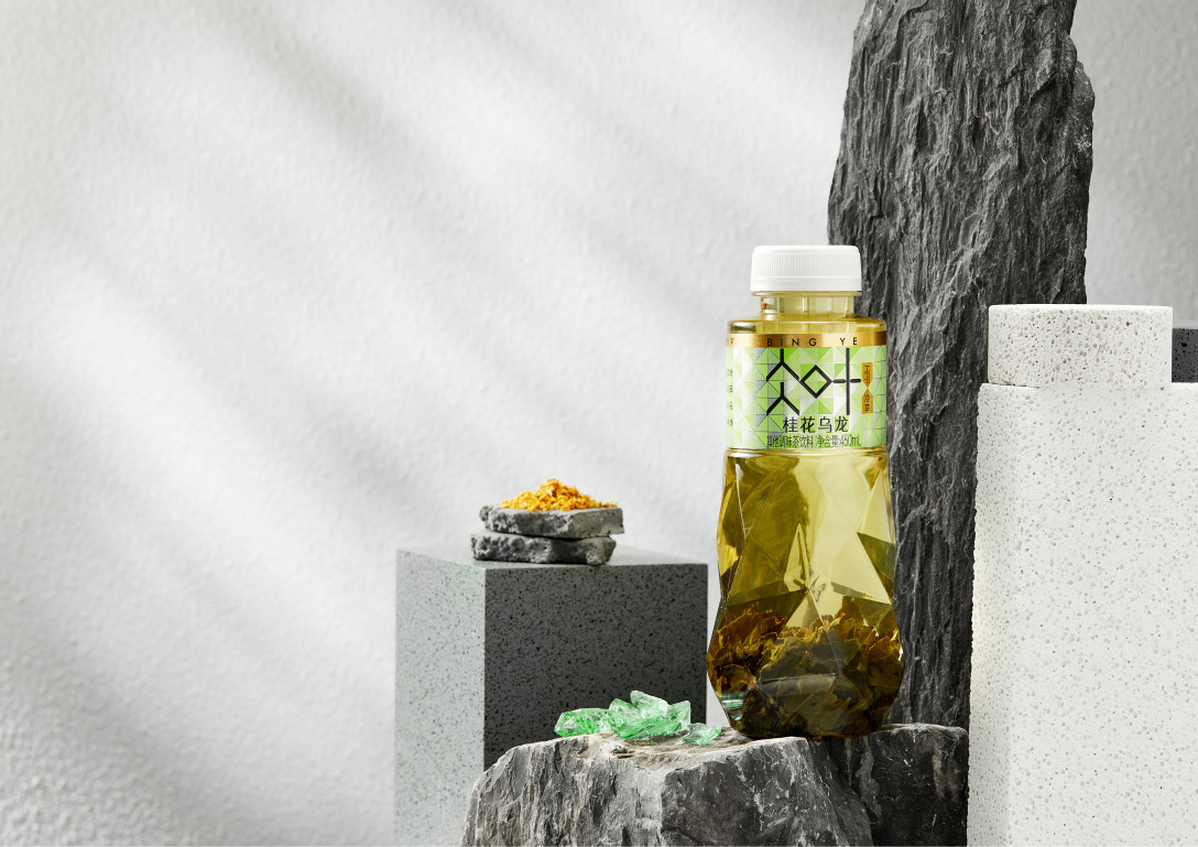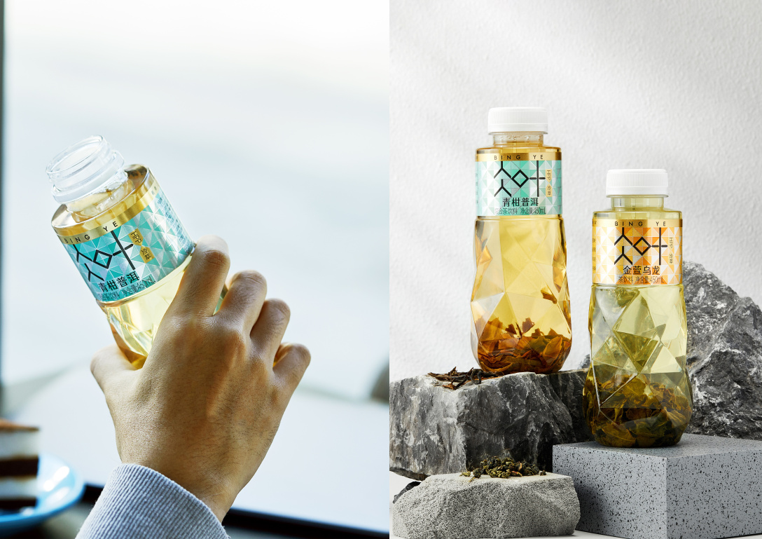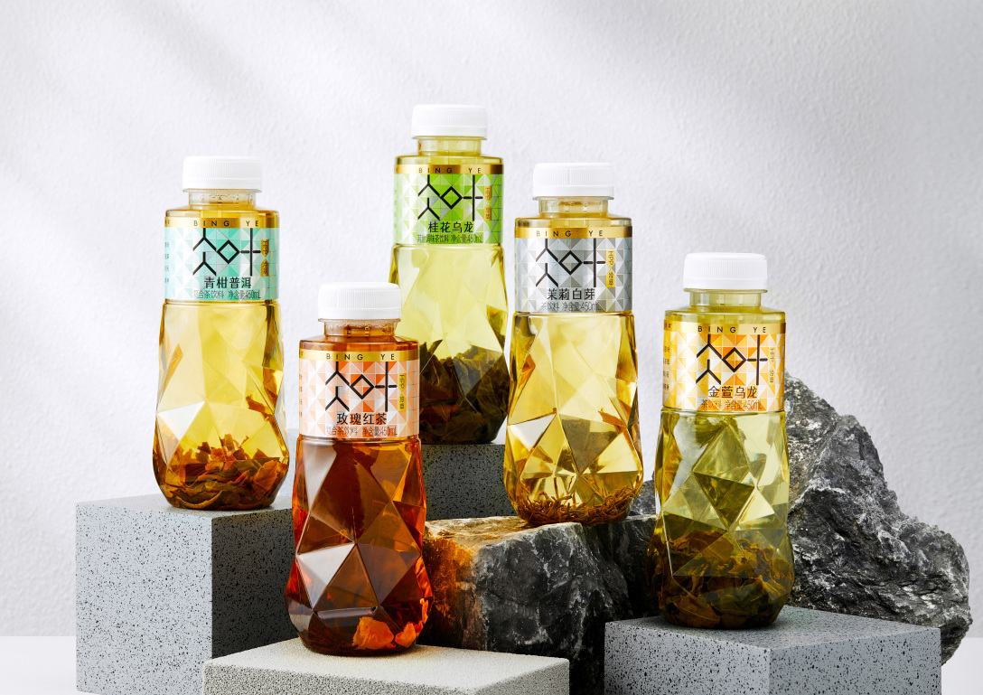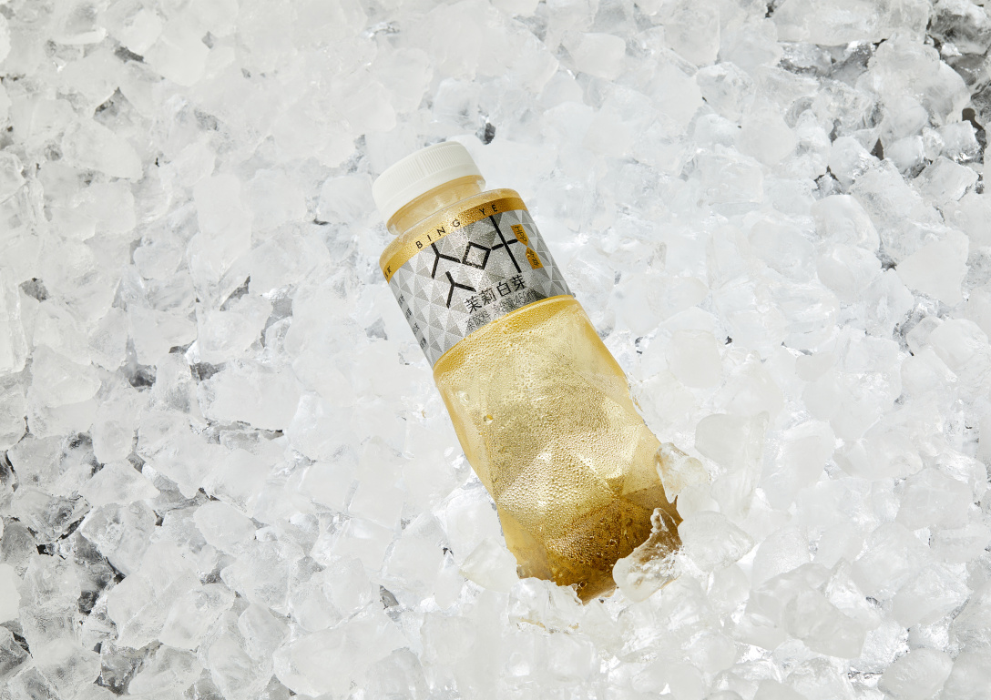 设计创意源于 “茶叶凝于冰中” 的意象。我们以 “仌叶” 品牌标志为视觉基础,将其延伸为冰格纹理,与瓶身造型无缝融合。标签印刷环节则采用局部烫银等工艺,既增强了包装的质感,也进一步提升了产品的高端调性。