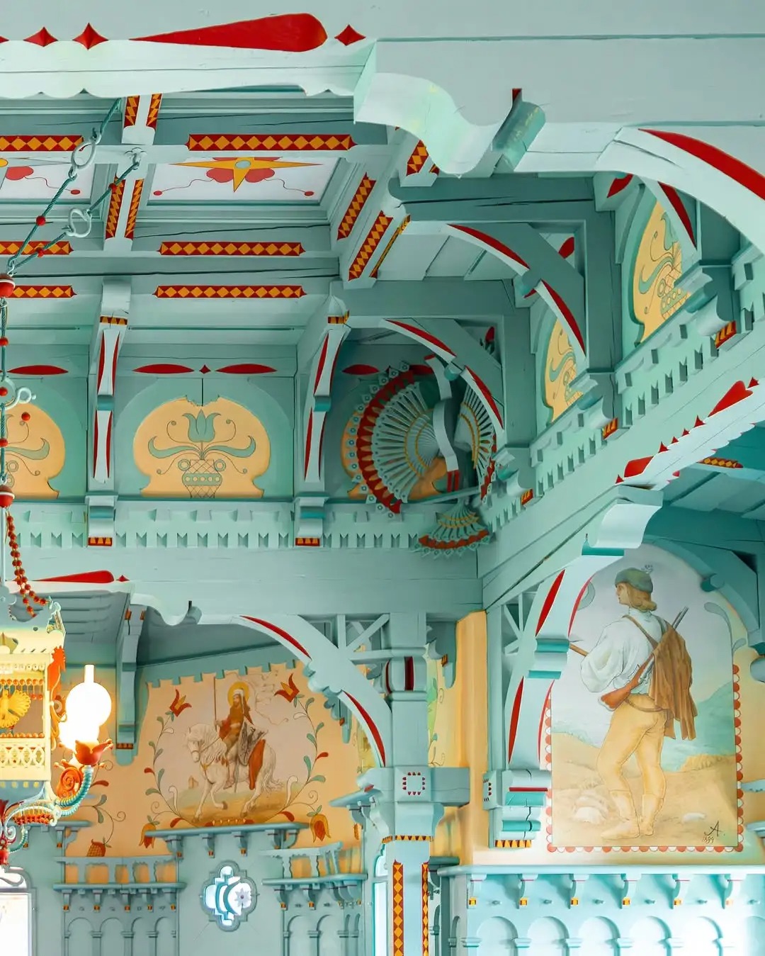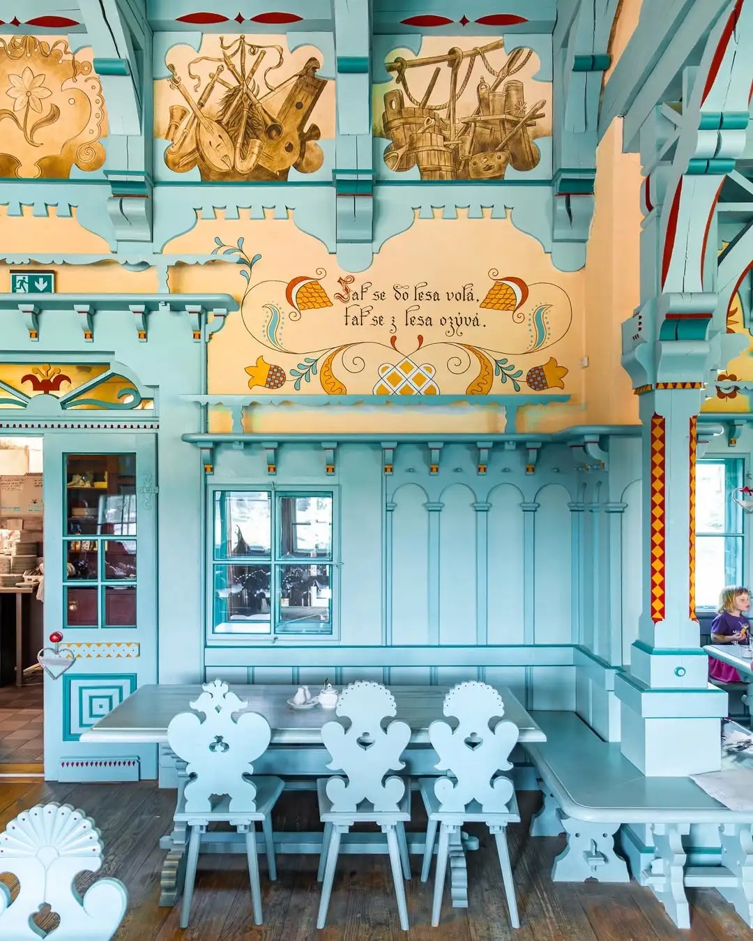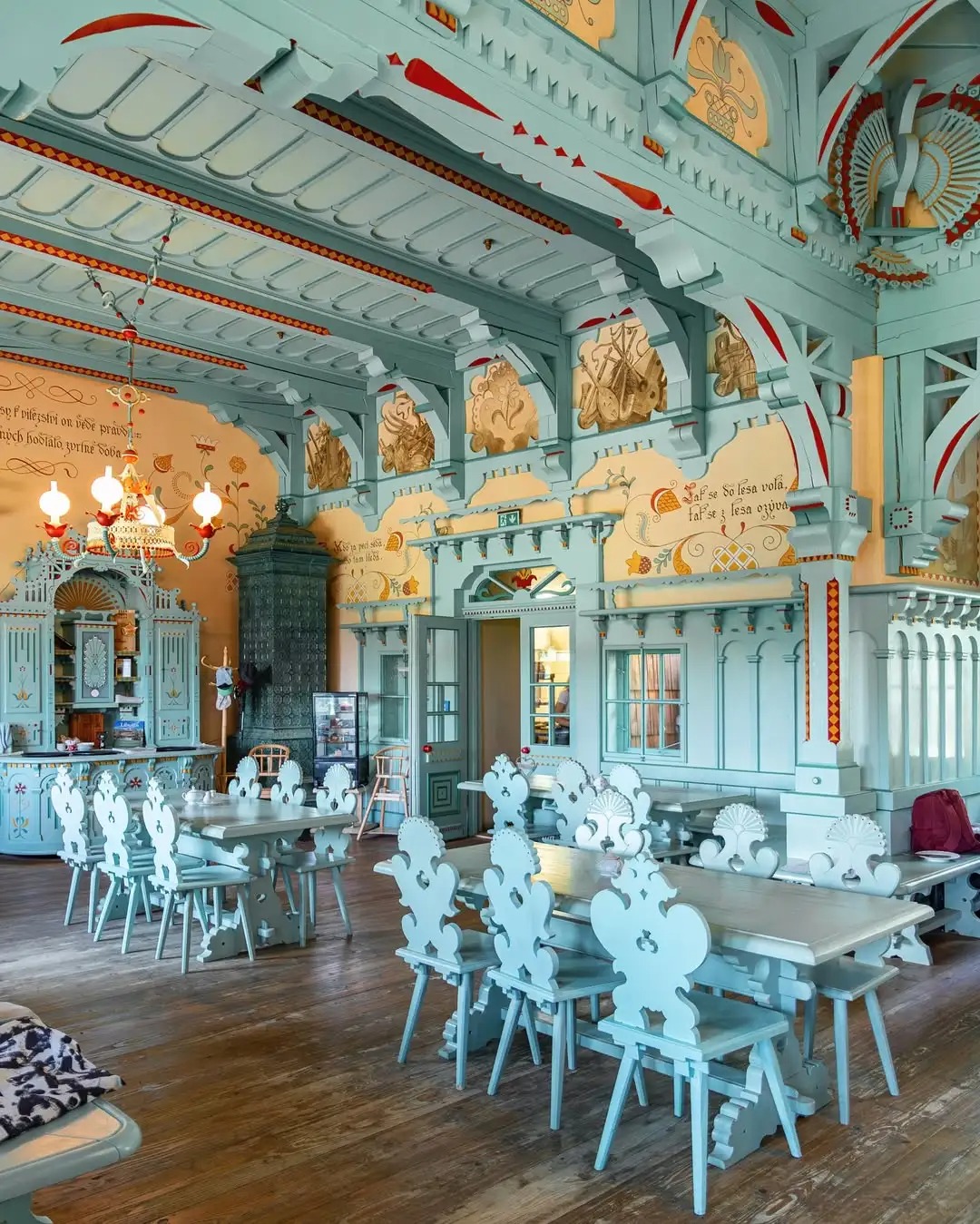 Libušín a mamunka是一座民间艺术小屋和酒店,直接来自斯拉夫童话故事。但这种迷人的住宿也适用于非神秘劝说的高山客人,这座小屋和酒店由捷克建筑师Dušan jurkovije于1899年建造,他被称为“木材诗人”,是捷克斯拉夫遗产和新艺术风格的结合。 餐厅尤其以新艺术风格的枝形吊灯和壁画为特色,装饰着当地传说的图案。 在20世纪中期经历了一段时间的忽视和失修之后,这两座建筑被精心修复,并被命名为帕斯提夫尼山城的国家文化古迹。