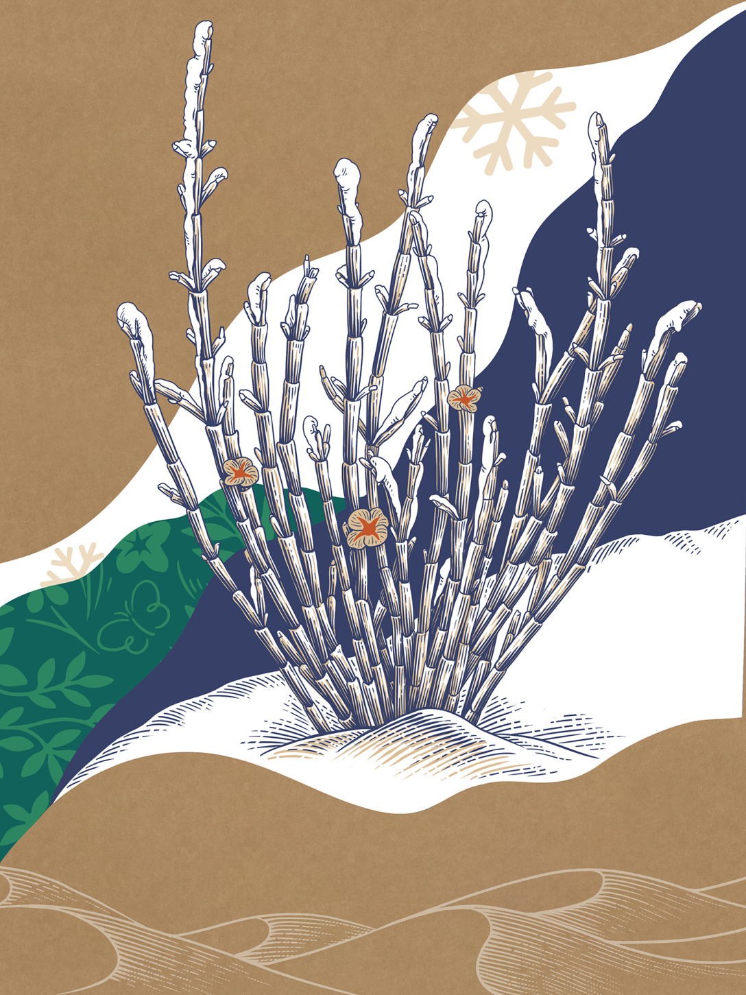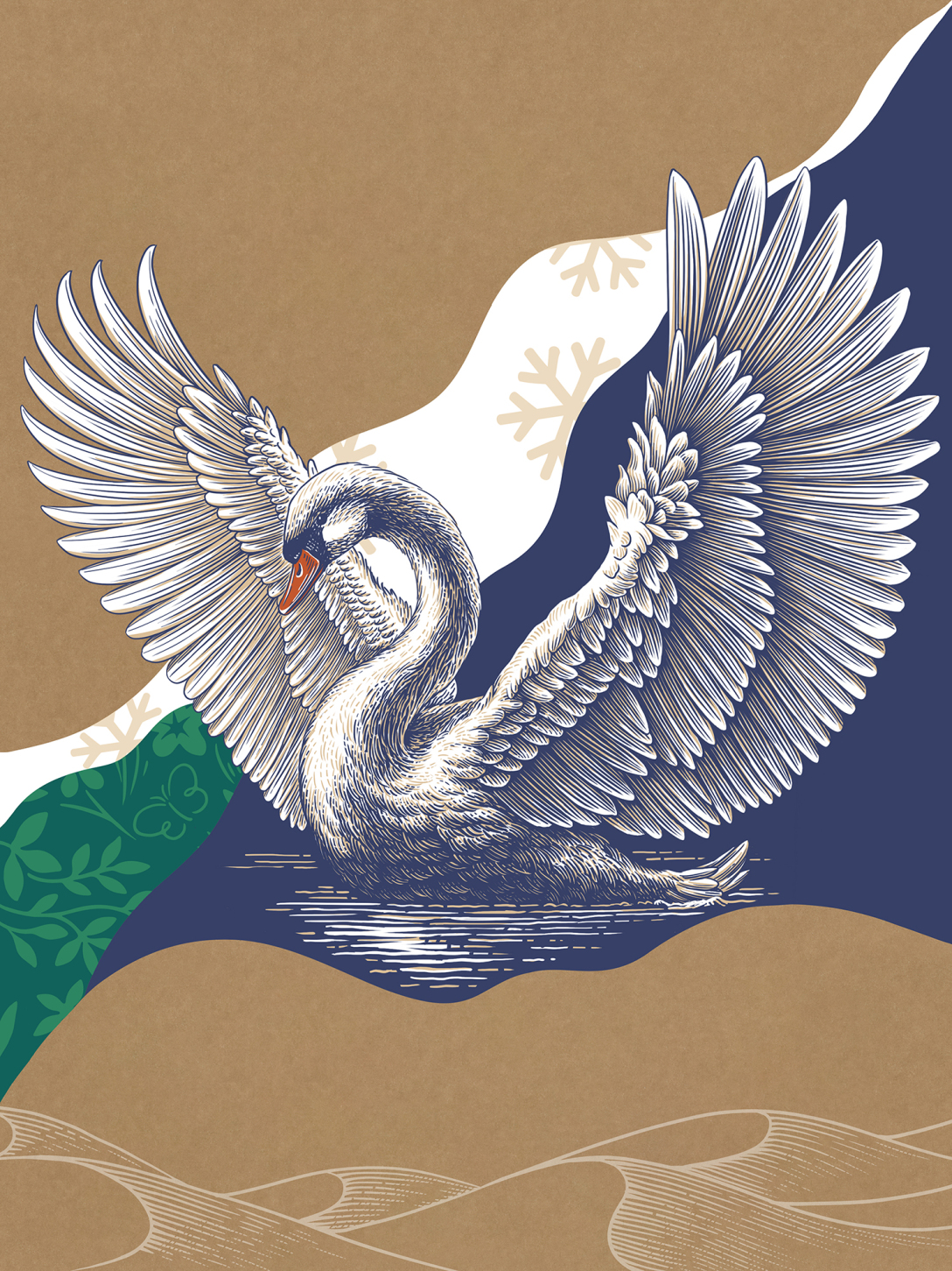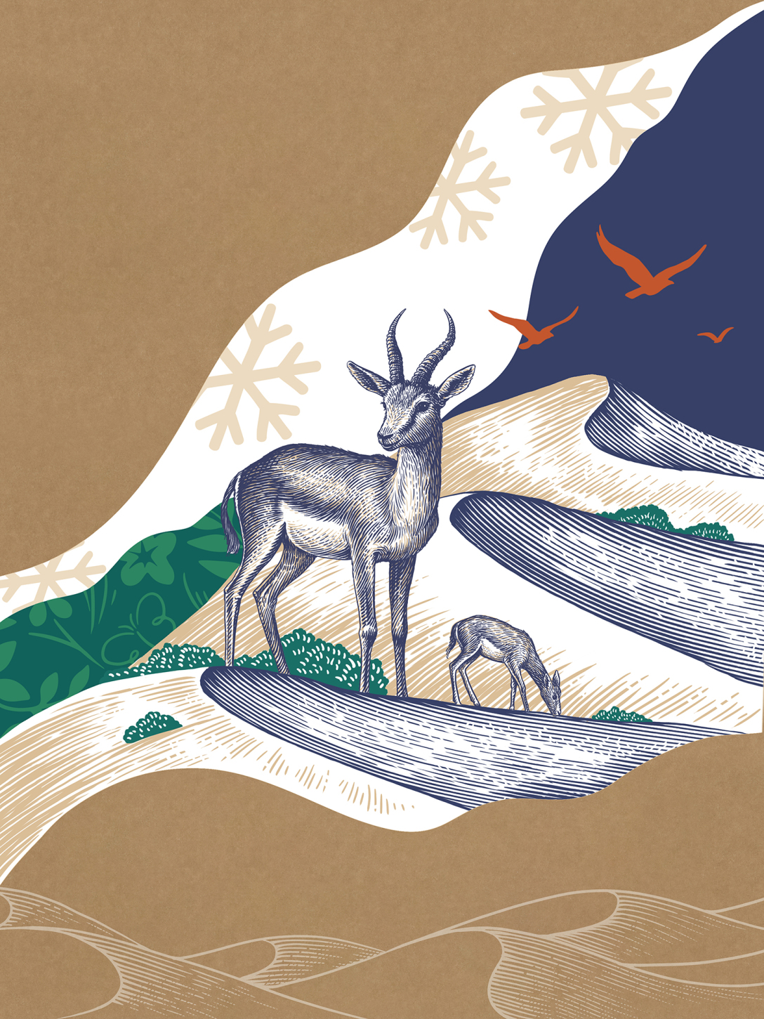 用艺术插画讲述品牌故事,每年立冬之后,天鹅都会迁徙至此,它们见证了沙漠变绿洲,雪落沙漠,孕育更好营养,纯净生态,成就更好有机。