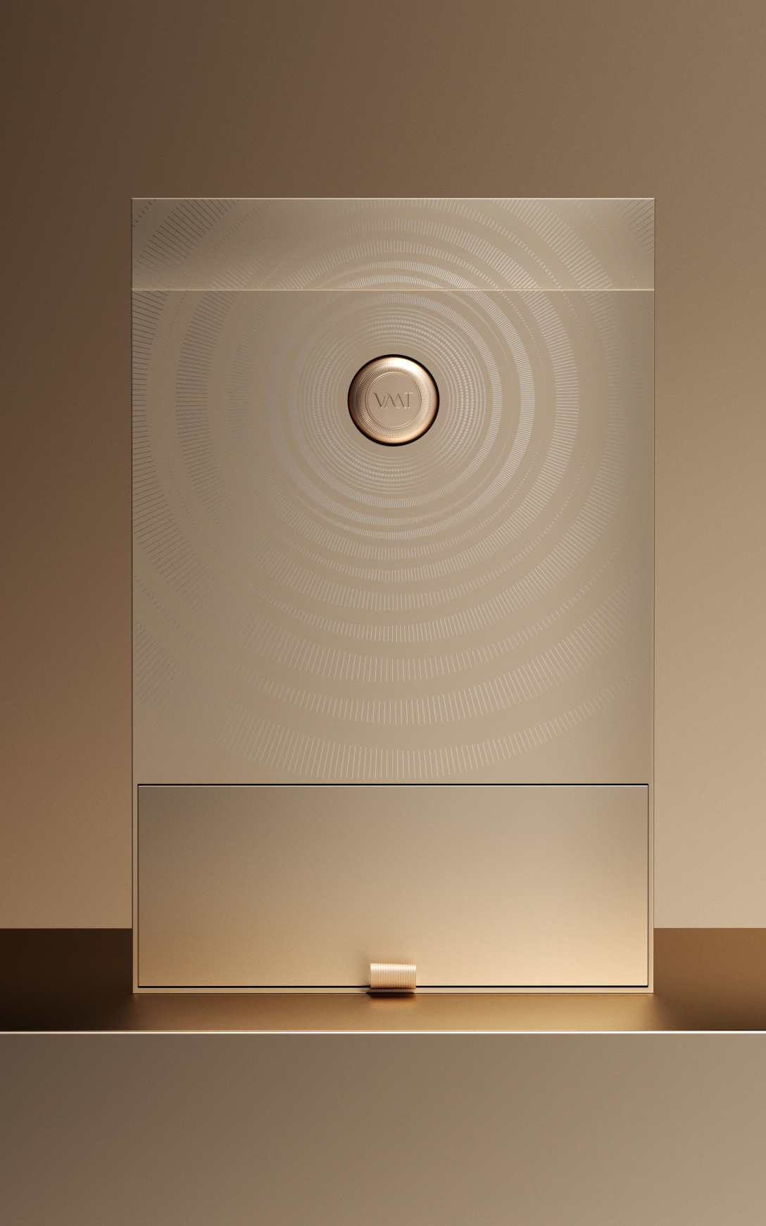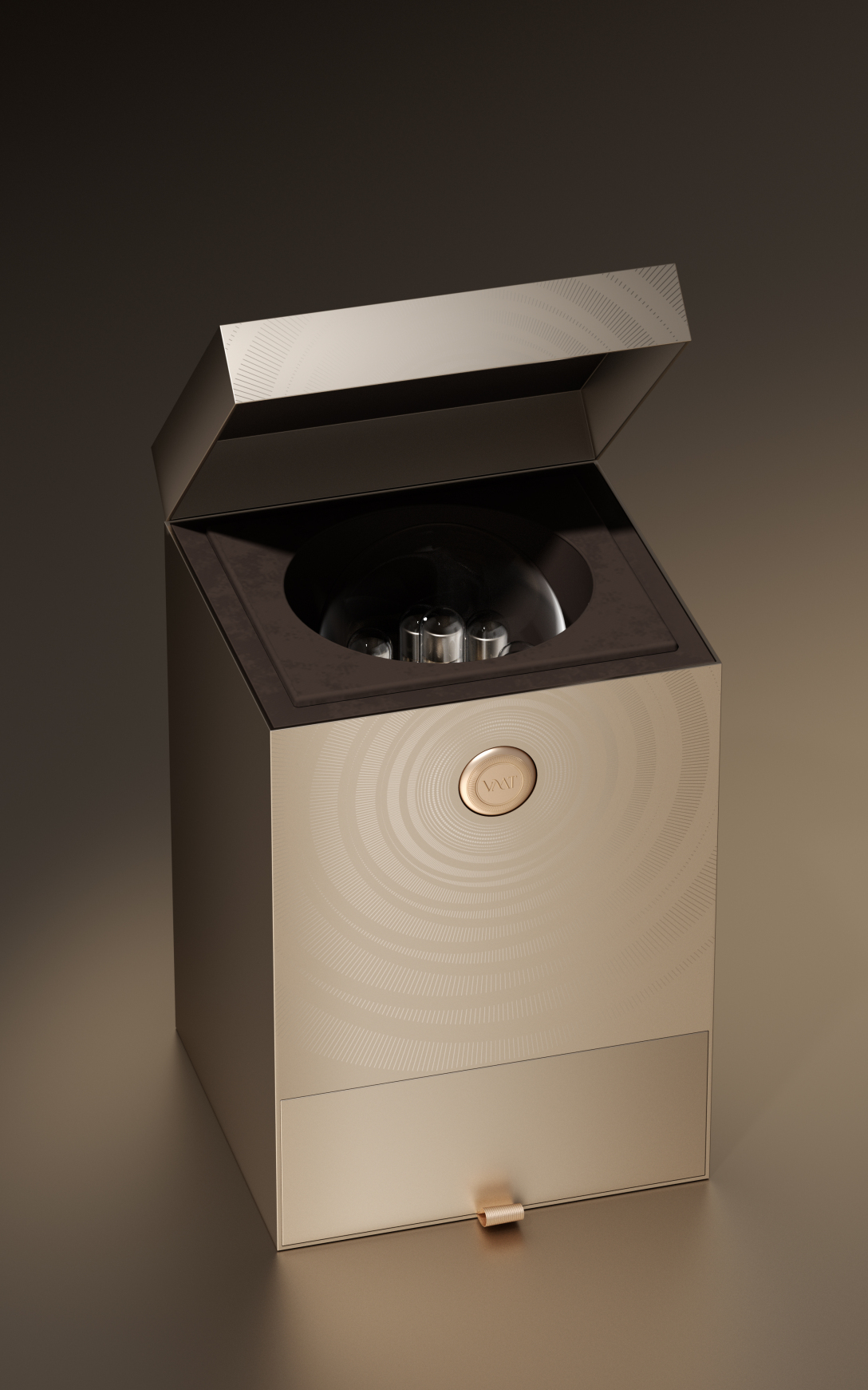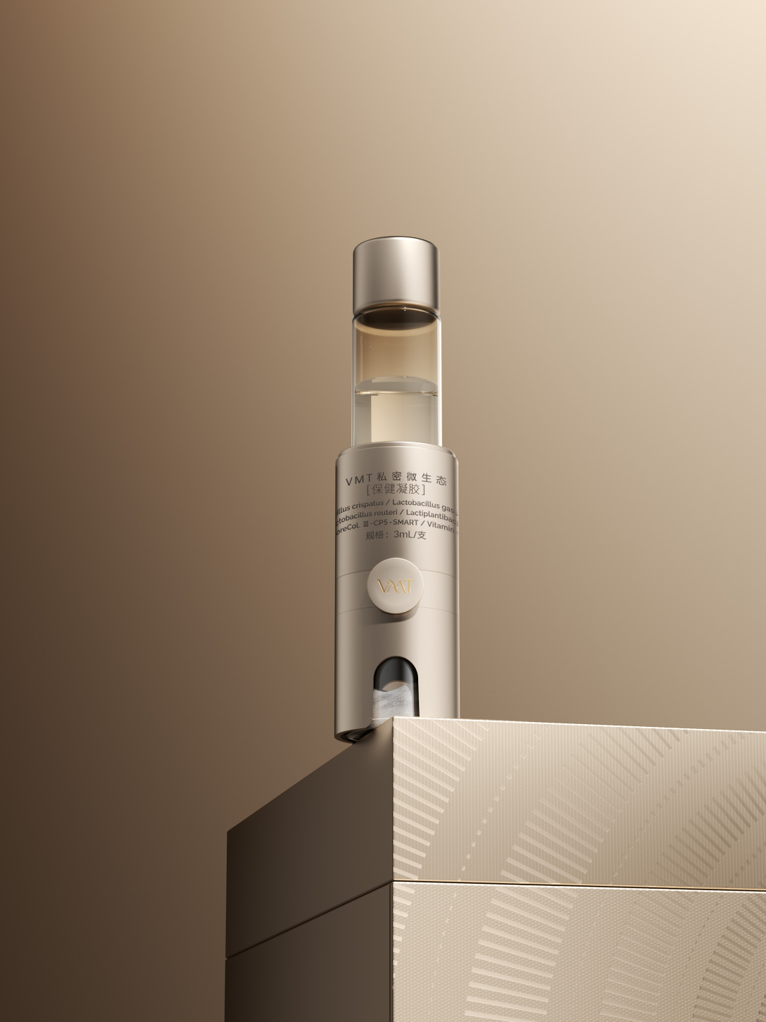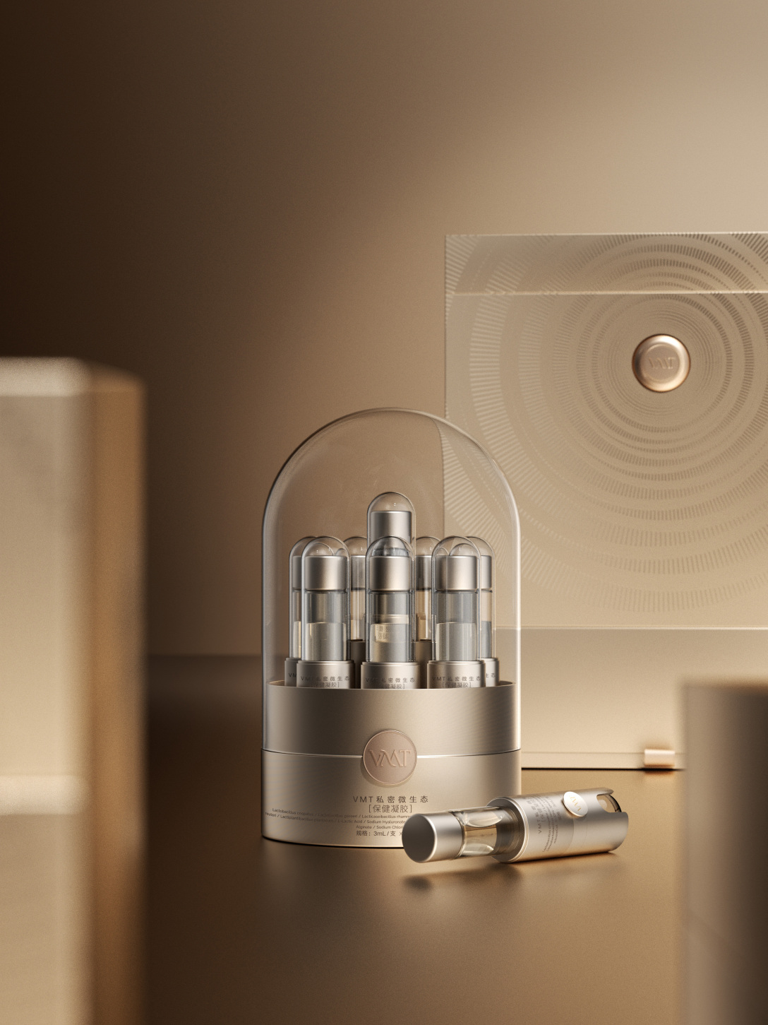 材质语言:定制金卡纸覆微浮雕工艺,模拟细胞矩阵的光泽肌理 开启仪式:磁控自动升降结构,开盒瞬间如启动精密仪器 色彩策略:流金与月白交织,呼应基因链的金色光泽 结构创新:双开门设计隐喻私密空间的尊属感 视觉符号:银卡纸叠加蓝紫渐变,如破晓时分的离子光晕 细节锚点:金属蚀刻LOGO与生物波纹底纹,强化科技信任状