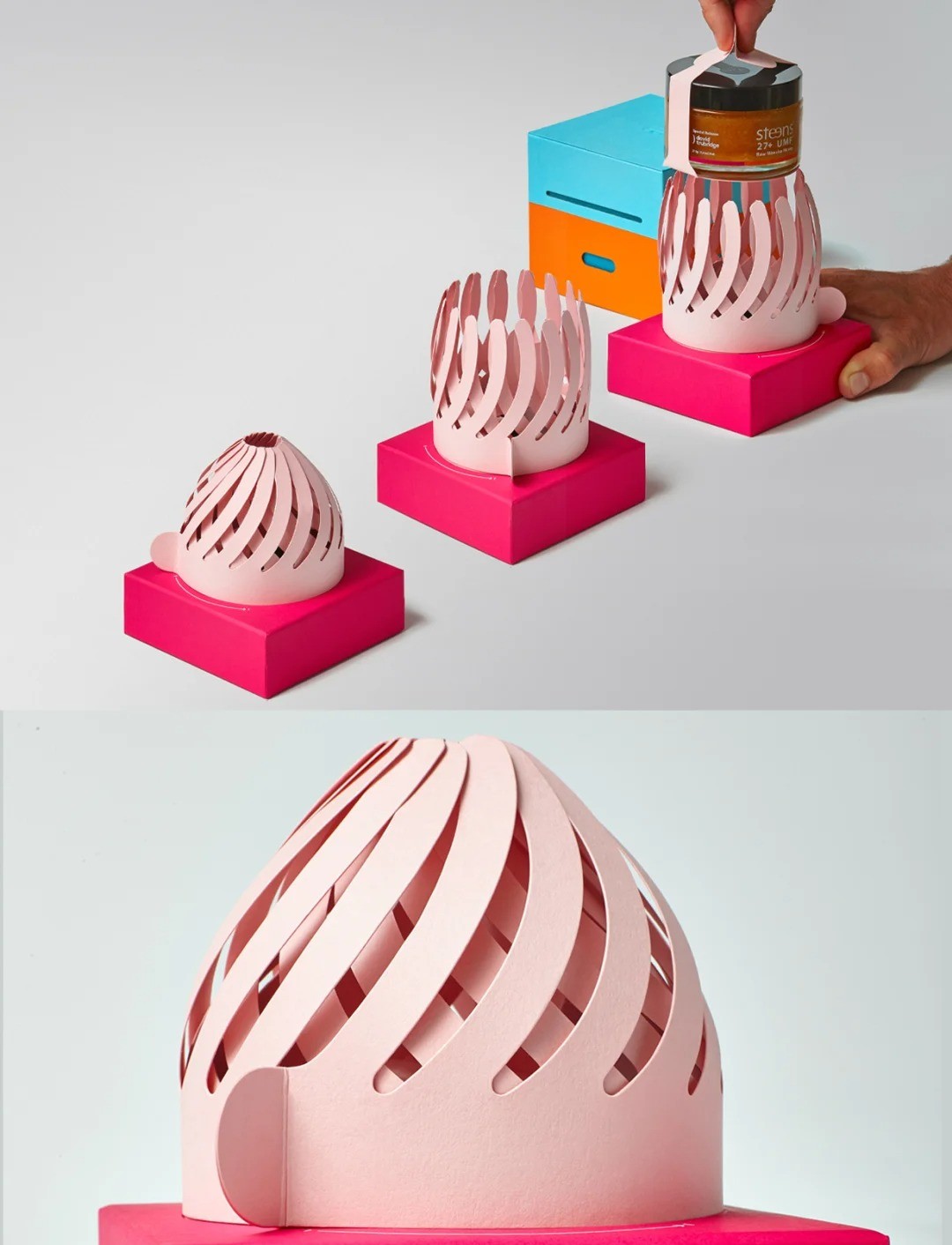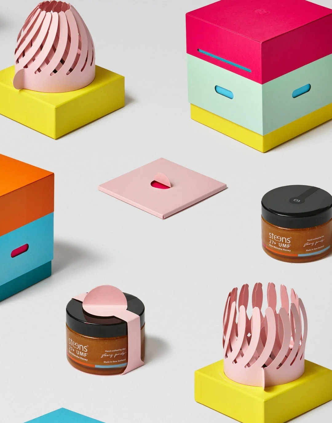从蜂箱本身汲取了蜂箱设计的灵感;通过将明亮有趣的花卉颜色与新兴且竞争激烈的麦卢卡蜂蜜类别中的所有黑色和金色包装进行对比,吸引高端购物者的注意,就像蜜蜂被花朵的鲜艳颜色所吸引一样。Steens还想分享他们对产品的热情和喜悦,以及在收集蜂蜜时打开蜂箱的过程。首要目标是挑战现状,通过使其成为一种独特而难忘的拆箱体验,与消费者建立情感联系。