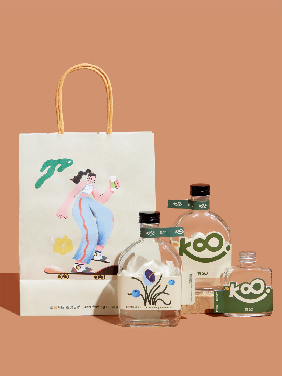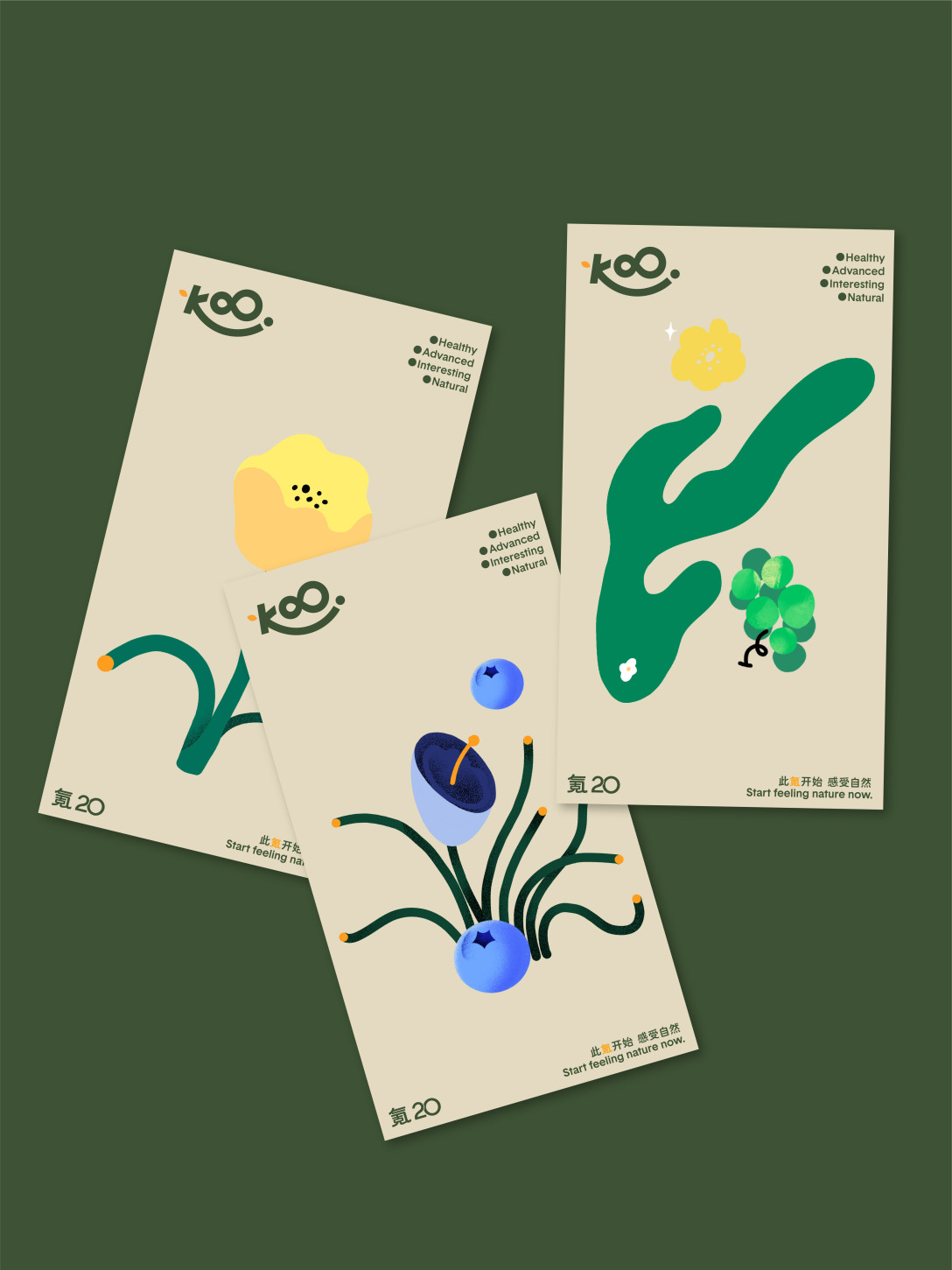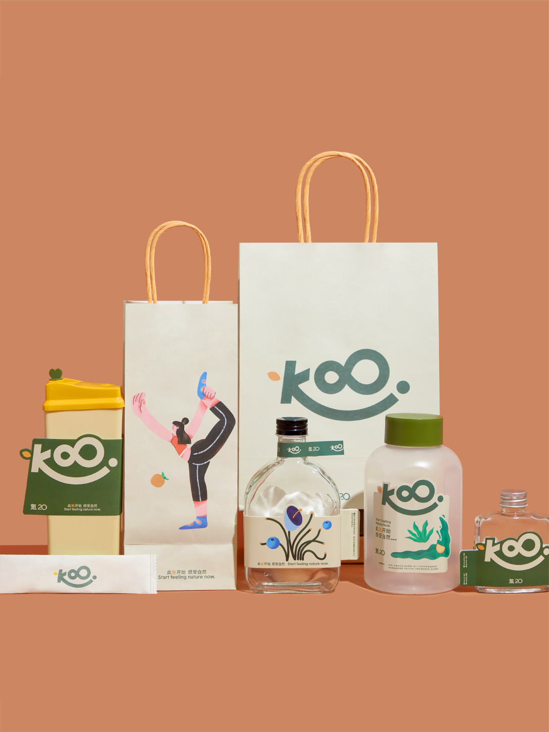 品牌符号中,从品牌的名称出发,以 K 字母为切入点,做演变延伸,同时为了满足图形注册的需求,把 20 字面意义放开,加入健康循环的理念,让整个图形变得灵动舒展,像是有个人在奔跑的感觉。 很密切的贴合“ 此氪开始,感受自然”的 品牌slogan。 同时在品牌形象中融入整体轻松自然的插画形象,来凸显亲和力以及趣味感。色彩的定义:回归到自然有机的本色,没有选用很明显的亮色来展示,而是选用可以体现生活化的场景来打造整个品牌。目的也是为了凸显整个品牌自然高级的理念。