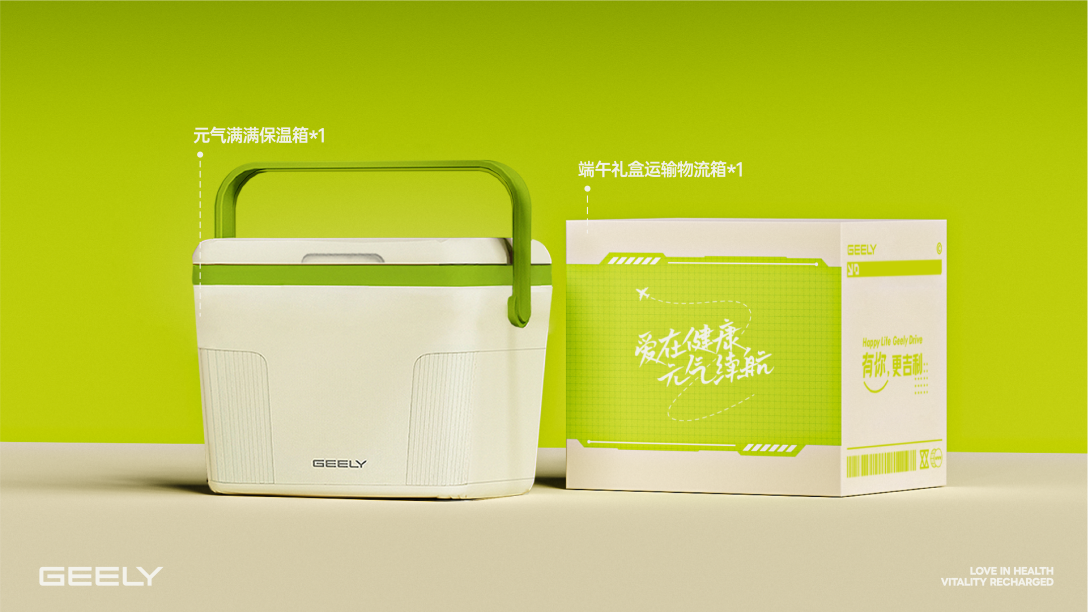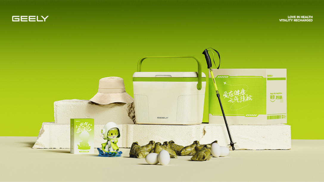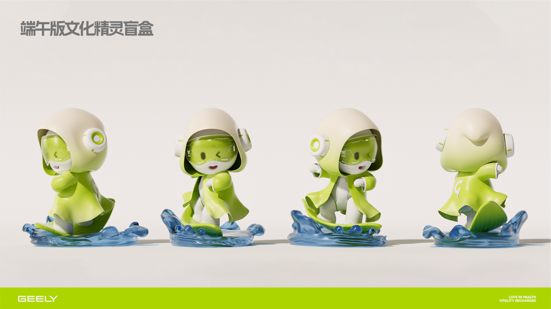 '五月五,端午节“文化精灵身穿带有生命气息的绿色魔法斗篷,乘坐粽叶小舟乘风破浪而来,为吉利人带来端午的贺礼:吉利人对健康与自然的向往,对未知世界的探索与冒险,寓意着吉利人在生活的道路上乘风破浪、风调雨顺、步步高升。