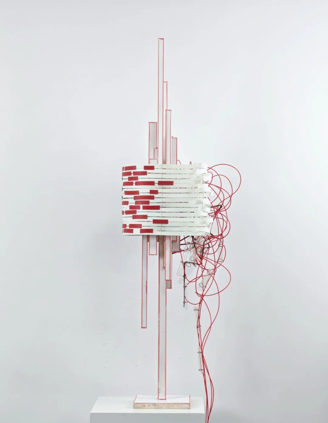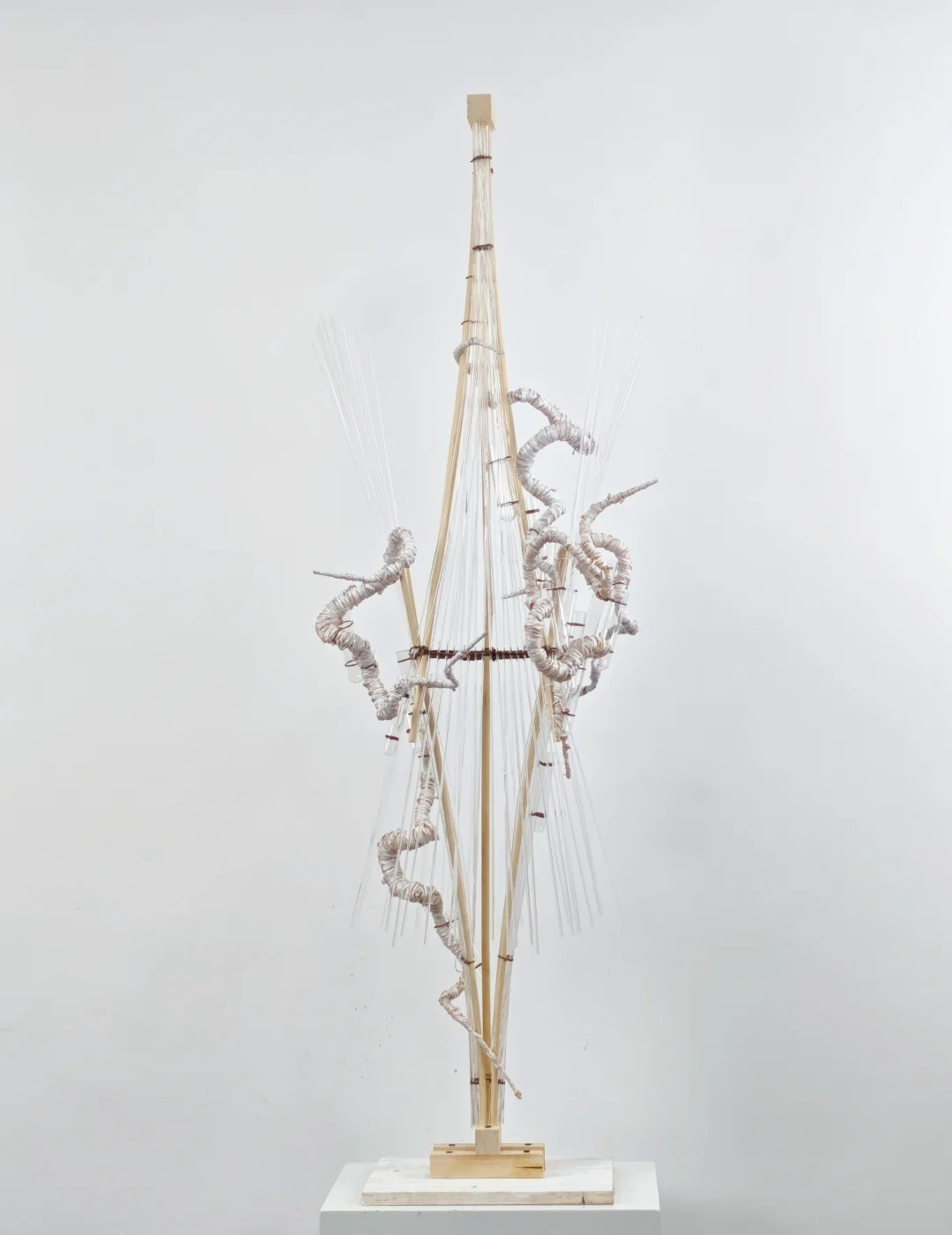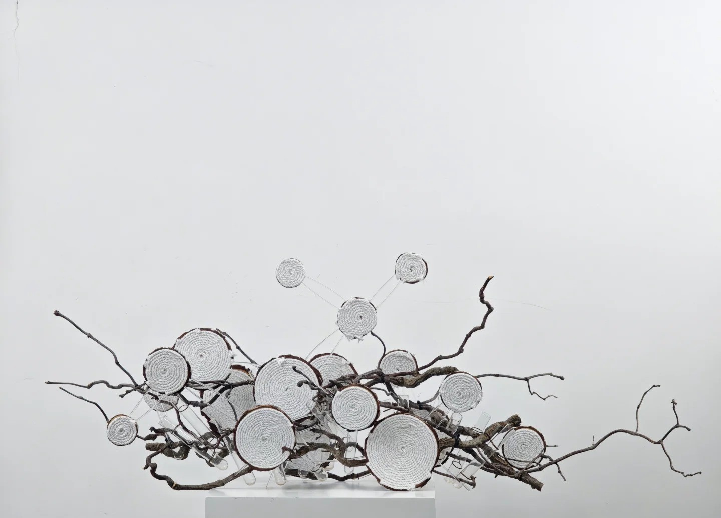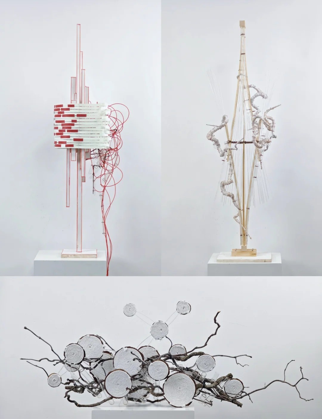 缠绕——木与棉线 白色棉线在木盘上缠绕,勾勒出星空的光晕,用最质朴的缠绕,把宇宙的浪漫拉到了餐桌前。 编织——木与亚克力 拉菲草在方木与圆木间手工穿梭,为坚硬的几何骨架注入自然的温度与肌理,编织是力量亦是柔情。 编织|缠绕——木与纸片 红色的线条与纸片,在编织的半帷幕上激烈的流动、缠绕,最终成为血脉与神经,是生命在理性框架内炙热的痕迹。 每一次编织,都是在构建形态; 而每一次缠绕,是在注入灵魂。 当双手与材料对话,线与结构交织,情感便有了形状,这也许就是架构花艺的魅力吧。