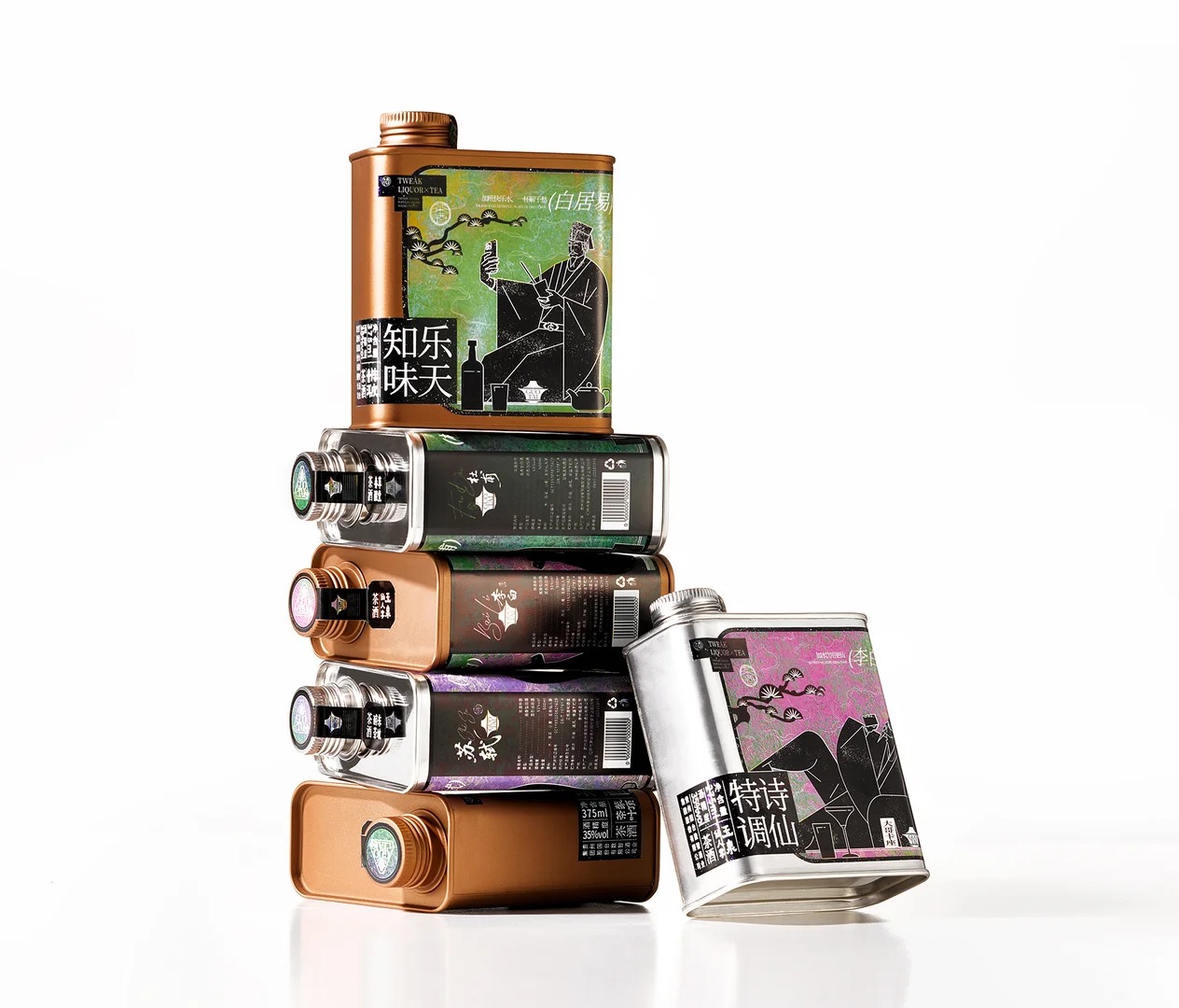 瓶子:可回收马口铁材质,瓶身视觉为四位诗人被赋予现代调酒师形象,李白戴墨镜、杜甫戴腕表、白居易玩自拍、苏轼举杯分享,结合复古画风与现代元素,形成趣味反差。