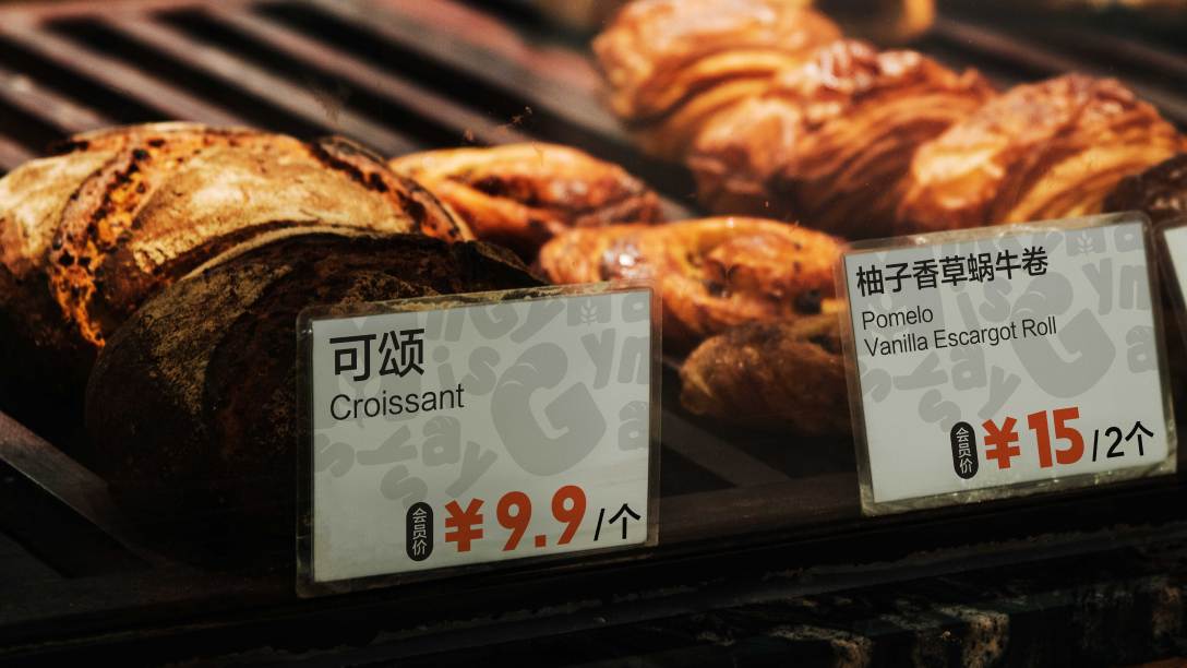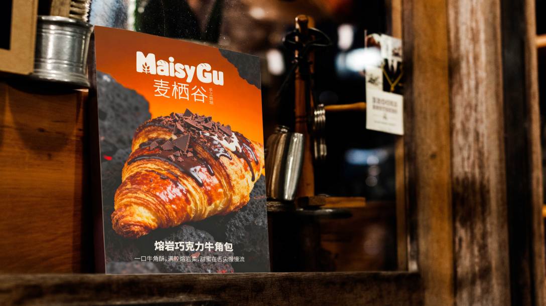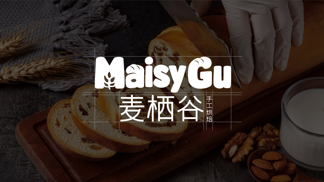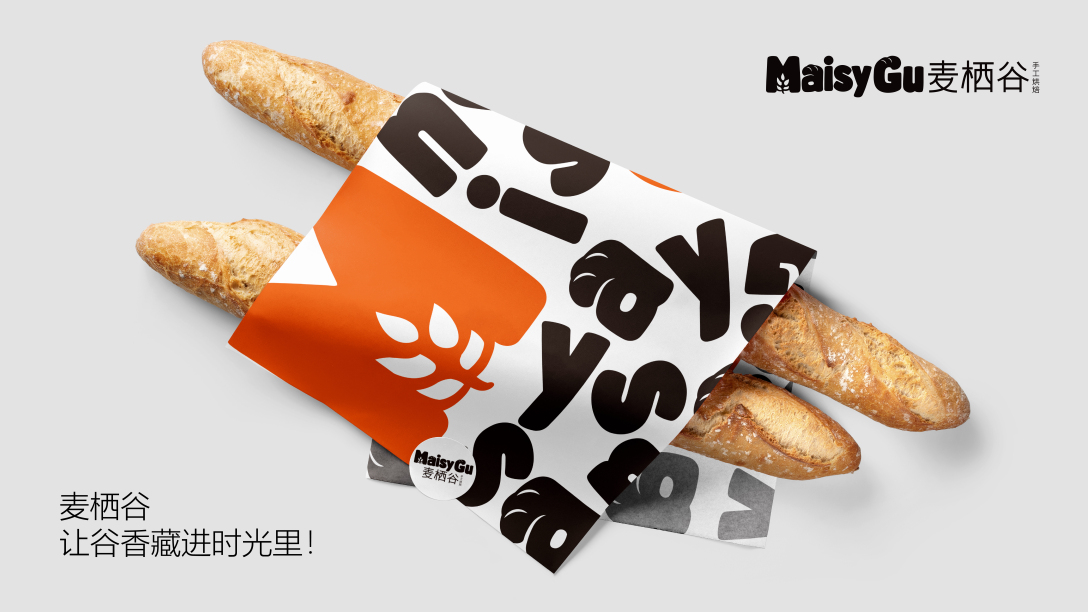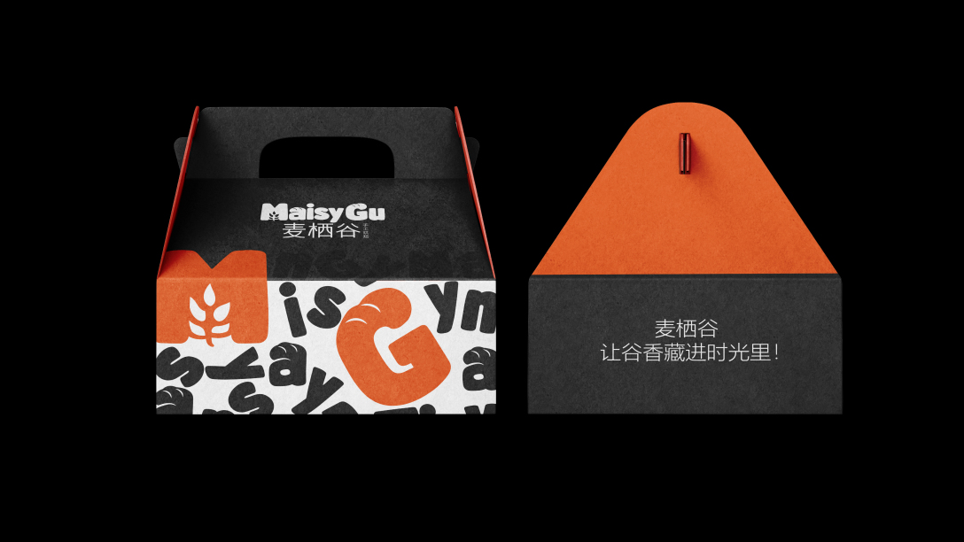 首先是视觉符号的双重寓意:英文Logo中嵌入小麦与面包元素,直观传递以谷物为核心的烘焙属性,凸显天然食材与传统手工工艺,牢牢锚定“手工烘焙”的品类认知;“MaisyGu”字体活泼且富质感,字母在包装、咖啡杯上的灵动排布,打破传统烘焙的沉闷,精准契合年轻人对潮流与个性的追求,实现从“传统烘焙”到“潮流生活方式”的升级。 其次就是通过色彩与材质营造情感共鸣,黑橙撞色极具辨识度:黑色包装凸显面包质感与食欲,橙色点缀名片、包装等,传递温暖活力的品牌性格,让烘焙的“烟火气”与现代时尚感并存。