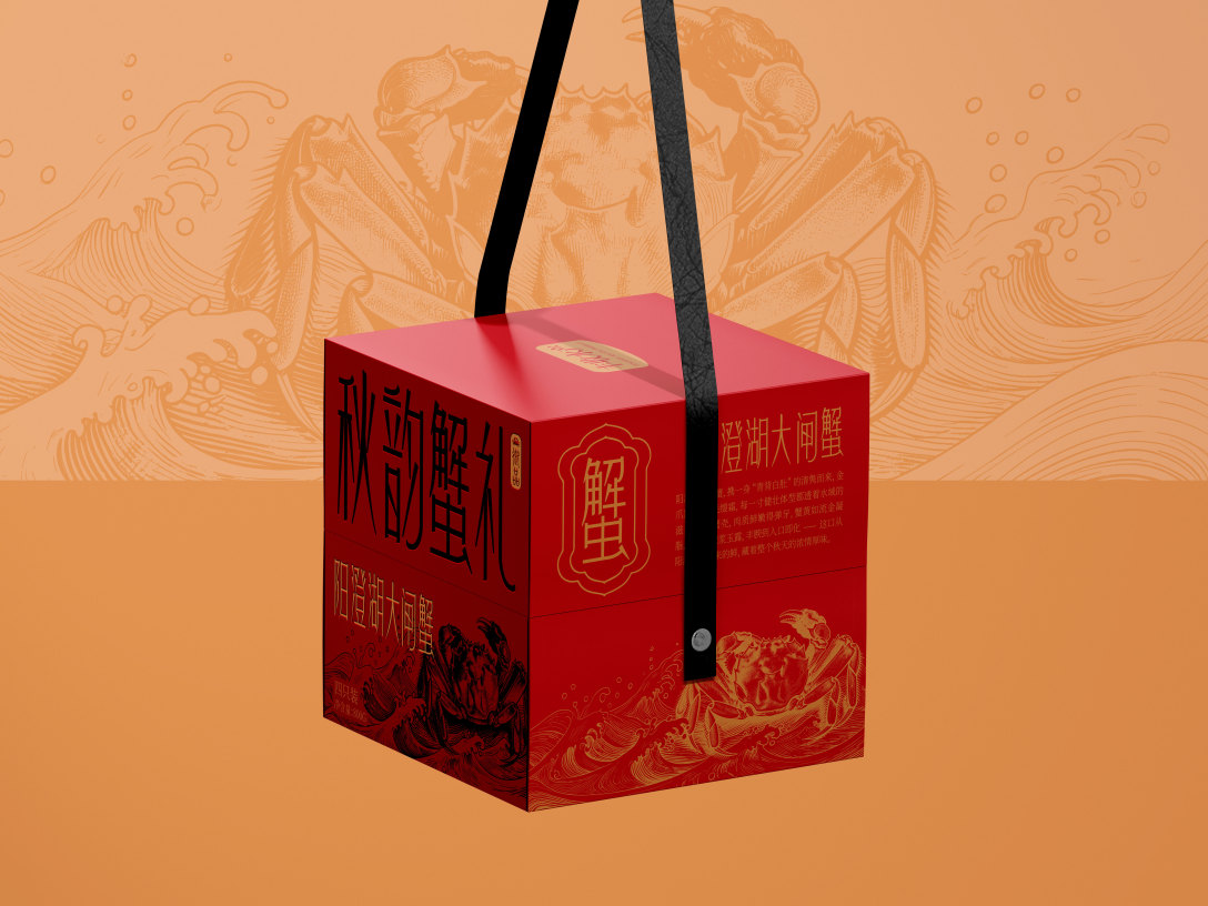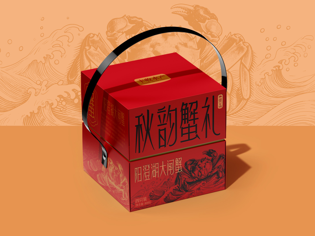 主标题 “秋韵蟹礼” 采用较为大气、舒展的字体,笔画粗细有变化,富有书法的韵味与张力,搭配凹凸印刷工艺既体现出秋季蟹礼的雅致氛围,又能迅速抓住视线,传递出产品作为礼品的高端感。整体以红色为主色调,红色在中国文化里象征着喜庆、吉祥,契合大闸蟹作为节令礼品的属性,能瞬间营造出热烈、隆重的氛围,吸引消费者目光,也传递出对收礼者的美好祝愿。
