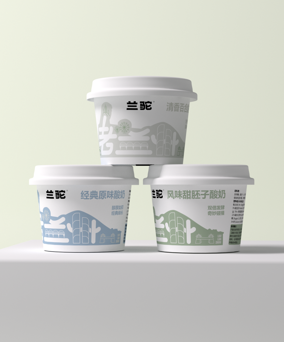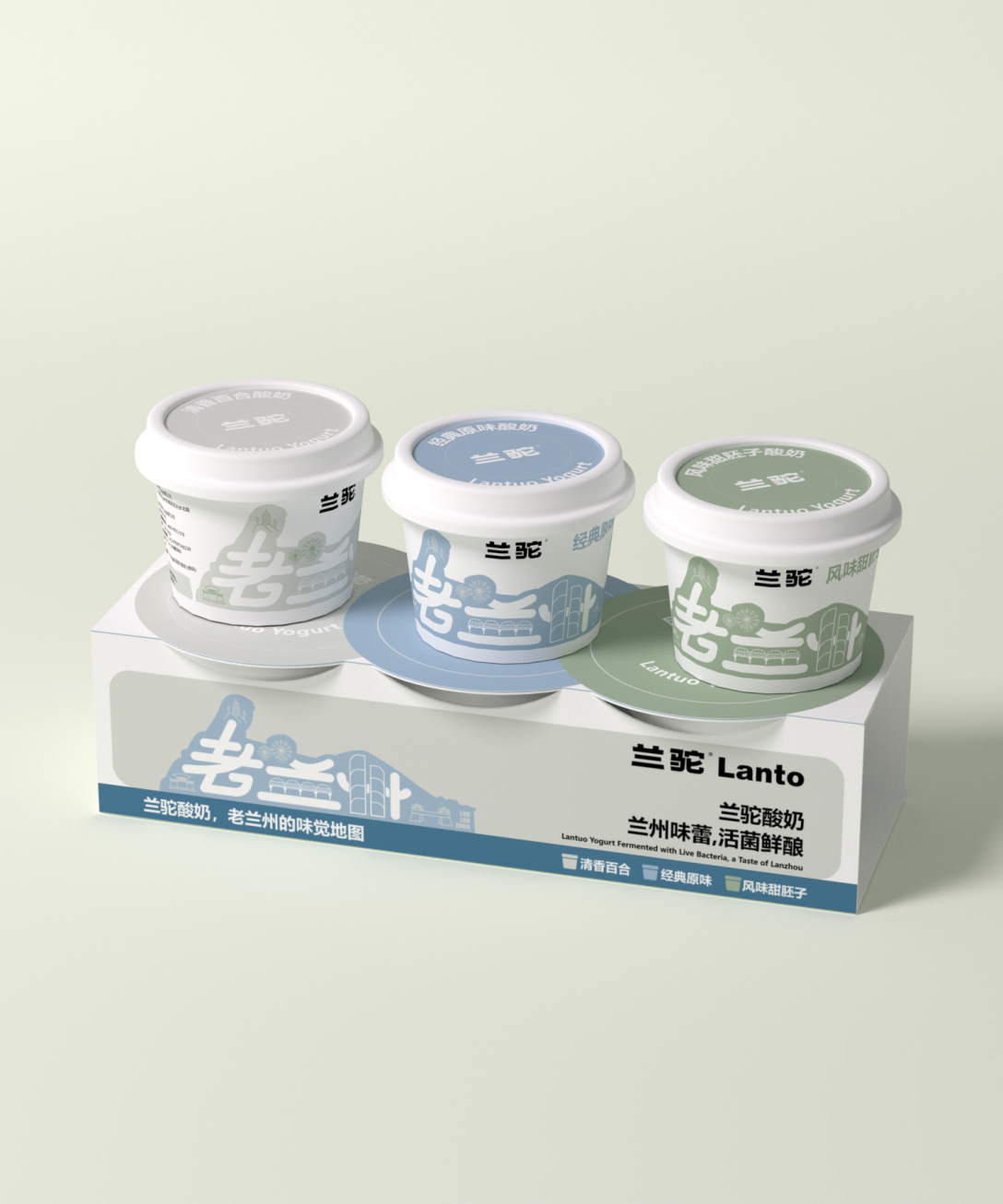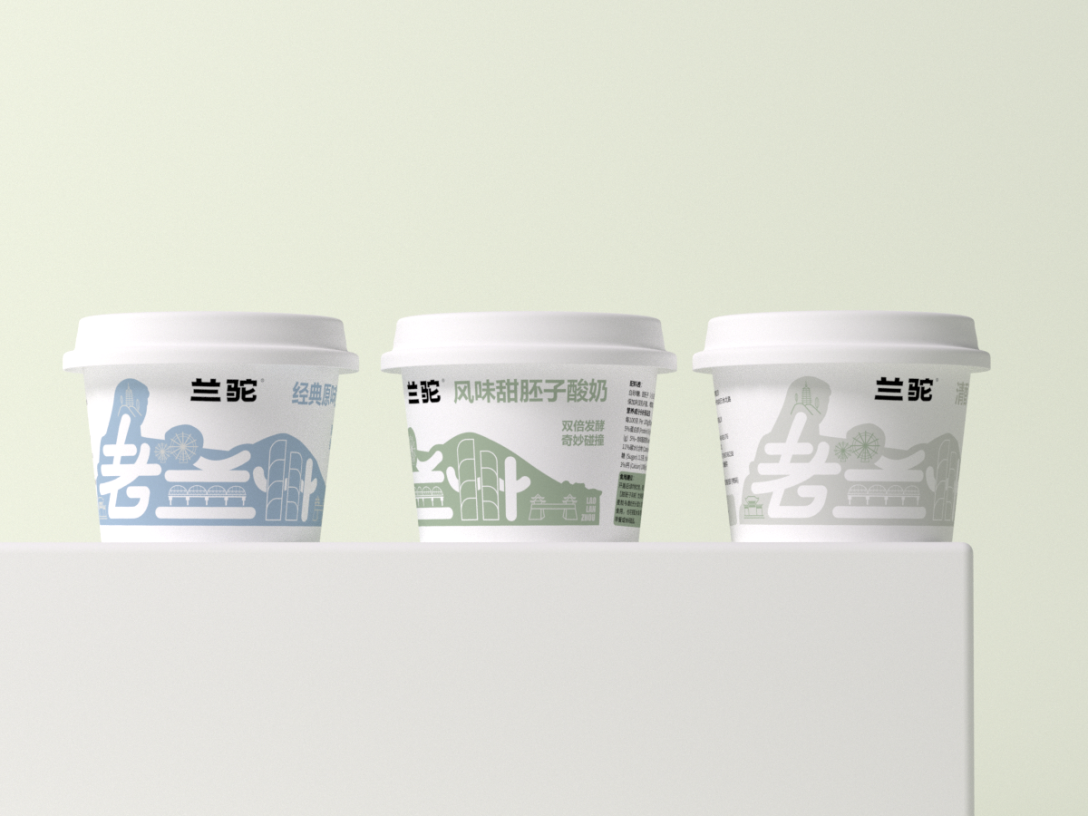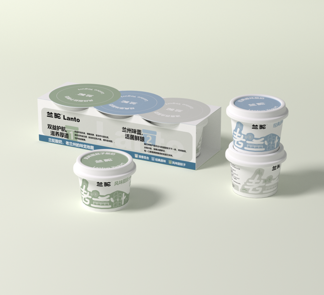 色彩运用上,不同口味对应清新柔和的色调,如清香百合款的浅灰、经典原味款的浅蓝、风味甜胚子款的浅绿,既区分口味,又传递出酸奶的天然、健康质感。