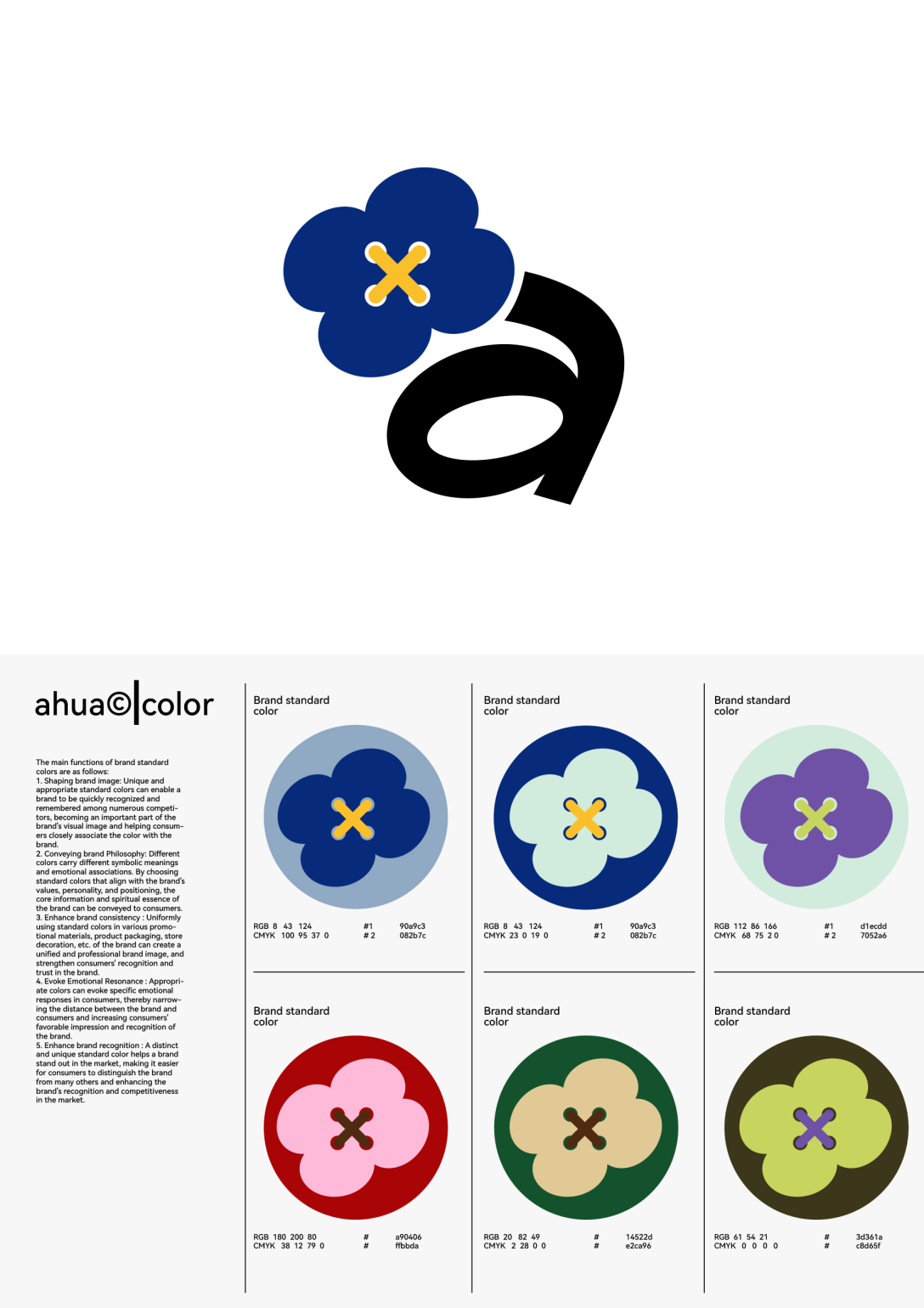 Logo以花为形,花蕊自然转化为一枚纽扣,寓意“发现与连接世界”。纽扣,是连接织物的花朵,我们将品牌符号与纽扣、花朵相融合,让人在纷繁世界中静心感受时间流转,体会织物中蕴含的艺术与人文温度。 通过具有广泛共鸣的符号语言,建立起清晰的国际识别,同时融入轻松趣味的表达,塑造出品牌视觉的核心。色彩上,国美灰与鲜明色系的碰撞成为亮点,其灵感汲取自波普涂鸦艺术,由此提炼出Ahua标志性的色彩视觉基因。