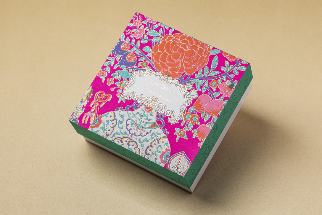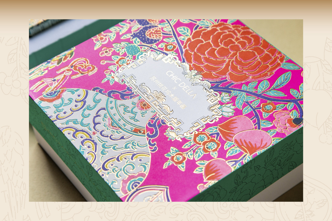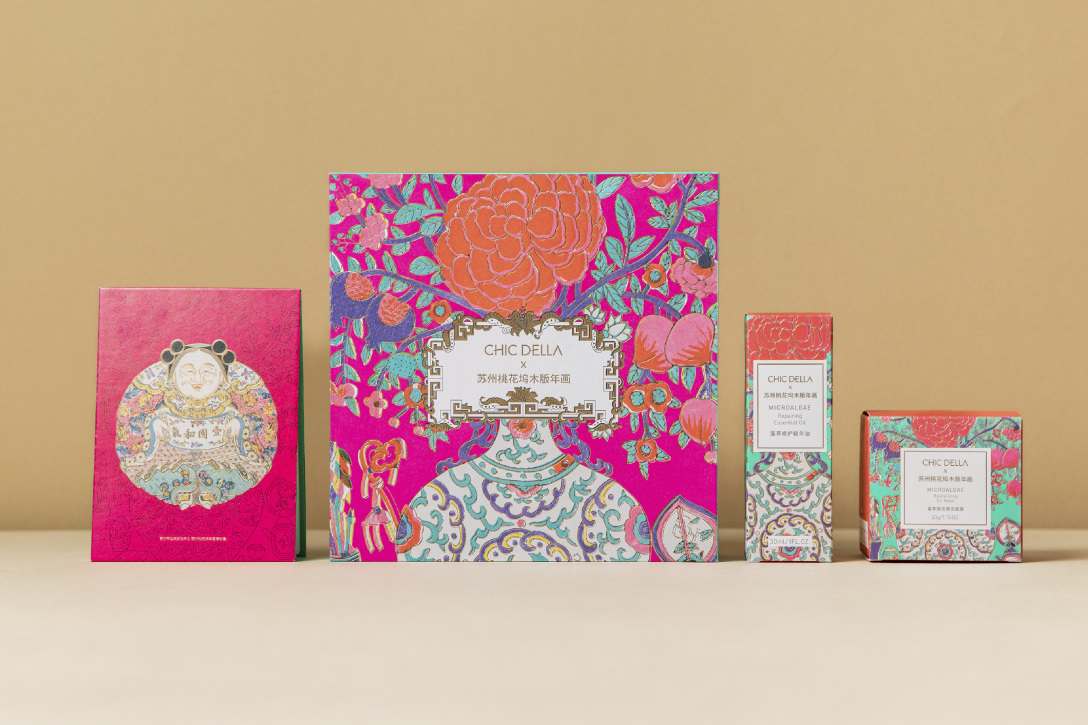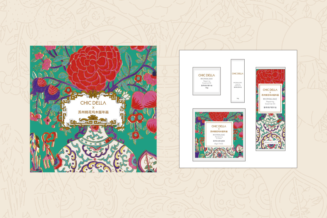 将明代桃花坞木版年画《花开富贵》中牡丹叠翠的盛世图景解构重组,以“古艺新生”为核心理念,通过当代设计语法重构传统吉祥纹样,让百年非遗技艺搭载美妆载体焕发新生。礼盒名“花颜秘典”,既暗合“以花养颜”的东方美学智慧,又构建从视觉到功效的完整文化叙事。