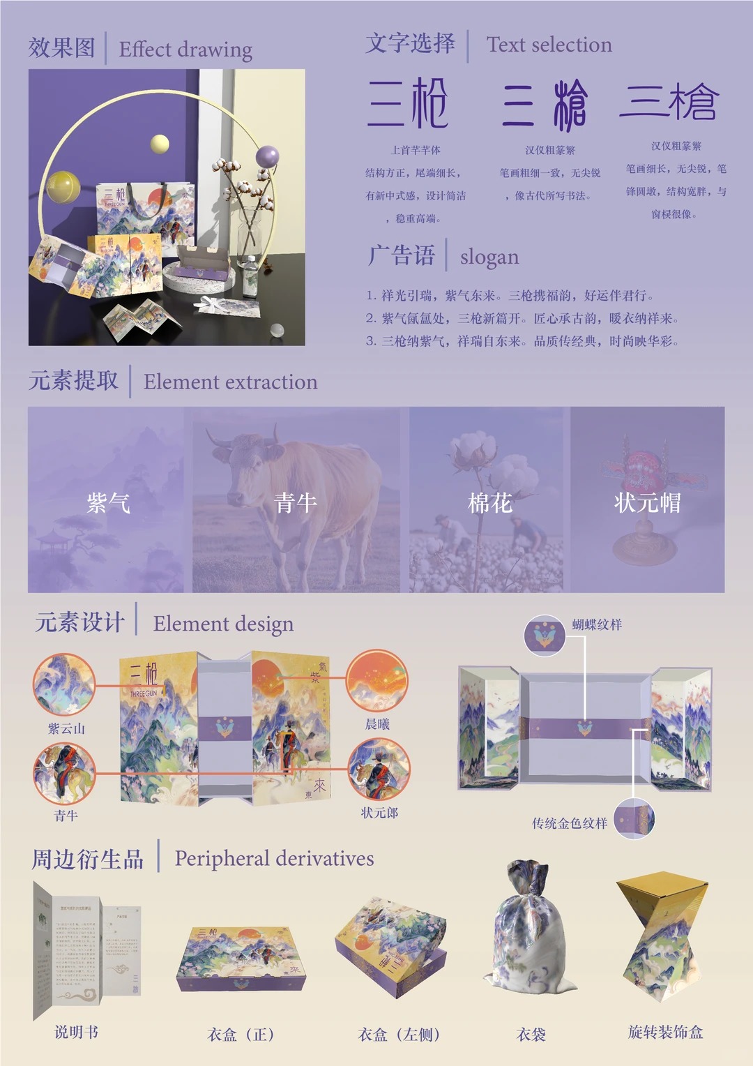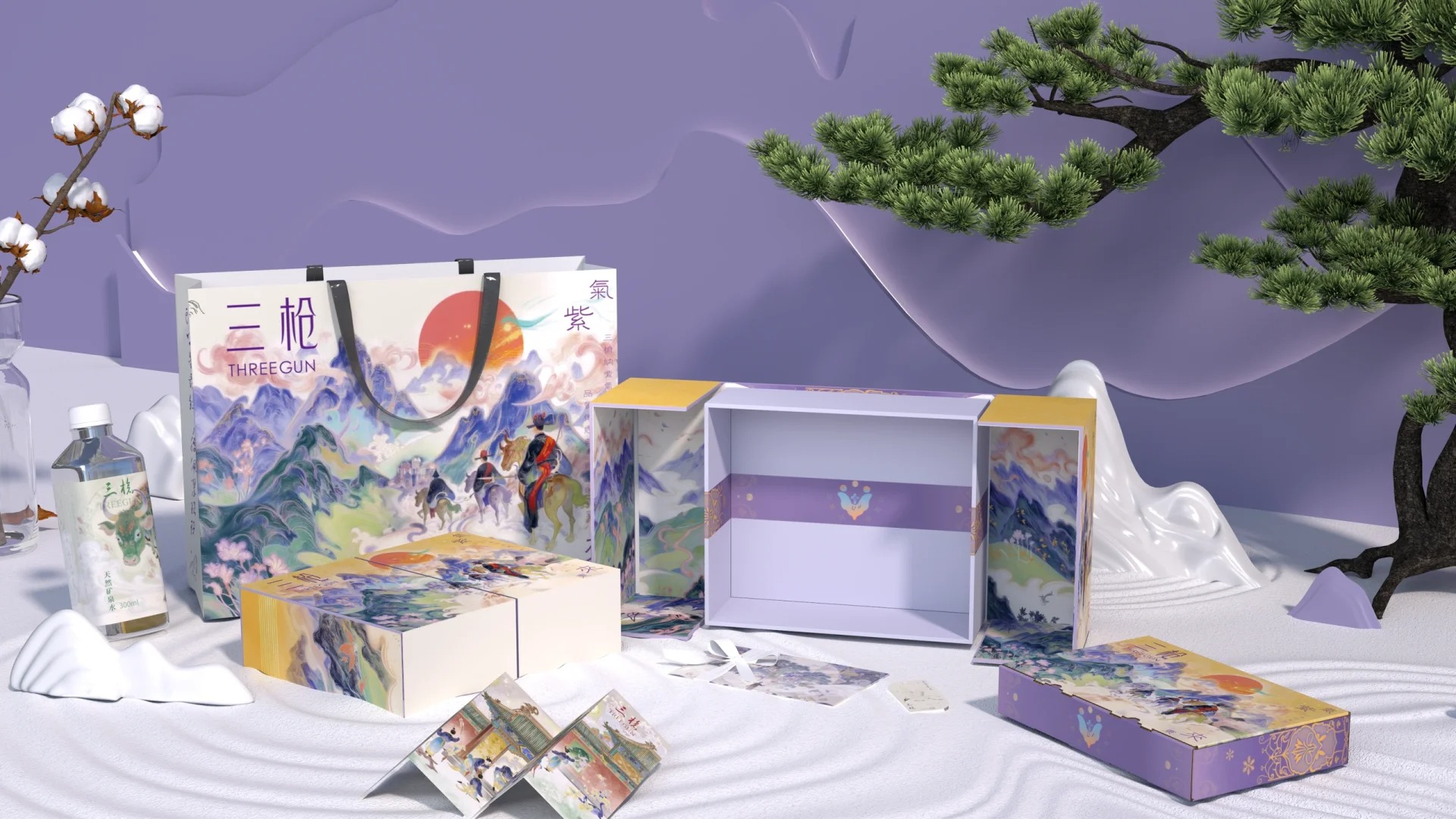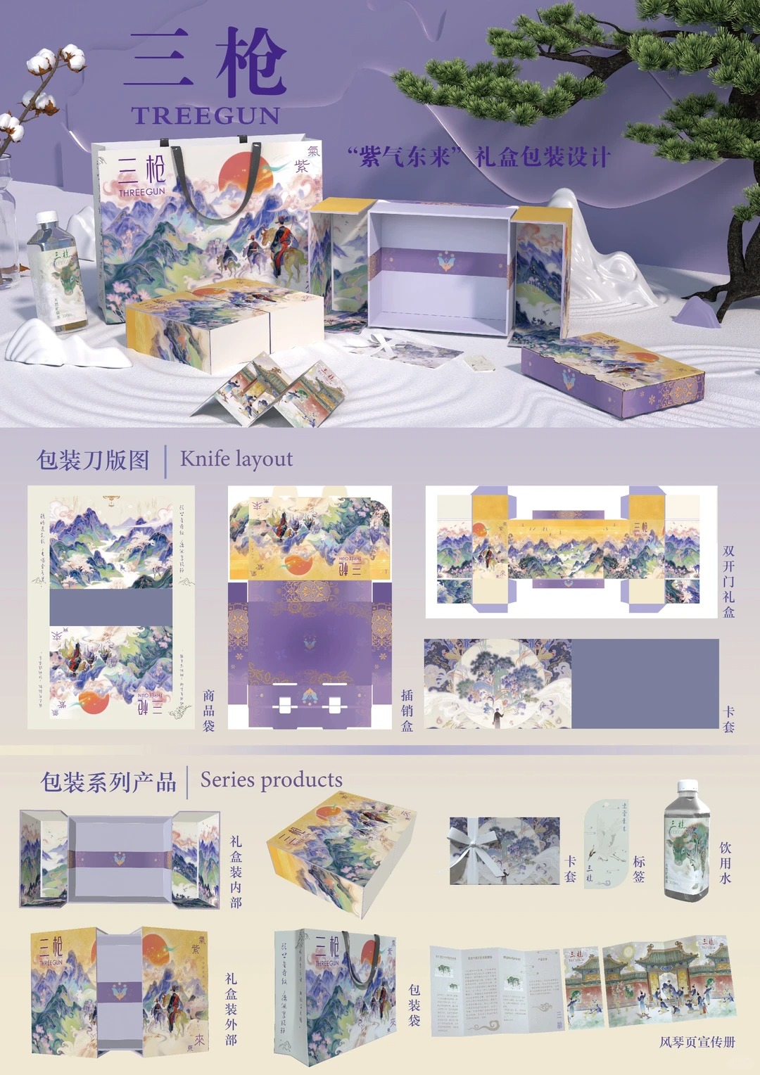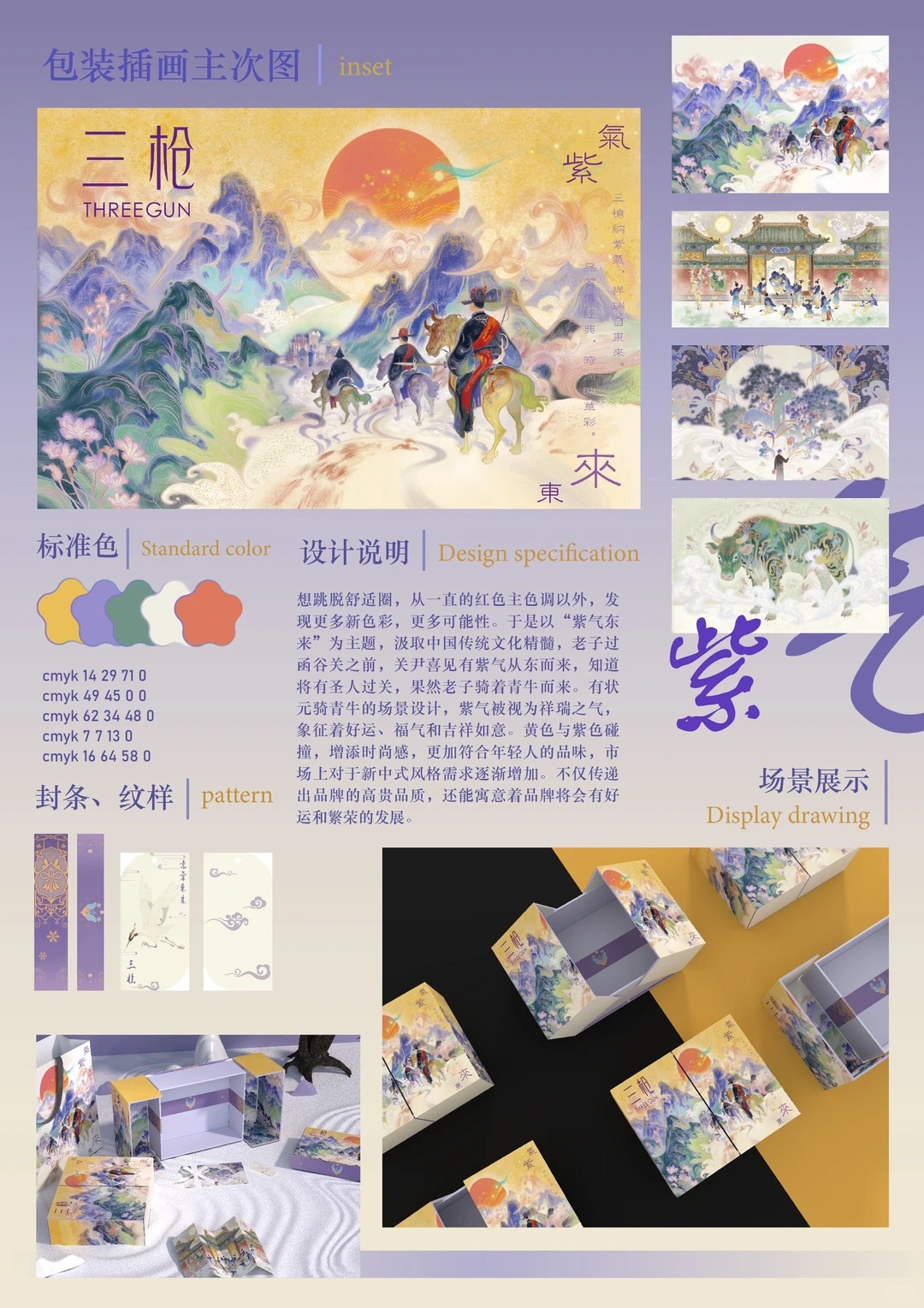 想摆脱沉闷,从一直的红色主色调以外,发现更多色彩,更多可能性。于是,“紫气东来” 为主题,更中国传统纹样以及量子东面谷之美,更具国传统文化精髓,案子过面谷之前,只其看见紫气从东而来,知道将有圣人过,果然老子骑着青牛而来。之状无有人的场景设计,紫气被誉为样瑞之气,象征着好运、福气和吉样如意。黄色与紫色撞色,既时尚感,更加符合年轻人的审美,市场上对于新中式风格需求逐渐增加。不仅传递出品牌的高中式风格,还能寓意着品牌将会有好运和繁荣的发展。