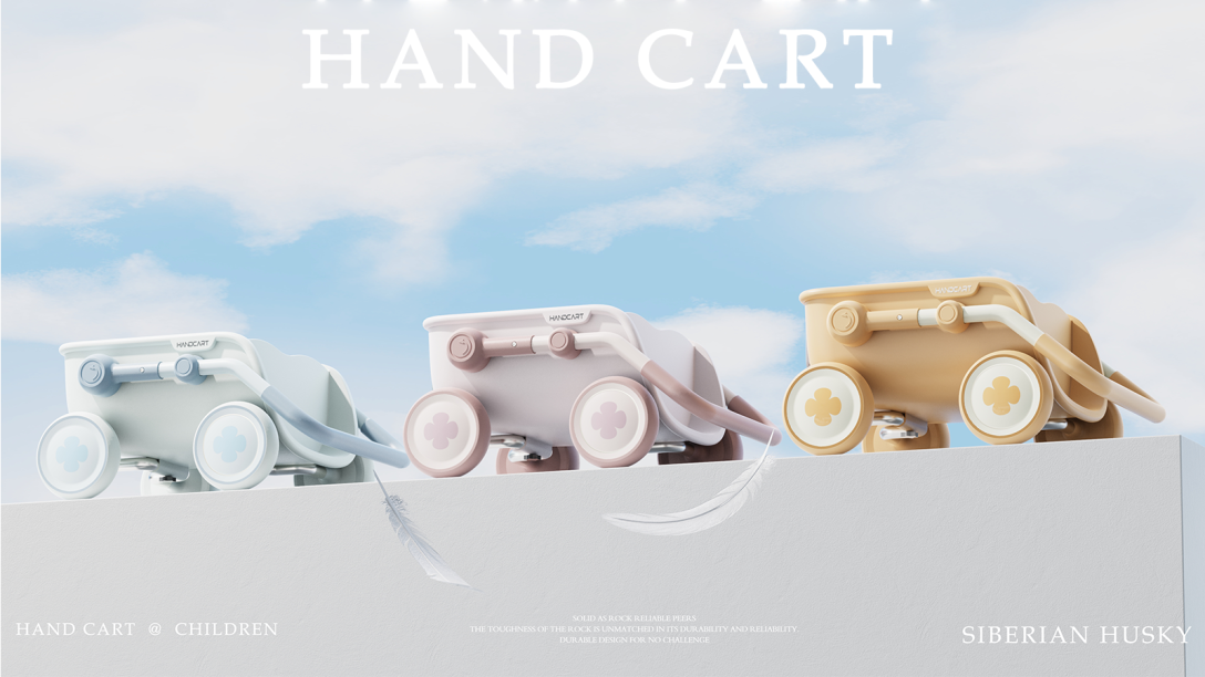 设计说明:本手推车设计成功塑造了简约、温暖、高端且充满爱意的整体风格,整体造型摒弃了繁复的线条,运用圆润流畅的曲面进行一体化设计,居中的构图方式凸显了产品的完整性与雕塑感。车身上的白色装饰部件与主体色形成优雅对比,车轮中央的金色四叶草图案是设计的亮点所在,是一款融合了现代美学与温馨童趣的高端儿童手推车。
