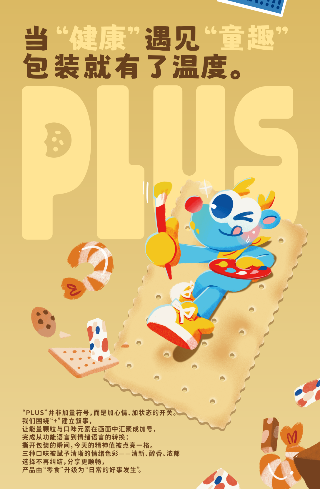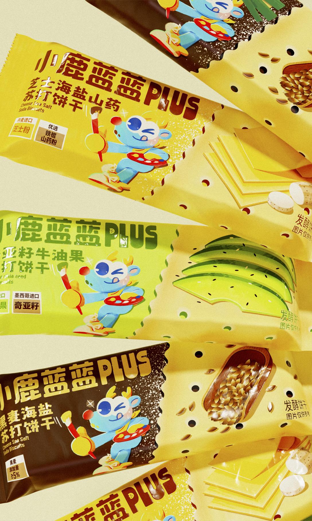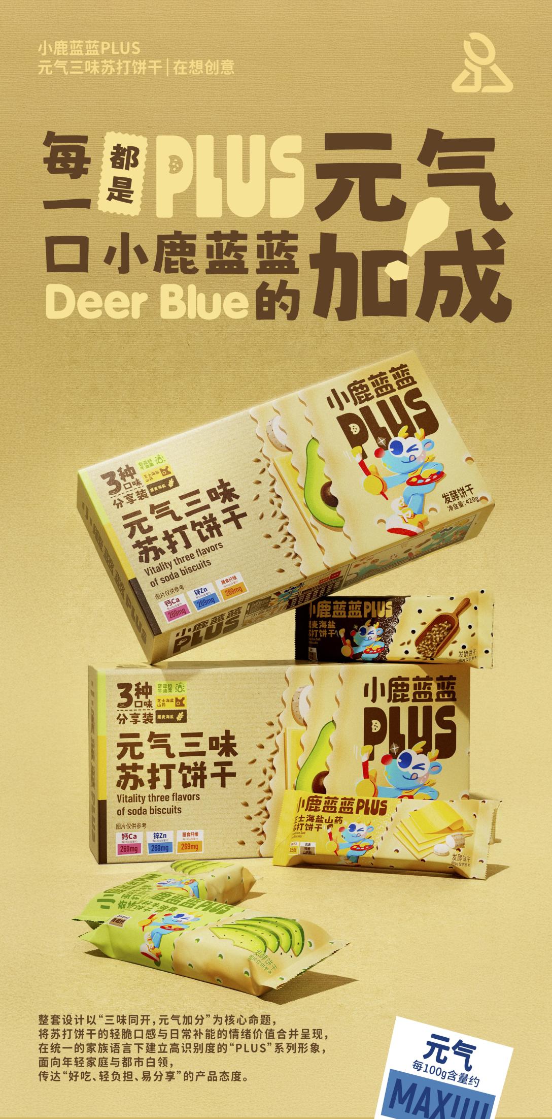 整套设计以“三味同开,元气加分”为核心命题将苏打饼干的轻脆口感与日常补能的情绪价值合并呈现,在统一的家族语言下建立高识别度的“PLUS”系列形象,面向年轻家庭与都市白领,传达“好吃、轻负担、易分享”的产品态度。