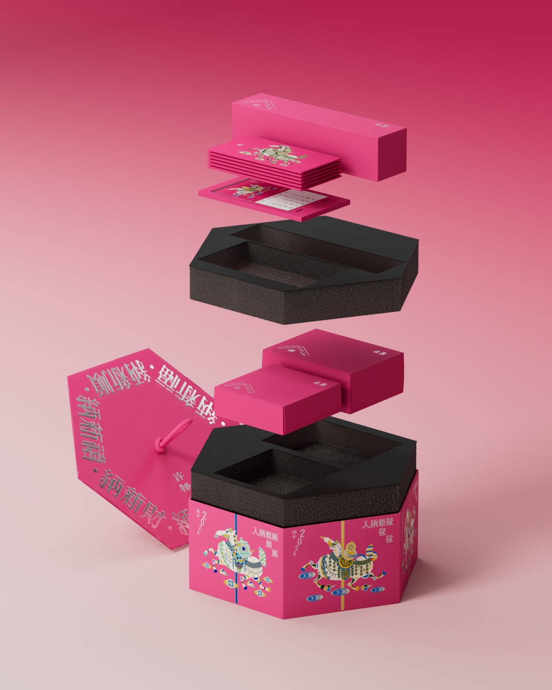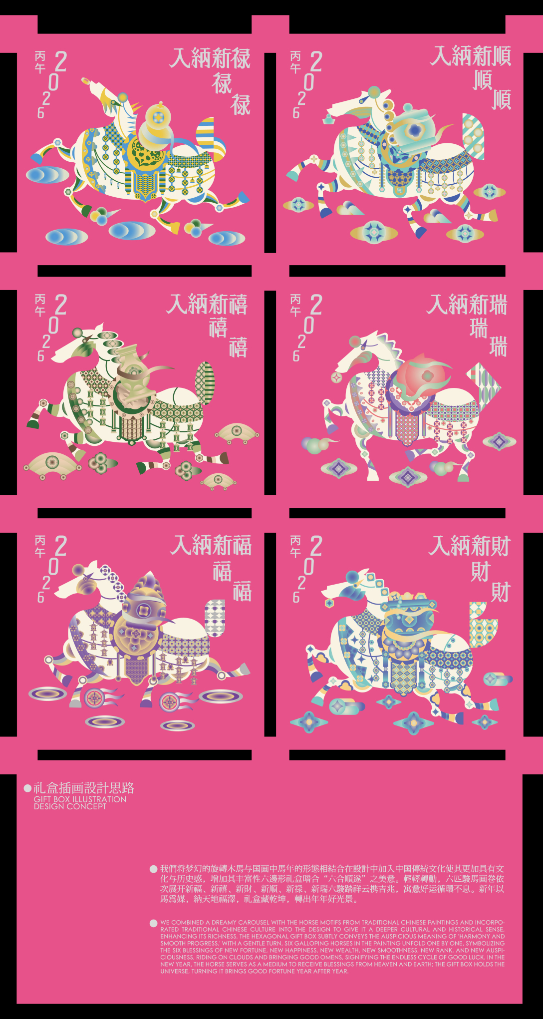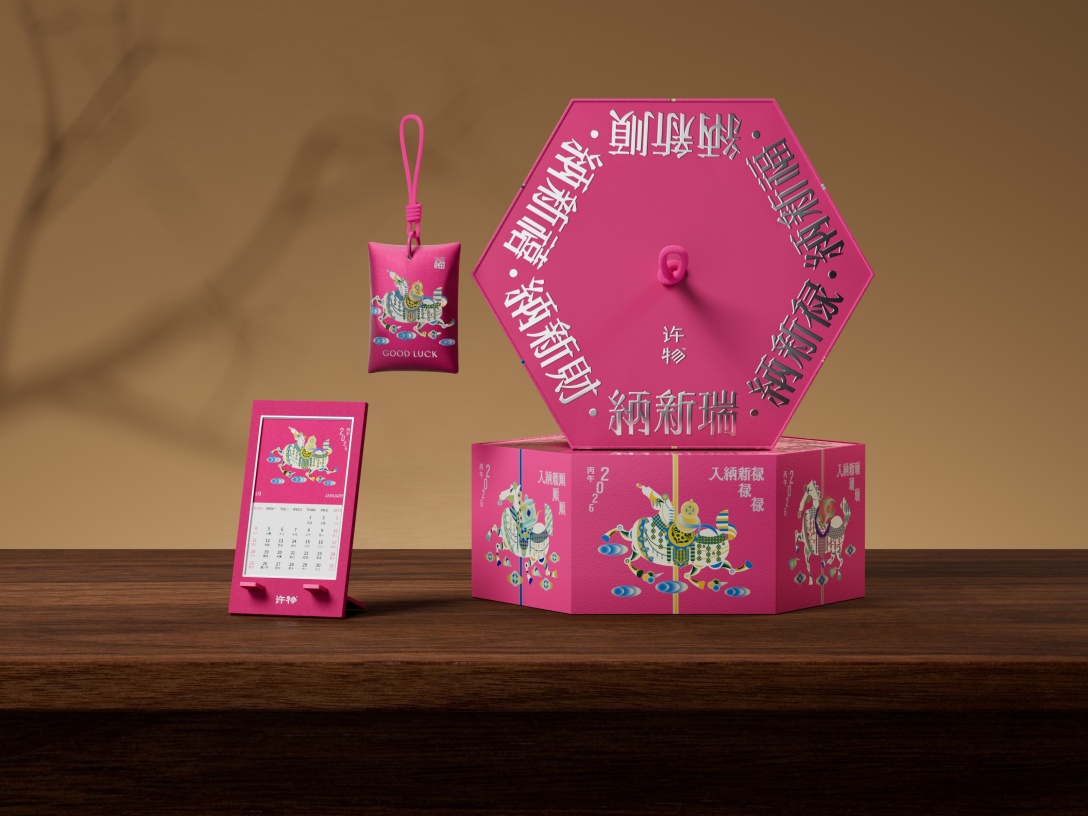 灵感源自梦幻旋转木马,及中国传统纹样,六边形礼盒暗合“六合顺遂”之美意。轻轻转动,六匹骏马画卷依次展开新福、新禧、新财、新顺、新禄、新瑞六骏踏祥云携吉兆,寓意好运循环不息。新年以马为媒,纳天地福泽,礼盒藏乾坤,转出年年好光景