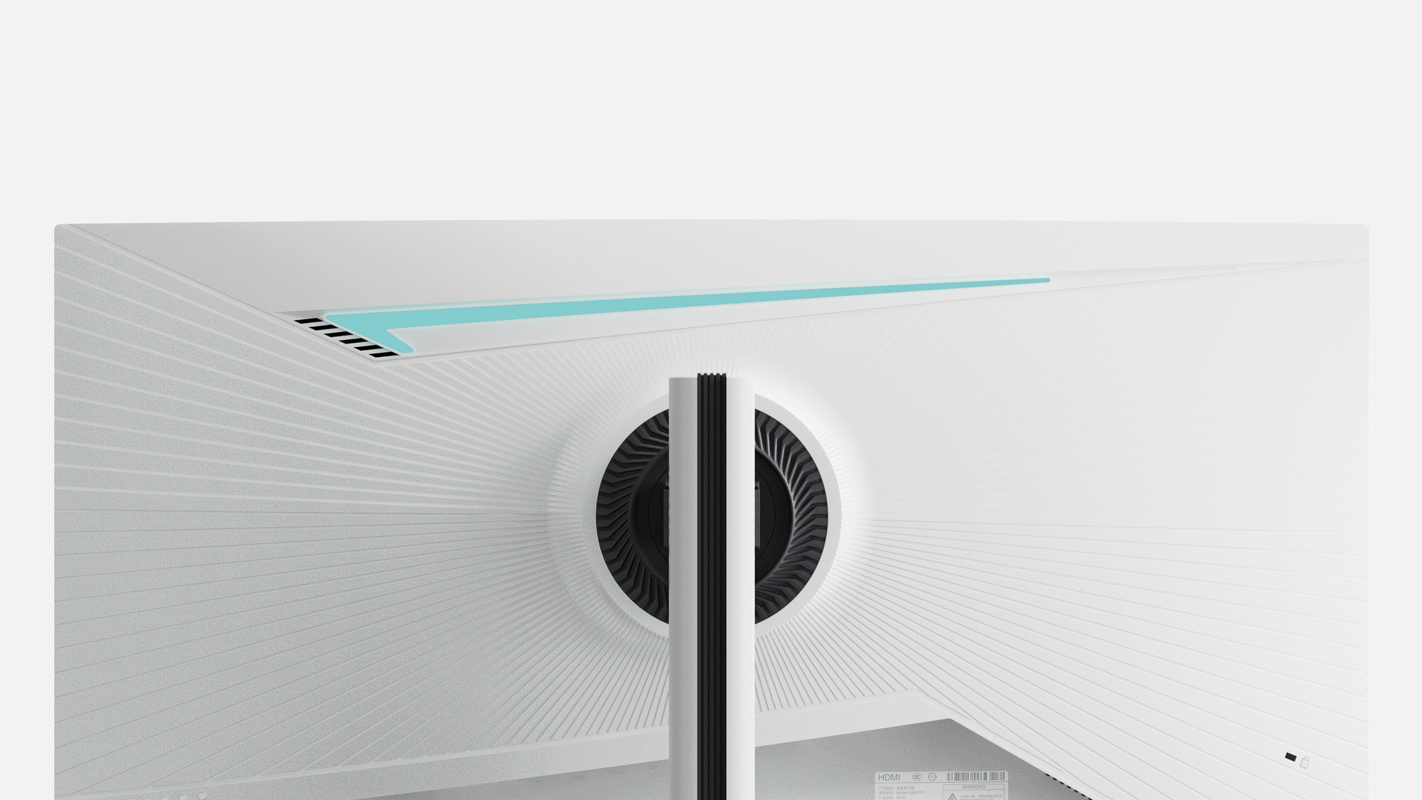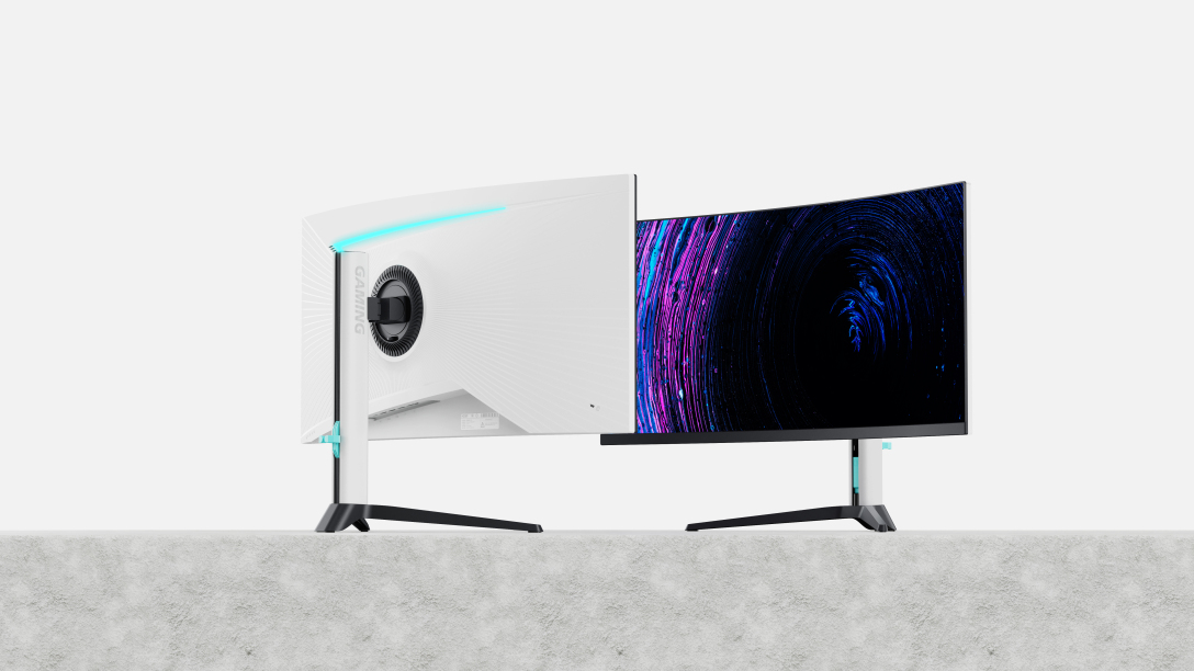 设计概述: 该显示器运用不对称美学:背部辐射纹理非均衡延展,打破视觉惯性,呈现动态生长感;顶部不对称光带勾勒独特轮廓,让光线超越功能点缀,成为融合科技与艺术的设计语言。
